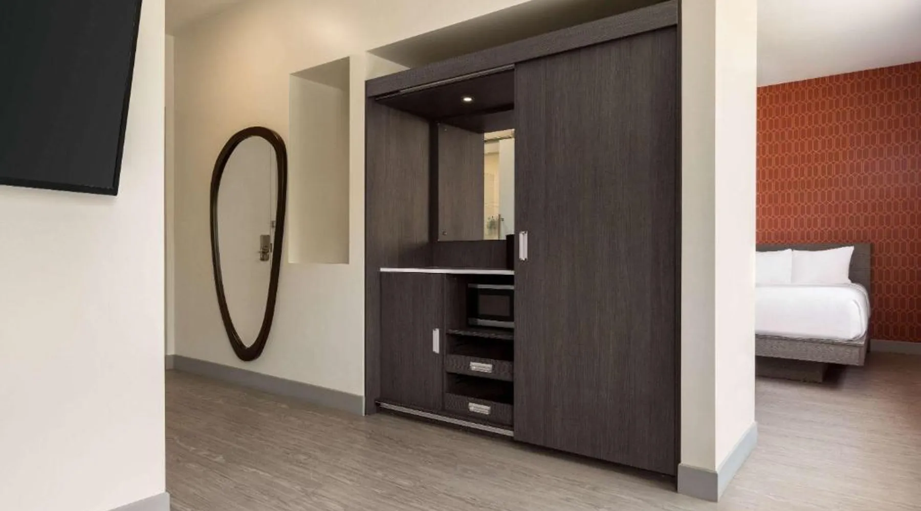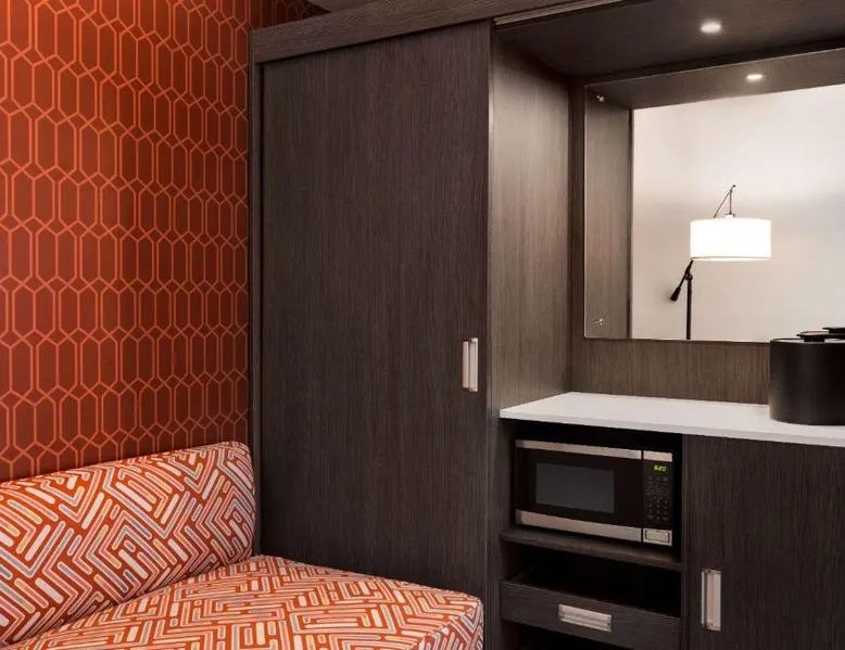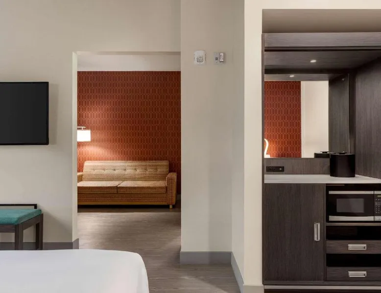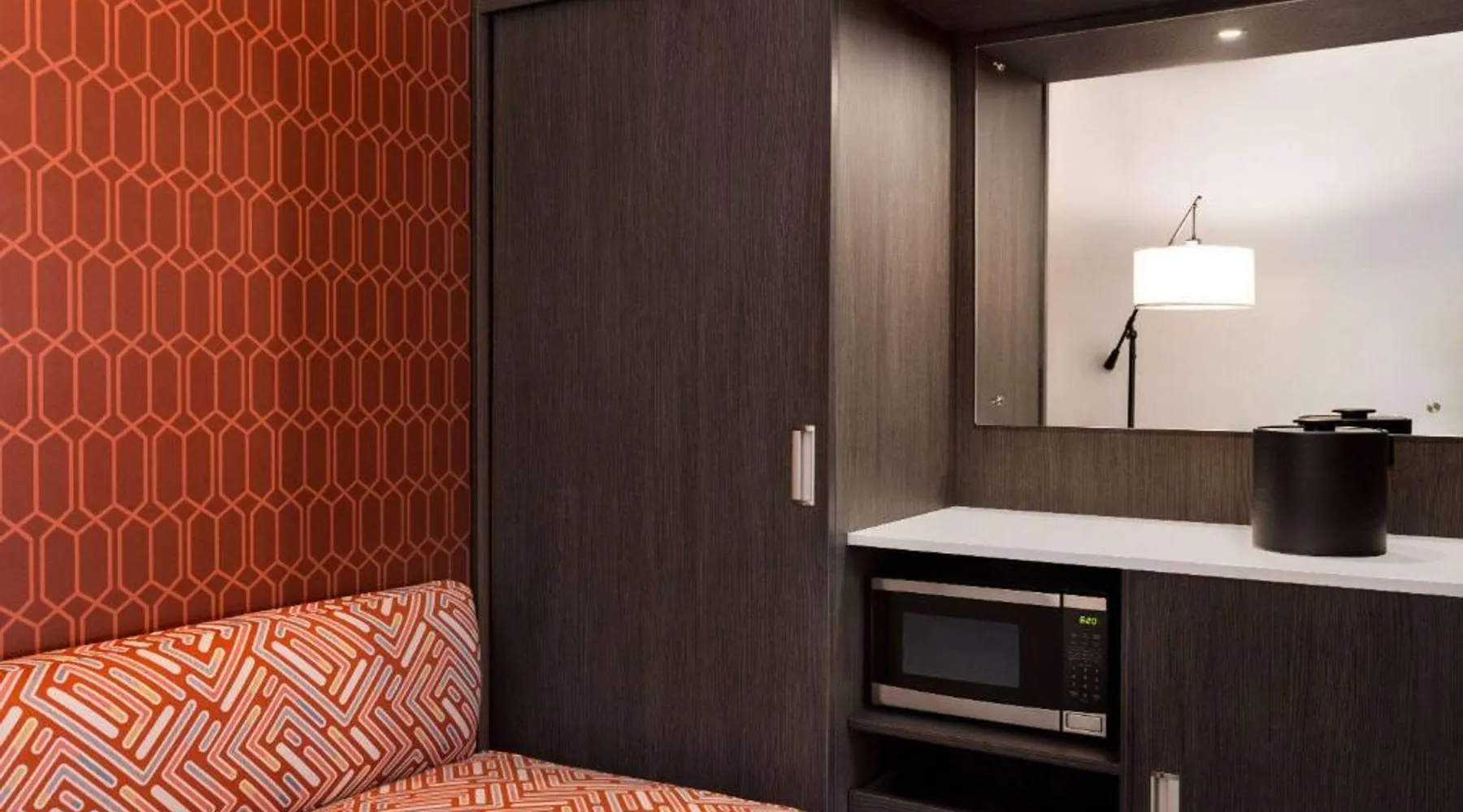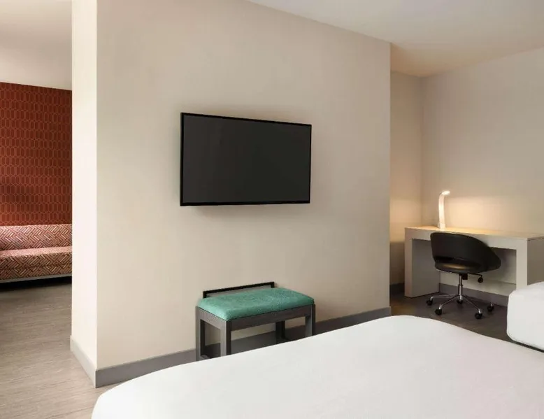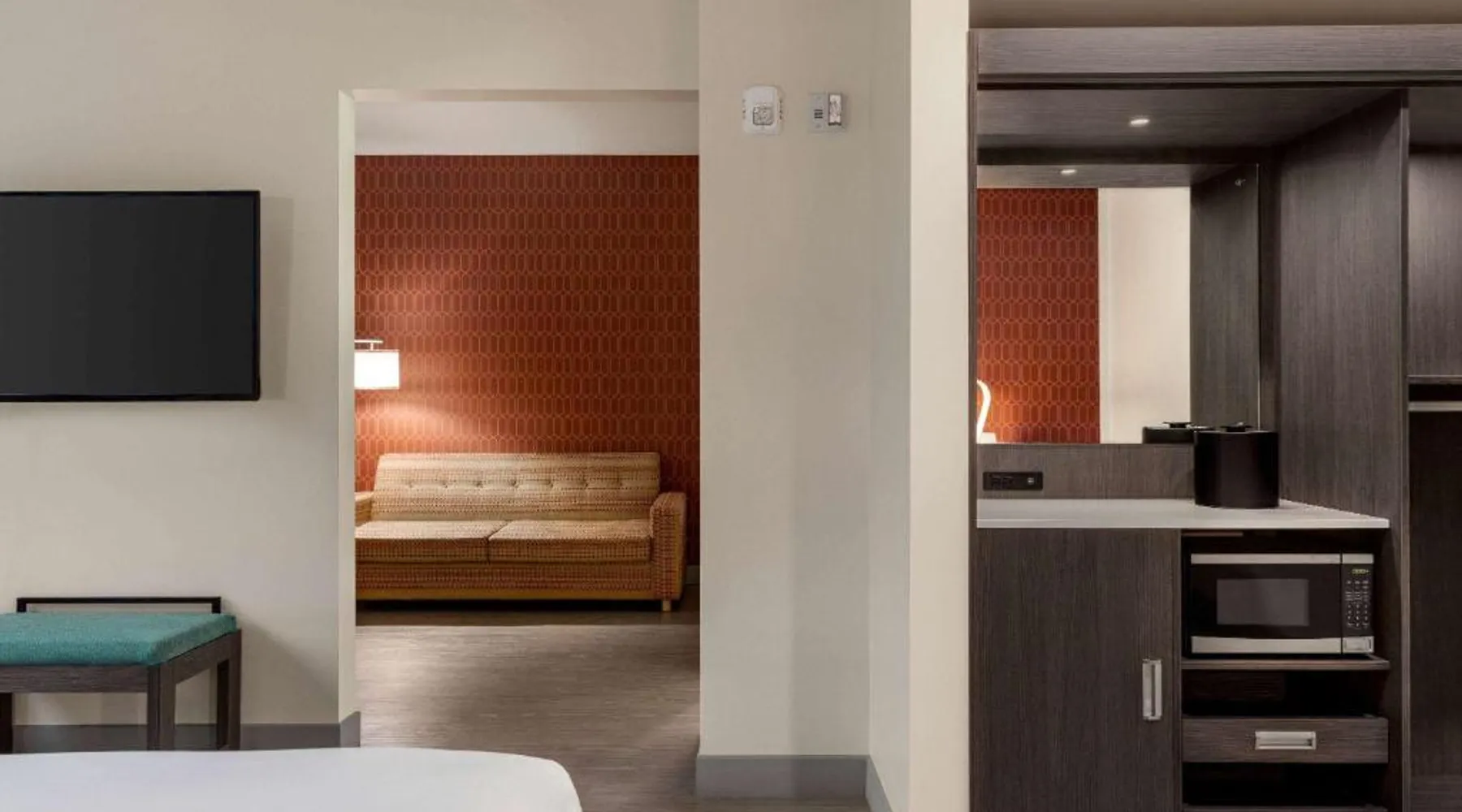 Comfortable Accommodations: The Orbit Hotel, Trademark Collection by Wyndham in Fairview Park offers air-conditioned rooms with private bathrooms, sofa beds, work desks, and parquet floors. Each room includes a TV and hairdryer. Convenient Facilities: Guests benefit from a free airport shuttle service, elevator, 24-hour front desk, and minimarket. The hotel provides an American buffet breakfast each morning. Prime Location: Located 3281 feet from Cleveland Hopkins International Airport, the hotel is less than 0.6 mi from Nasa Glenn Research Center. Nearby attractions include Westfield Great Northern Shopping Center (3.1 mi) and Cleveland Browns Stadium (12 mi). Guest Satisfaction: Highly rated for its connectivity to the airport, convenient location, and shuttle service. The suite offers air conditioning, a sofa, as well as a private bathroom boasting a shower and a hairdryer. This suite features parquet floors and a TV.