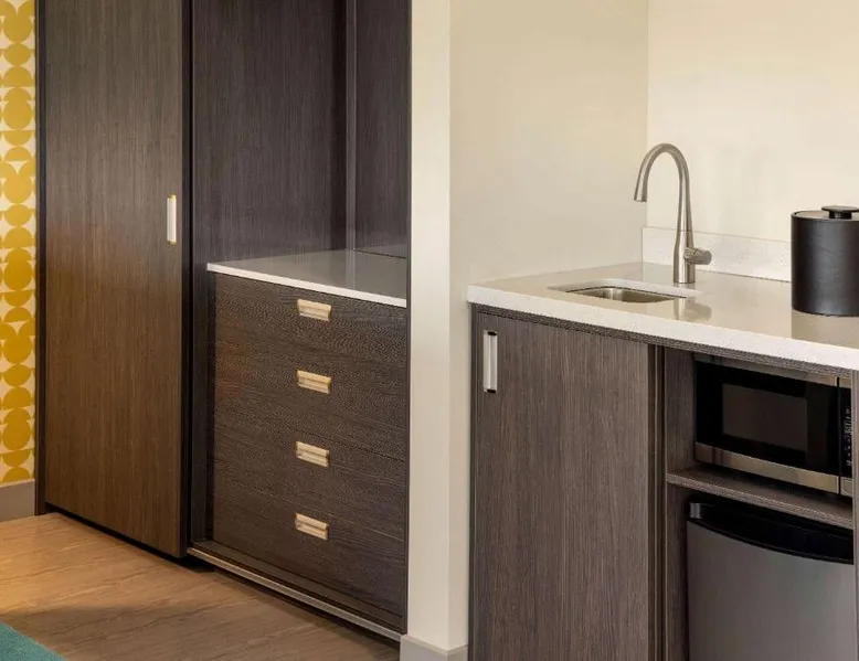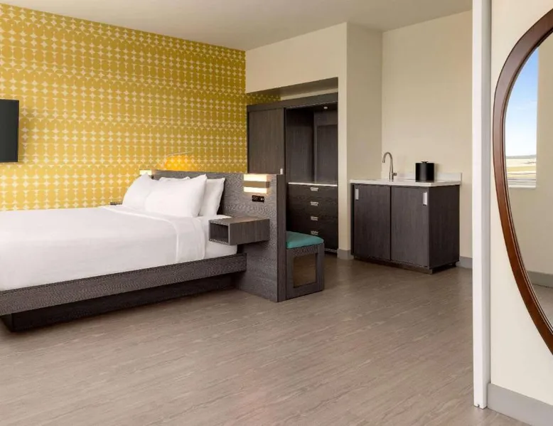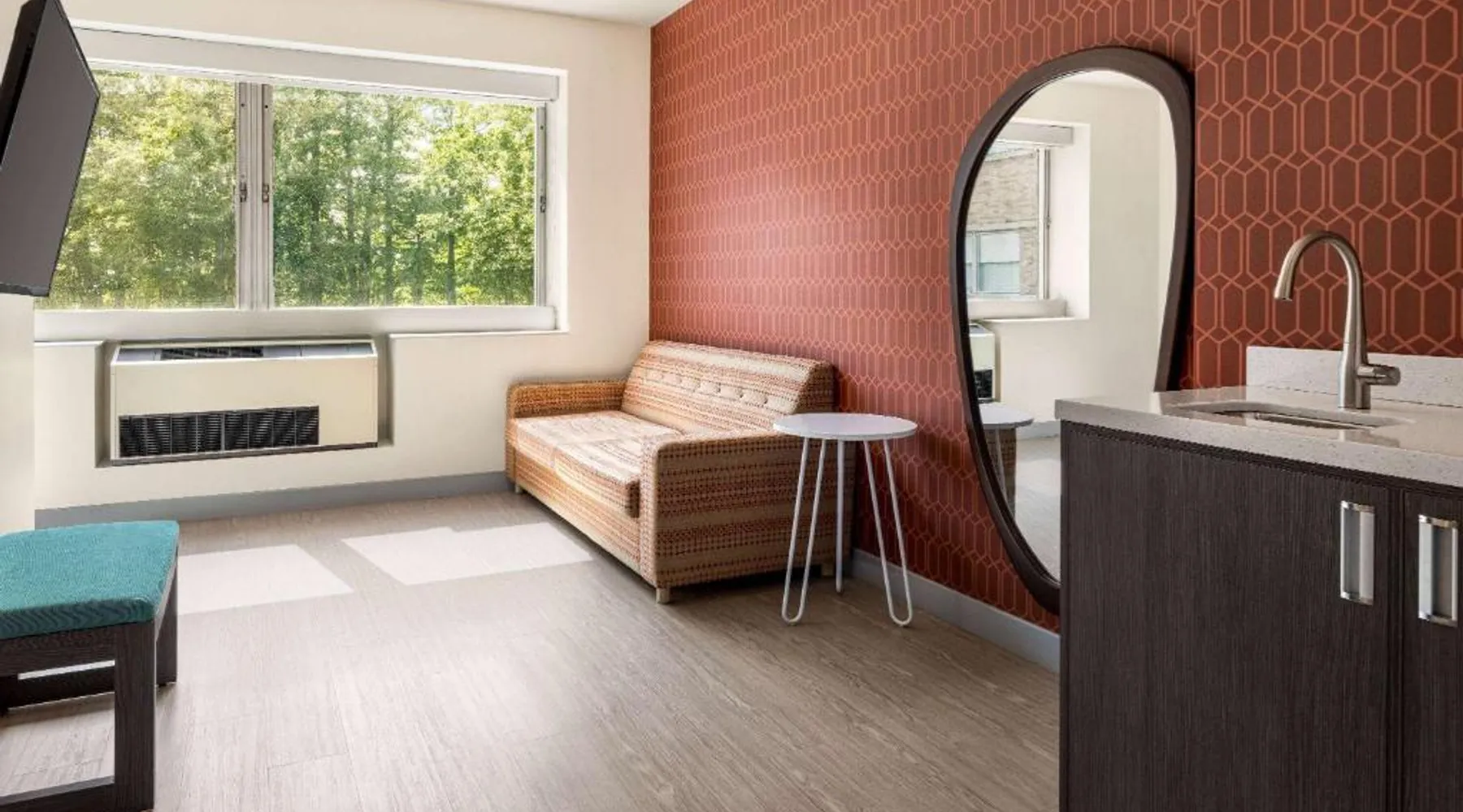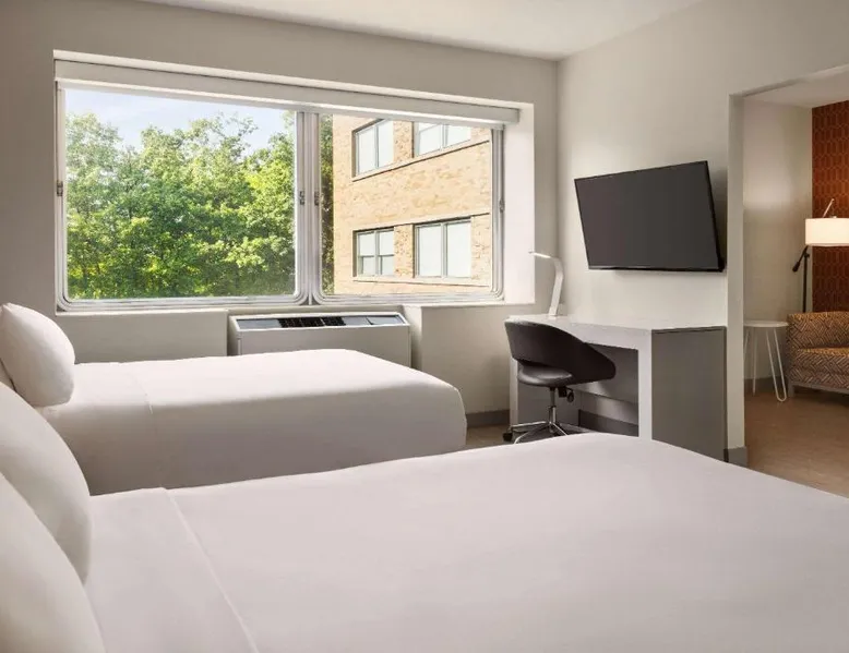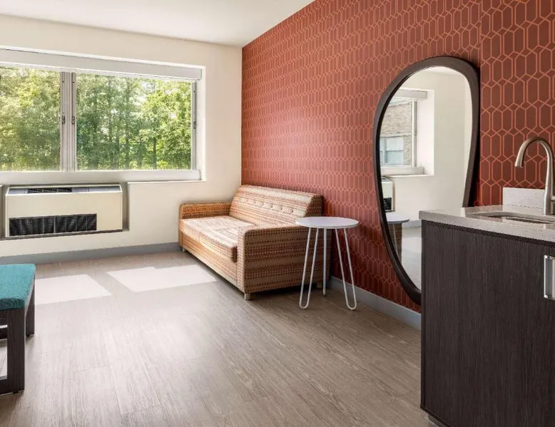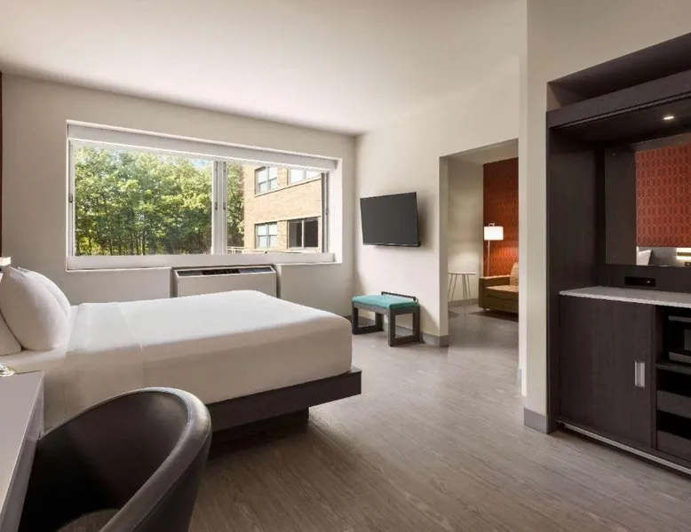 Comfortable Accommodations: The Orbit Hotel, Trademark Collection by Wyndham in Fairview Park offers air-conditioned rooms with private bathrooms, sofa beds, work desks, and parquet floors. Each room includes a TV and hairdryer. Convenient Facilities: Guests benefit from a free airport shuttle service, elevator, 24-hour front desk, and minimarket. The hotel provides an American buffet breakfast each morning. Prime Location: Located 3281 feet from Cleveland Hopkins International Airport, the hotel is less than 0.6 mi from Nasa Glenn Research Center. Nearby attractions include Westfield Great Northern Shopping Center (3.1 mi) and Cleveland Browns Stadium (12 mi). Guest Satisfaction: Highly rated for its connectivity to the airport, convenient location, and shuttle service. The suite offers air conditioning, a sofa, as well as a private bathroom boasting a shower and a hairdryer. This suite features parquet floors and a TV.