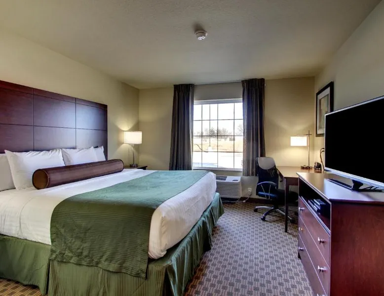 Comfortable Accommodations: Cobblestone Inn & Suites - Harvey in Harvey offers family rooms with air-conditioning, free WiFi, and amenities such as a work desk, refrigerator, and TV. Each room includes a tea and coffee maker, hairdryer, and free toiletries. Leisure Facilities: Guests can enjoy a private beach area, fitness center, bar, and lounge. Additional facilities include a minimarket, business area, and free on-site private parking. Dining Options: A continental buffet breakfast is served with warm dishes, fresh pastries, fruits, and juice. Location and Activities: Located 73 mi from Minot International Airport, the hotel provides access to fishing and hiking. Featuring a 40-inch flat-screen TV, this room also offers a microwave and a fridge.