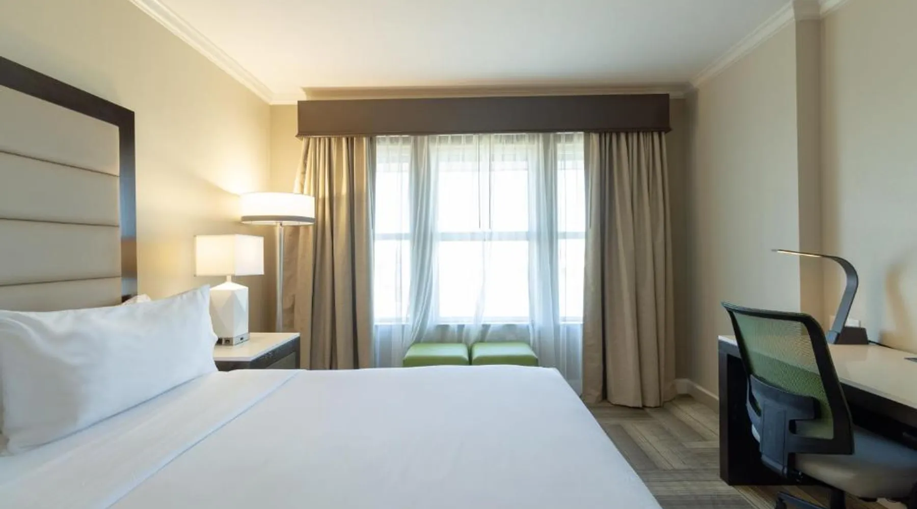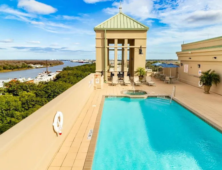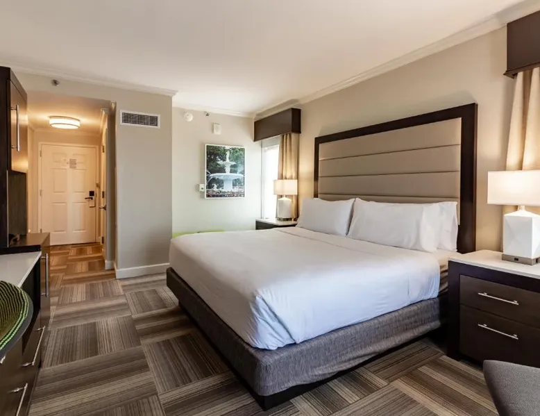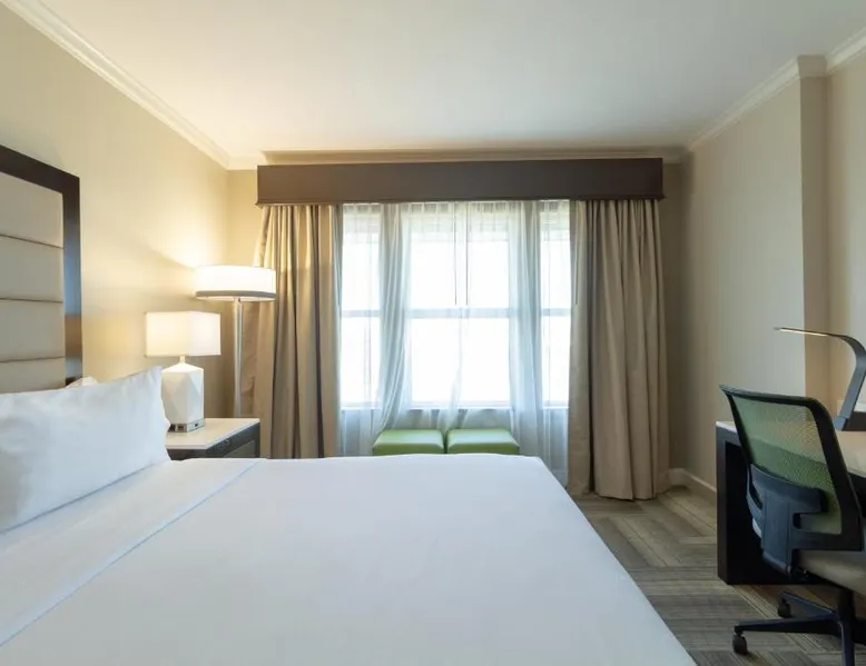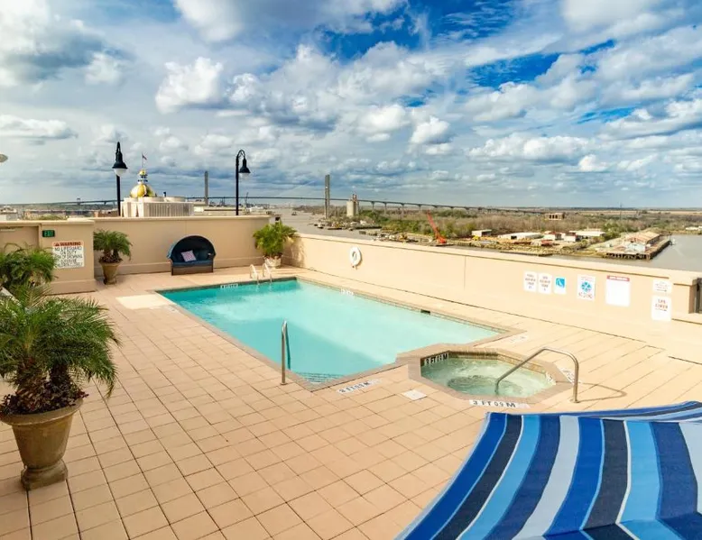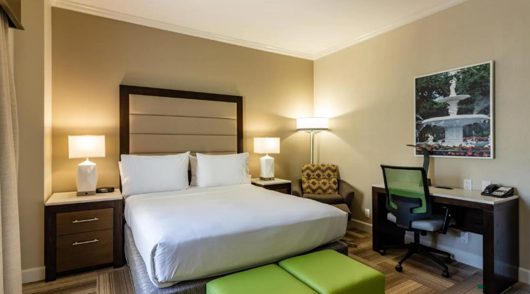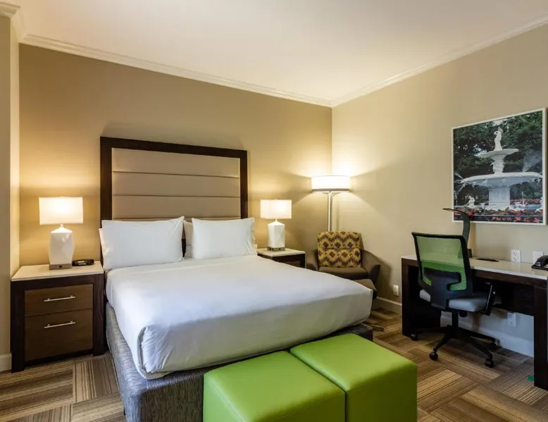In the heart of Savannah, overlooking the Savannah River, this hotel is near popular attractions and features a free daily breakfast buffet and a rooftop swimming pool with city views. Rooms at the Holiday Inn Express Savannah include a microwave, refrigerator, desk and a flat-screen TV with cable channels. Guests have access to the on-site fitness center and business center. Within walking distance of the hotel is the city's historic River Street, featuring shops, restaurants and entertainment options. The famous Bonaventure Cemetery is also only a short drive away. This room includes a 32-inch flat-screen TV with premium cable channels and a spacious bathroom with a walk-in glass shower. A microwave, small refrigerator and Keurig coffee maker are also provided.