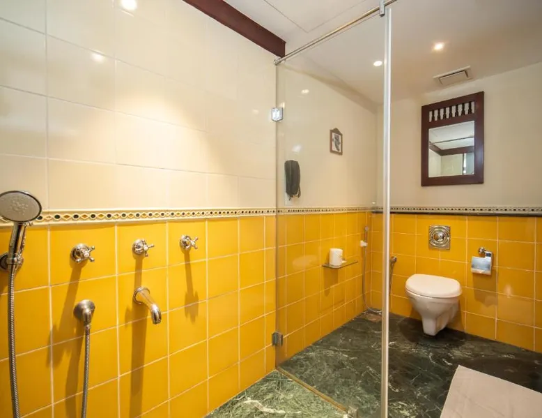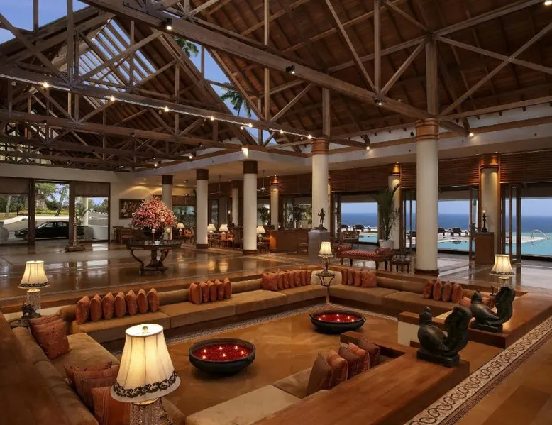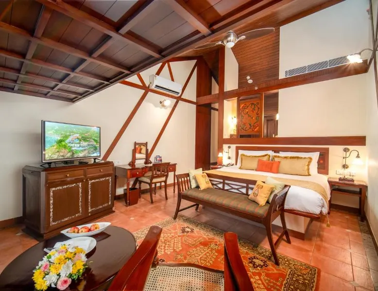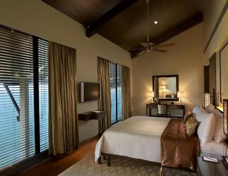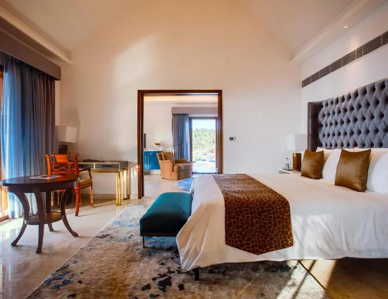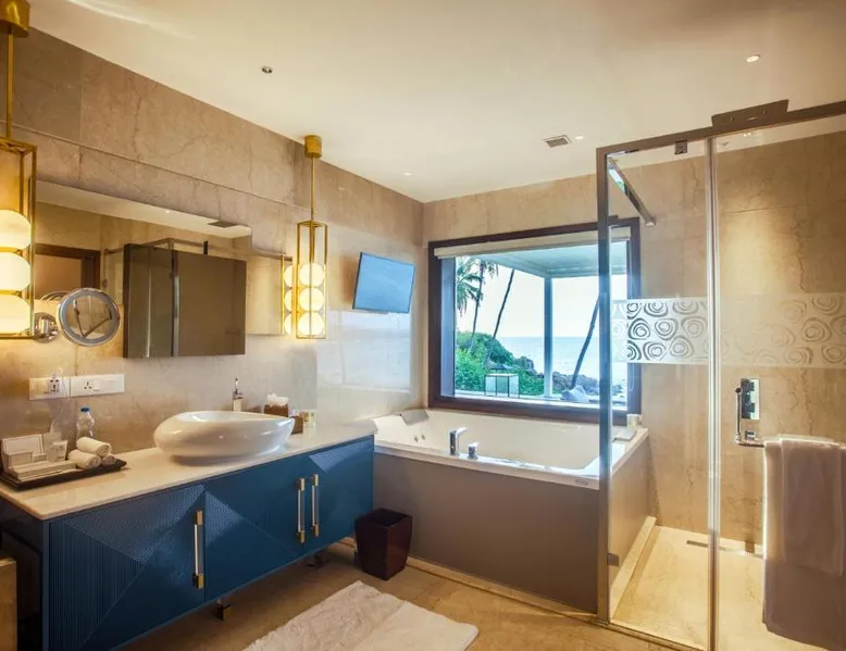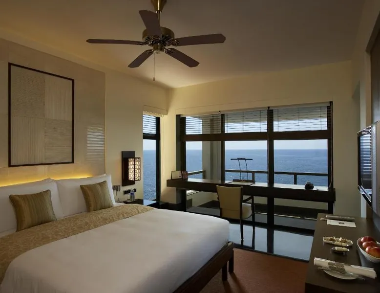 The Leela Kovalam, A Raviz Hotel sits on a cliff, offering panoramic views of the Kovalam shoreline and the Arabian Sea. It is steps away from a private access to beach and features an Ayurvedic Center & Modern Spa. Rooms at The Leela Kovalam, A Raviz Hotel combine wooden décor with modern amenities like high-speed Wi-fi, LED Television and tea/coffee making facilities. Each room provides views of the garden or the sea. The outdoor pools and the fitness center both overlook the sea. The Leela Kovalam, A Raviz Hotel also has a game room, badminton & tennis courts. Travel services include tour, ticketing arrangements and car rental. Located on the beach, The Tides Restaurant serves Pan-asian specialties and grilled seafood dishes. The Terrace is a 24-hour buffet restaurant offering indoor, outdoor, and pool view seating. Cocktails can be enjoyed cliffside, at The Sky Bar while watching the sunset. The Leela Kovalam, A Raviz Hotel is 8.7 mi away from Trivandrum City and the famous Padmanabhaswamy Temple. Trivandrum International Airport is a 30-minute drive away. Activities in the property include Table Tennis, Tennis, Badminton, Cricket, Archery, Beach Volleyball, Handball, Tug of War and Indoor Games such as Billiards, Chess, Board Games, Cards, Caroms and video games on Play station. We also provide classes on swimming (for kids), cooking classes, cocktail/mocktail classes and yoga sessions. There are activities across the vast property including water sports like snorkeling, scuba diving, exploring & learning more on the organic ingredients of Kerala Cuisine at Aaramam, a 5-acre vegetable garden at the resort and taking buggy tours across the property. Popular Facilities – Infinity Pools, Ayurveda & Yoga center, Kids Playroom The spacious suite features a mini-bar, a safe deposit box and a balcony. The unit has 1 bed.