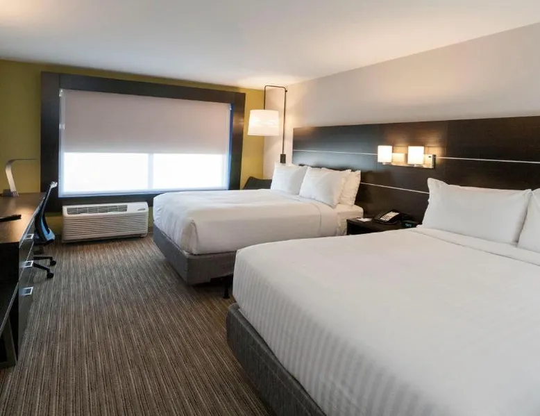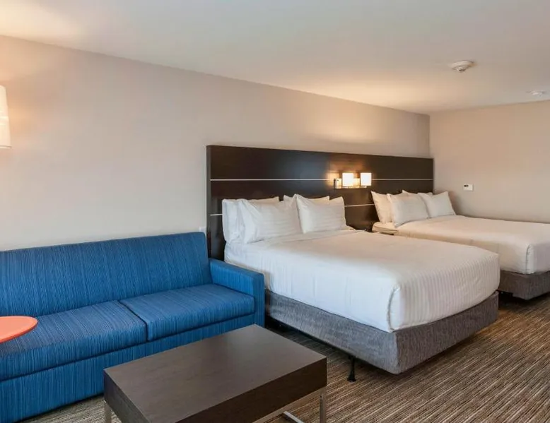 Comfortable Accommodations: Holiday Inn Express & Suites - Dodge City by IHG in Dodge City offers comfortable rooms with private bathrooms, baths, coffee machines, refrigerators, microwaves, showers, and TVs. Exceptional Facilities: Guests enjoy an indoor swimming pool, free WiFi, a waterpark, and a 24-hour front desk. Free private parking is available. Delightful Breakfast: A complimentary breakfast is provided by the property, ensuring a pleasant start to the day. Convenient Location: Located 4.3 mi from Dodge City Regional Airport, the hotel is praised for its convenient location and room comfort. This suite is consisted of of a flat-screen TV with satellite channels and a private bathroom. The unit has 2 beds.