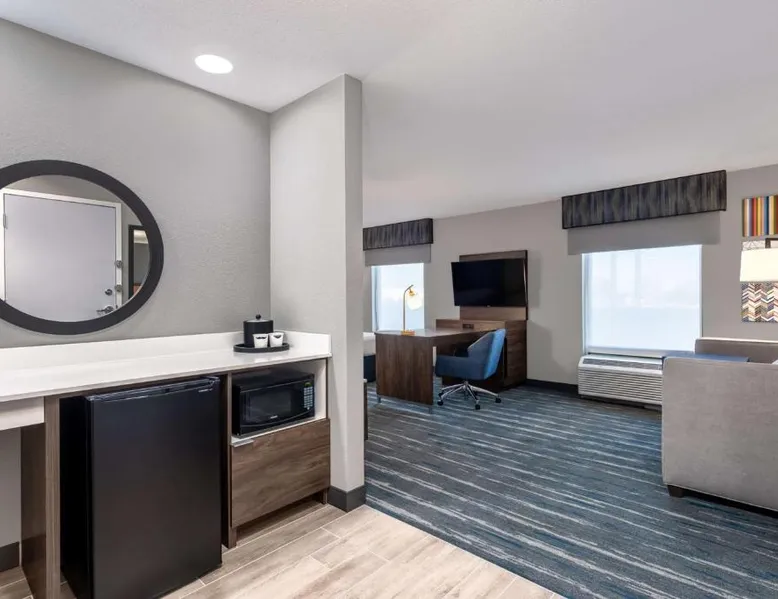 Comfortable Accommodations: Rooms feature air-conditioning, private bathrooms, tea and coffee makers, hairdryers, refrigerators, work desks, microwaves, showers, dressing rooms, carpeted floors, TVs, and wardrobes. Exceptional Facilities: Guests enjoy a saltwater swimming pool, indoor pool, fitness center, and free WiFi. Additional amenities include a lounge, fitness room, elevator, 24-hour front desk, daily housekeeping, business area, and luggage storage. Delicious Breakfast: A complimentary American buffet breakfast is served with warm dishes, juice, fresh pastries, cheese, fruits, and a variety of beverages. Convenient Location: Located in Richmond, the hotel is 33 mi from James M. Cox Dayton International Airport. Free on-site parking is available. Guest Satisfaction: Highly rated for value for money, room cleanliness, and breakfast provided by the property. The suite features a private bathroom, air conditioning, a tea and coffee maker, as well as a seating area with a flat-screen TV. The suite's kitchenette, which has a refrigerator and a microwave, is available for cooking and storing food. The suite provides a wardrobe, a dressing room, a sofa, a carpeted floor and a TV. The unit offers 2 beds.