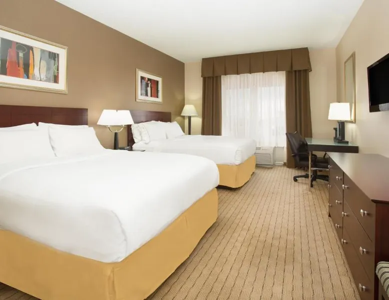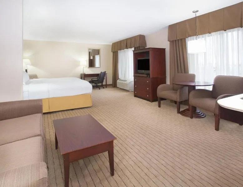 Comfortable Accommodations: Holiday Inn Express Hotel & Suites Minot South by IHG in Minot offers comfortable rooms with air-conditioning, private bathrooms, and free WiFi. Each room includes a tea and coffee maker, hairdryer, and free toiletries. Leisure Facilities: Guests can enjoy a fitness center, indoor swimming pool, and hot tub. Additional amenities include a elevator, 24-hour front desk, housekeeping service, business area, express check-in and check-out, and luggage storage. Dining Options: A continental, American, and buffet breakfast is available each morning. The hotel also provides free on-site parking and a variety of dining options. Location and Services: Located 4.3 mi from Minot International Airport, the hotel offers a 24-hour front desk, housekeeping, and express check-in and check-out services. Highly rated by guests, the property ensures a pleasant stay. A 32-inch flat-screen cable TV is included in this room, along with coffee-making facilities and a work desk.