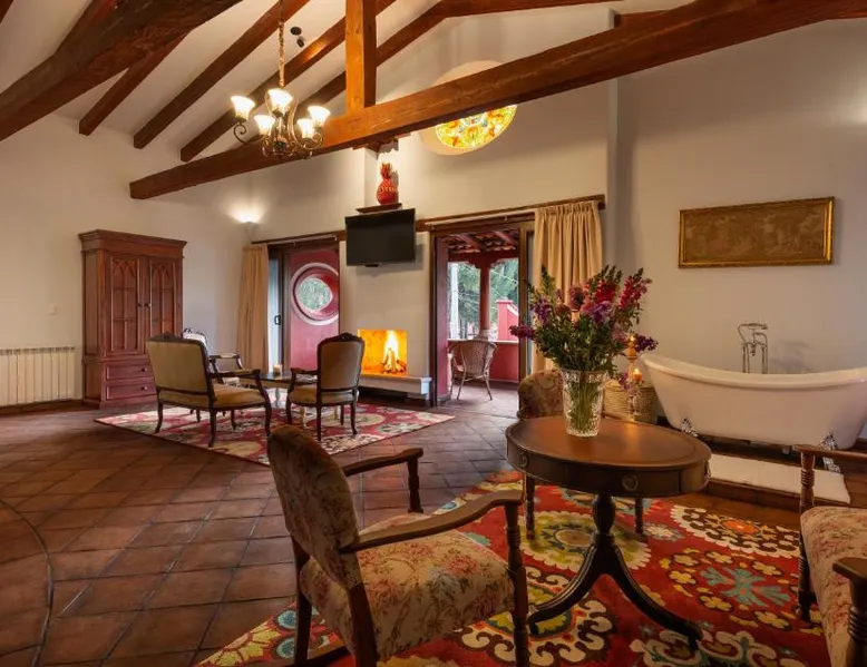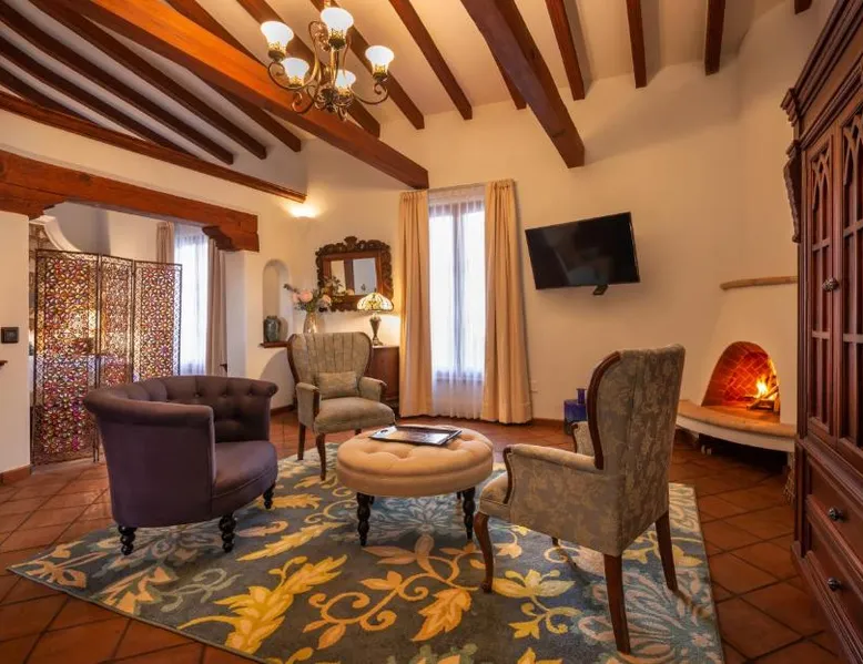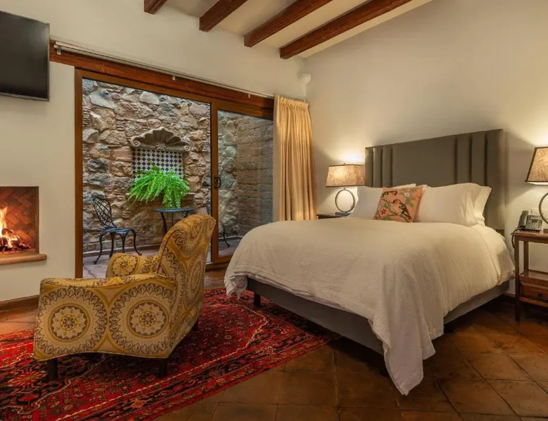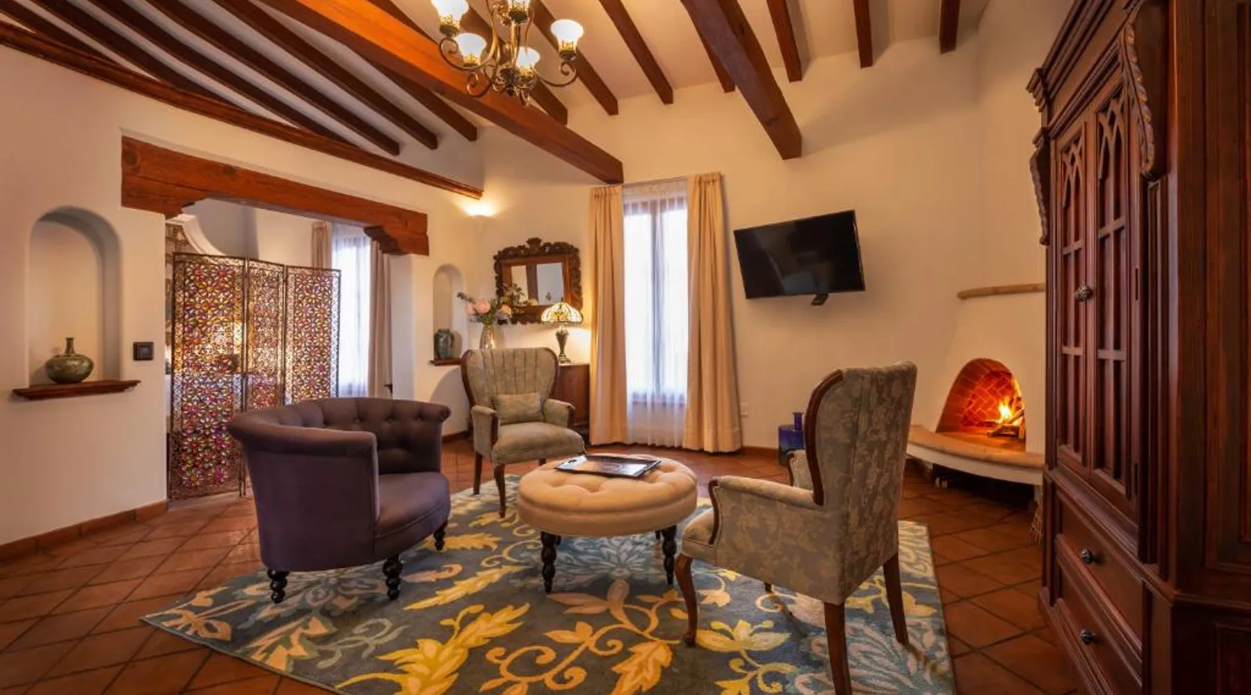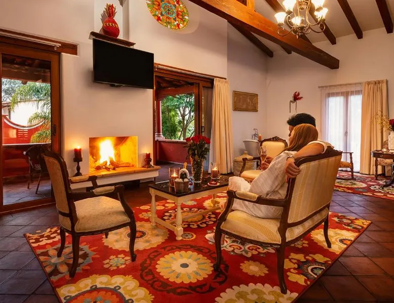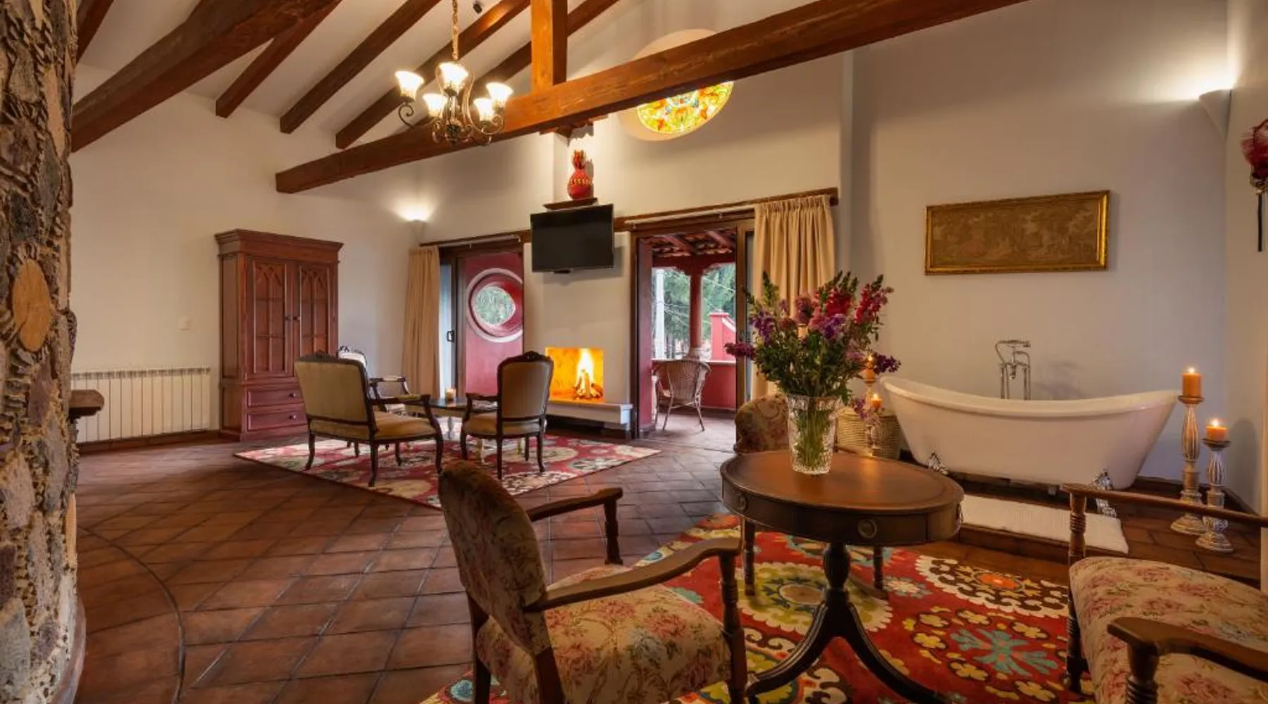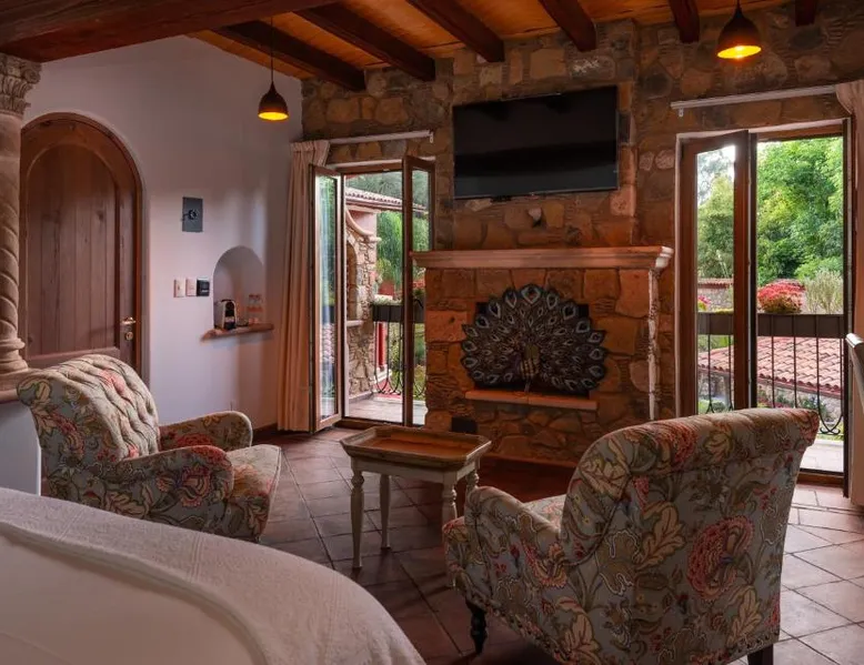 Elegant Accommodations: Hotel Boutique Casa Colorada in Pátzcuaro offers luxurious rooms with air-conditioning, private bathrooms, and modern amenities. Guests enjoy garden or inner courtyard views, balconies, and terraces. Exceptional Facilities: The hotel features a sun terrace, lush garden, and a family-friendly restaurant serving Italian and Mexican cuisines. Additional facilities include a bar, outdoor fireplace, and free WiFi throughout the property. Comfortable Amenities: Guests can relax in the hot tub, spa bath, or outdoor seating area. The property offers free private parking, a coffee shop, and a games room. Private check-in and check-out, a 24-hour front desk, and concierge services ensure a comfortable stay. Prime Location: Located 34 mi from Lic. y Gen. Ignacio López Rayón International Airport, the hotel is highly rated for its attentive staff and excellent service support. The fireplace is the standout feature of this suite. This suite features 1 living room, 1 separate bedroom and 1 bathroom with a shower and free toiletries. The air-conditioned suite features a flat-screen TV with streaming services, soundproof walls, a tea and coffee maker, a seating area as well as an inner courtyard view. The unit has 1 bed.