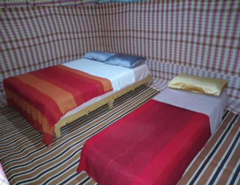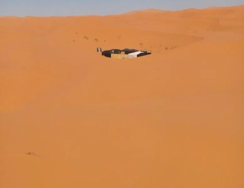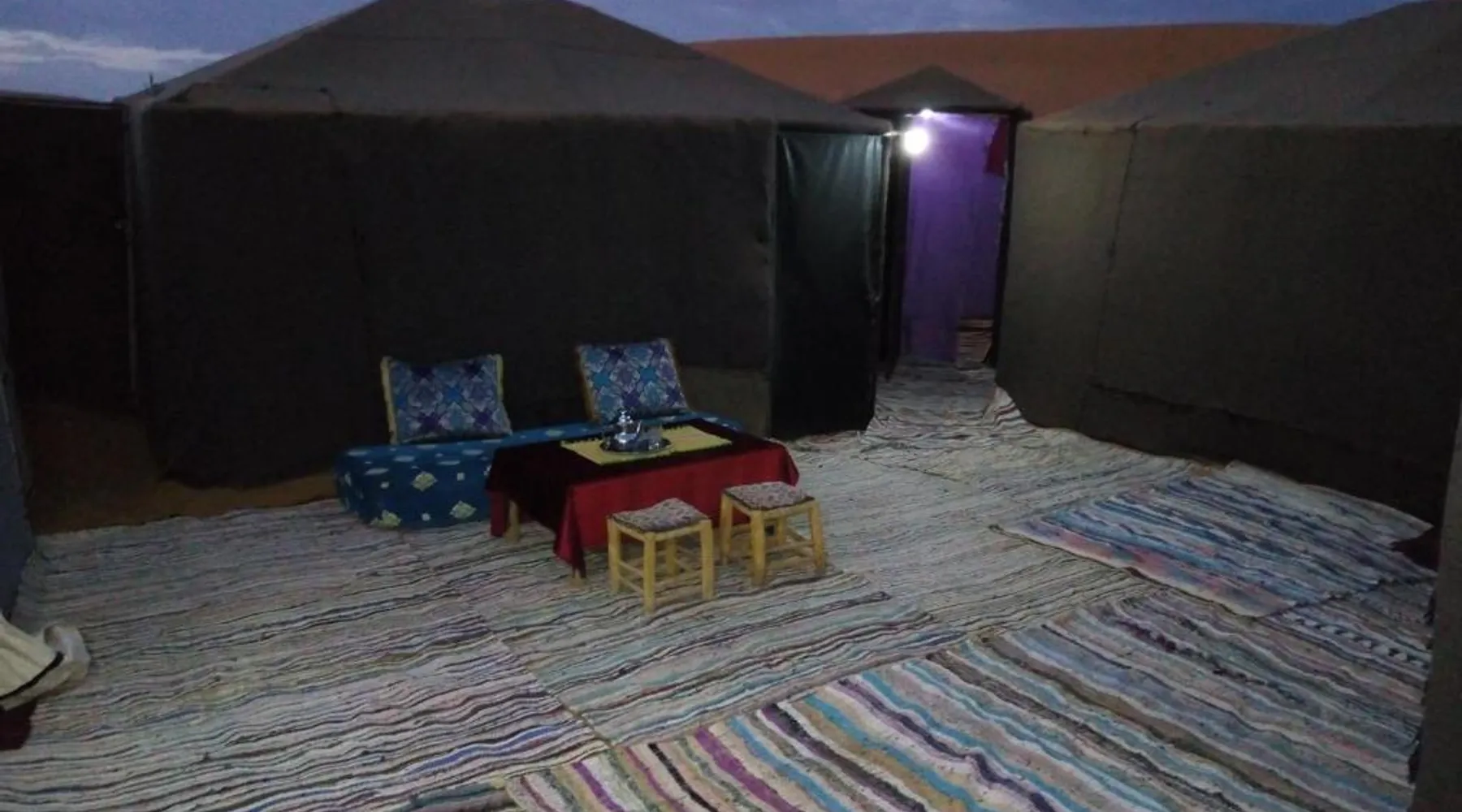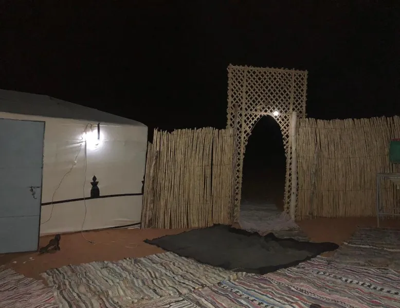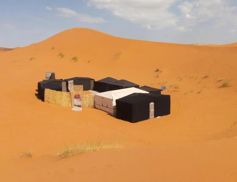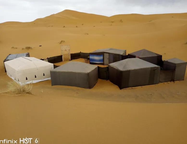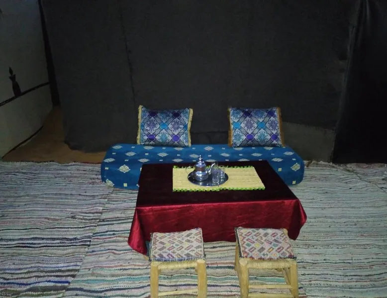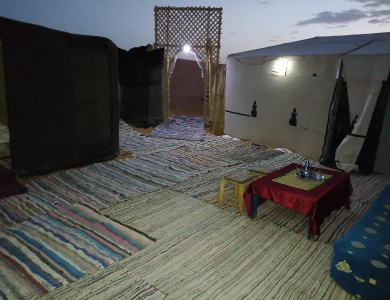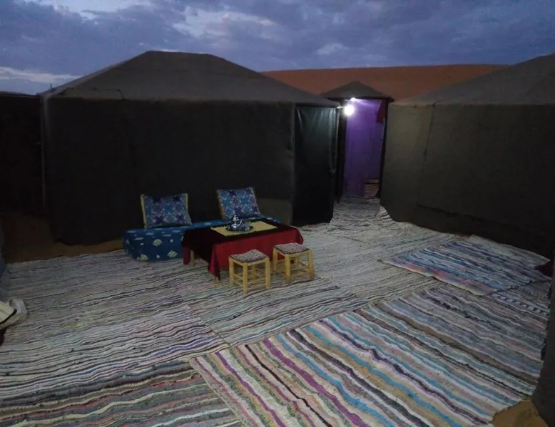 Accommodations: Sahara Camel Tours Camp in Merzouga offers comfortable camping with free WiFi and private parking. The property features an outdoor dining area, sofa bed, and shared bathroom. Activities: Guests can enjoy skiing and other outdoor activities. The camp provides a relaxing environment for all visitors. Location: Located 73 mi from Moulay Ali Cherif Airport, the camp is located in Hassi Labied. Reception staff speak Arabic, English, Spanish, French, and Italian. This tent has a shared bathroom and a dining area. The unit has 3 beds.