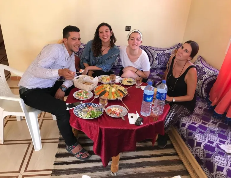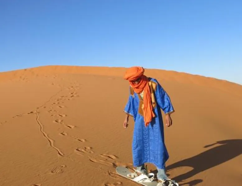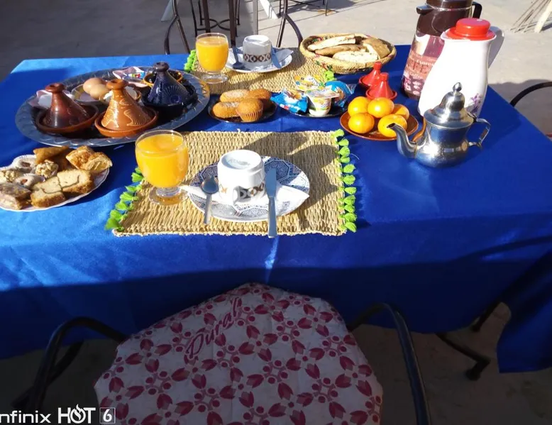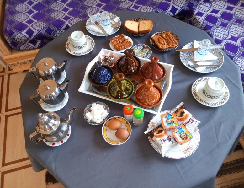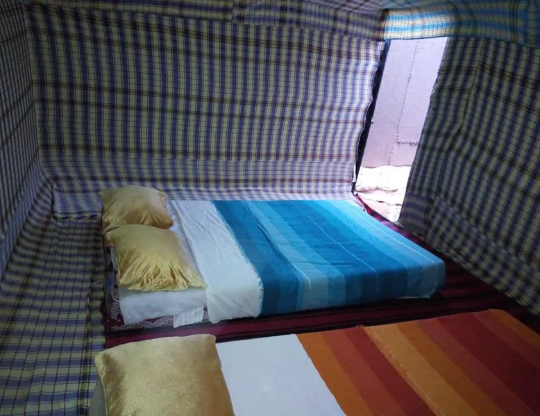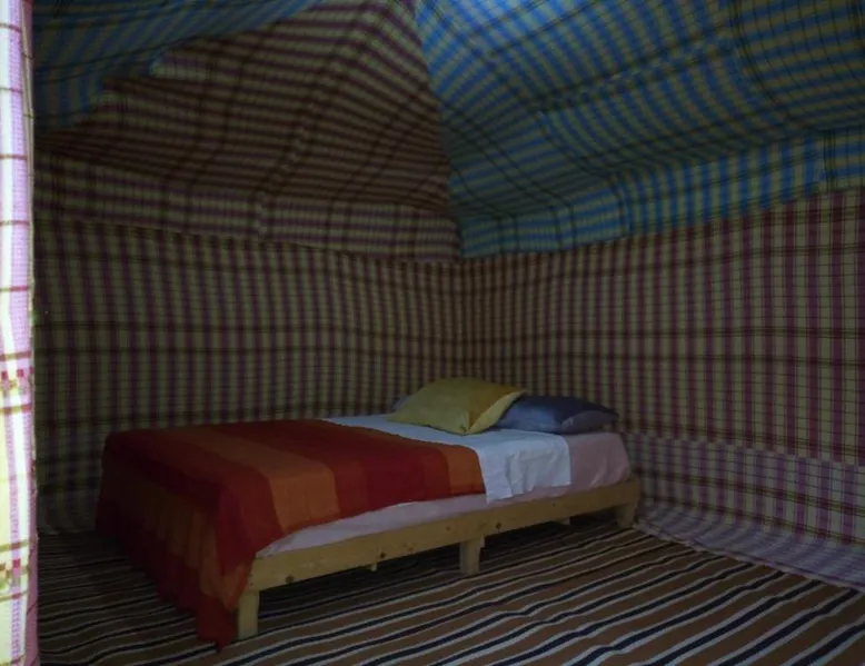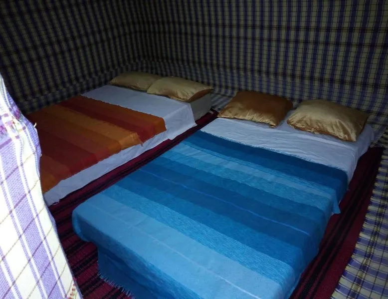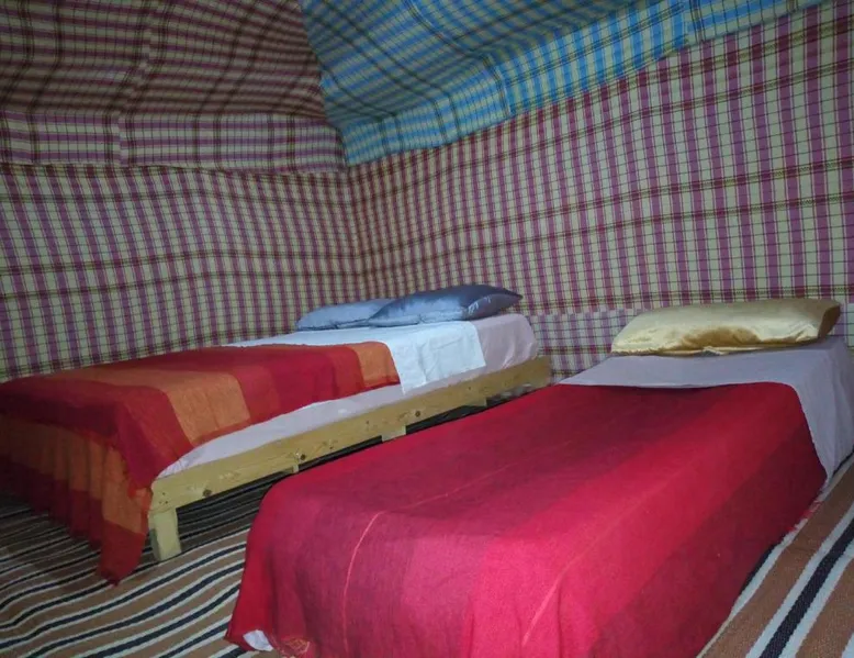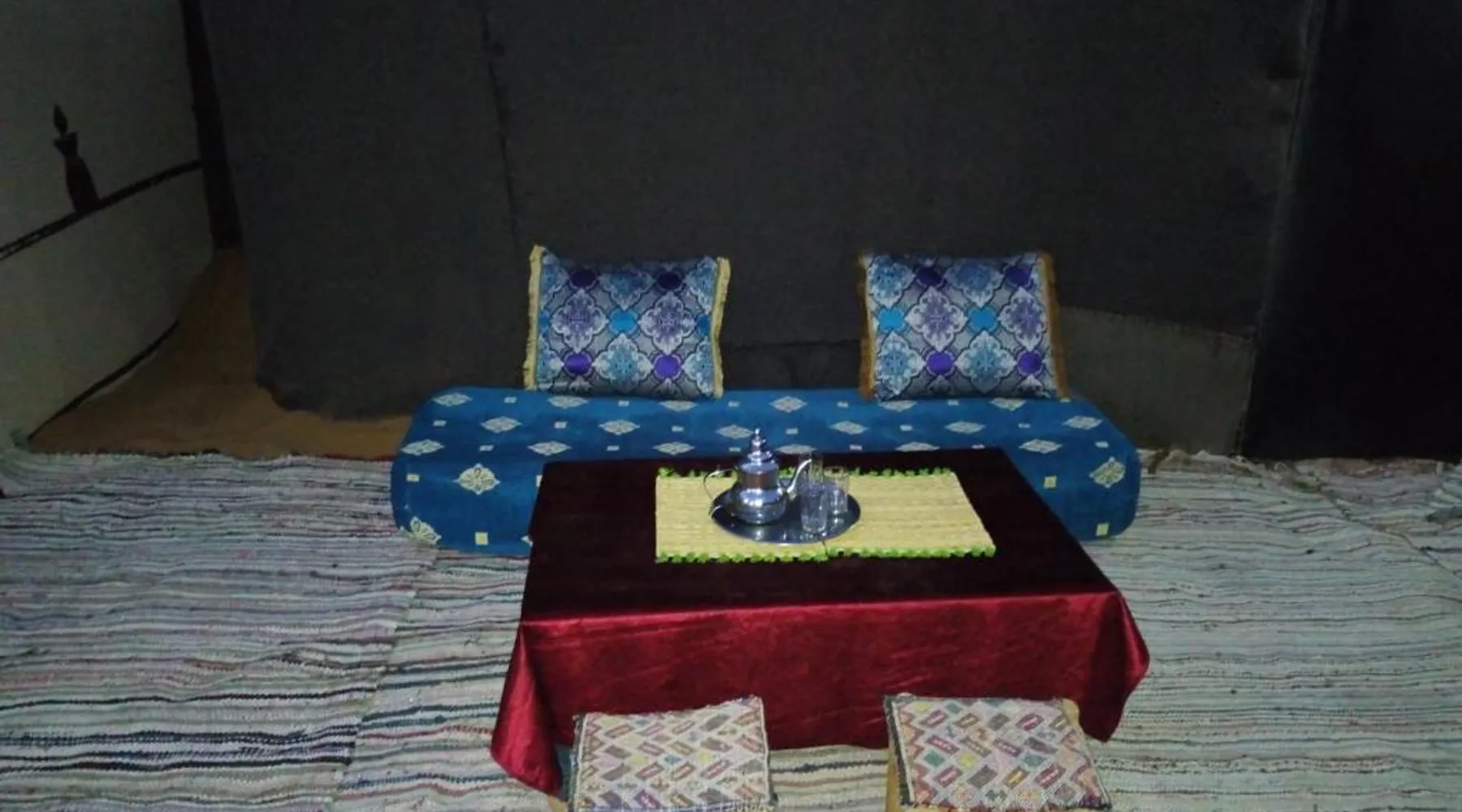 Accommodations: Sahara Camel Tours Camp in Merzouga offers comfortable camping with free WiFi and private parking. The property features an outdoor dining area, sofa bed, and shared bathroom. Activities: Guests can enjoy skiing and other outdoor activities. The camp provides a relaxing environment for all visitors. Location: Located 73 mi from Moulay Ali Cherif Airport, the camp is located in Hassi Labied. Reception staff speak Arabic, English, Spanish, French, and Italian. This tent has a shared bathroom and a dining area. The unit has 3 beds.