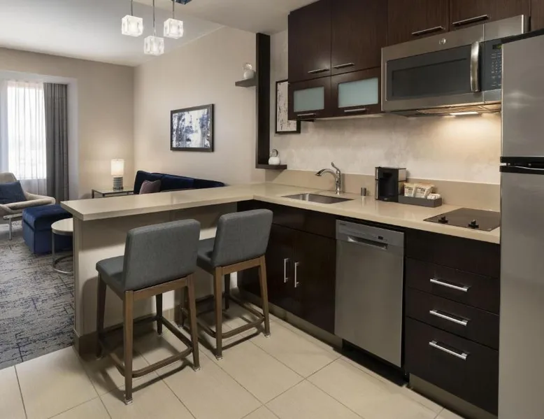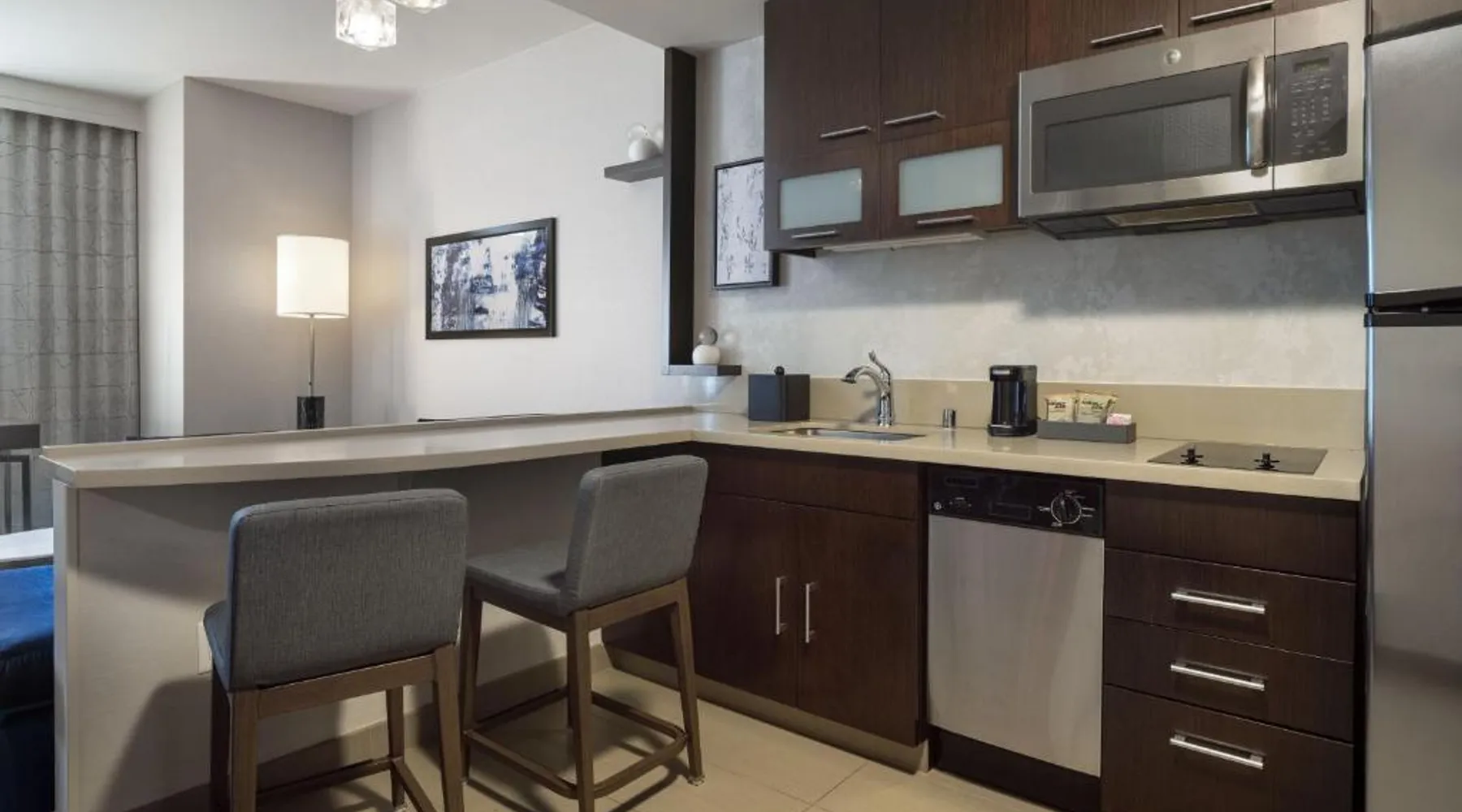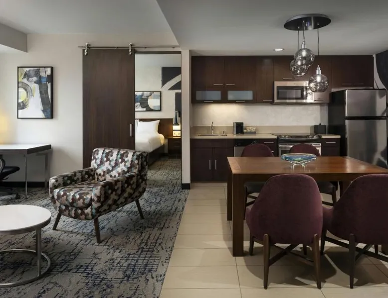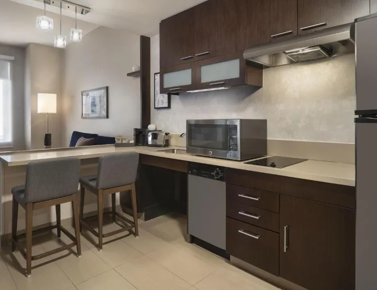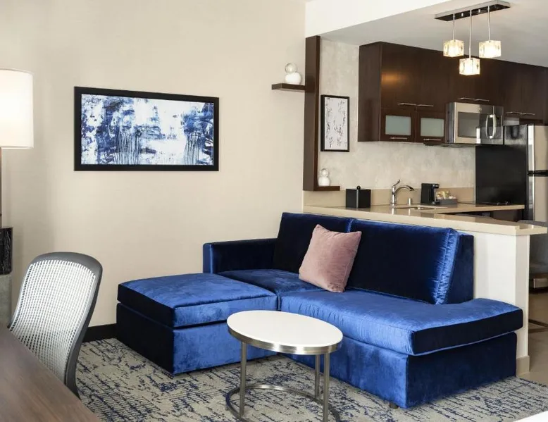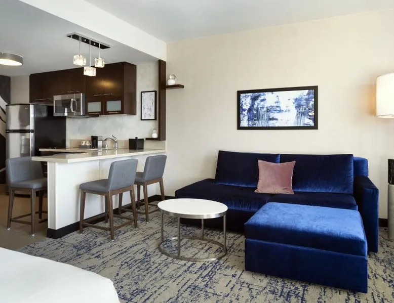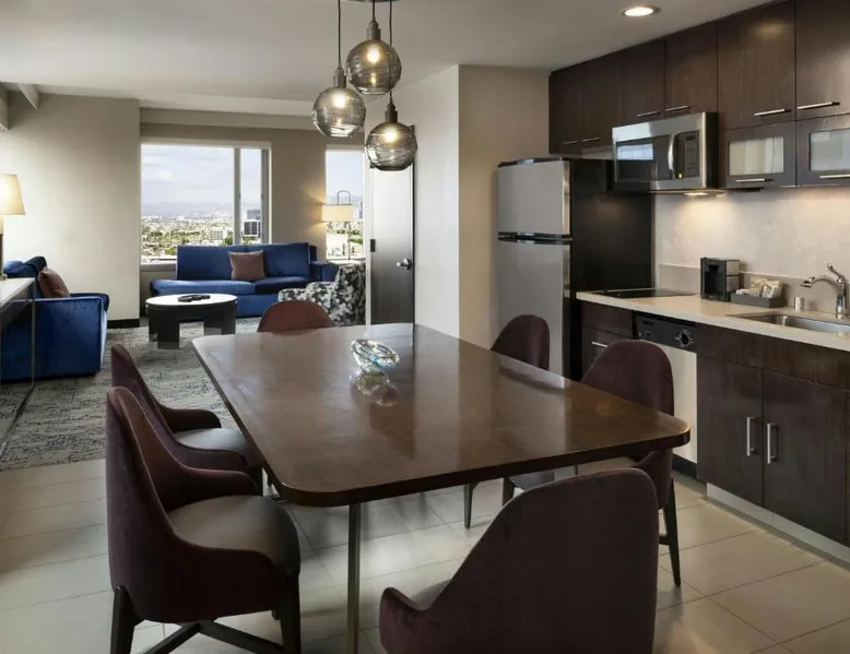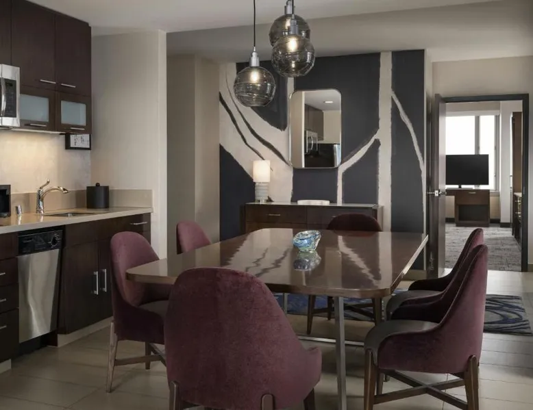Offering an on-site fitness center, Residence Inn Los Angeles L.A. LIVE is less than 5 minutes' walk from the Staples Center. This hotel features free WiFi access, a free breakfast, and a concierge service. The modern rooms and suites here come with a fully equipped kitchen, a dining area, and a seating area with a sofa. Extras include a cable flat-screen TV with pay-per-view channels and a private bathroom with a bath or shower. Additional amenities offered on site to guests include a 24-hour front desk, valet parking, meeting facilities, and a mini-market. The on-site restaurant, Table 901, offers an American cuisine for breakfast and dinner. Residence Inn Los Angeles L.A. LIVE is a 10-minute walk from the Los Angeles Convention Center, 1.2 mi from the Museum of Contemporary Art, and 2.5 mi from Dodger Stadium. 7th Street/Metro Center Station is a 12-minute walk, Los Angeles Union Station is 2.6 mi, and Los Angeles International Airport is 17 mi from the hotel. This modern suite features a cable flat-screen TV, a seating area with a sofa, and a fully equipped kitchen. Extras include a dining area and a private bathroom with a bath or shower.