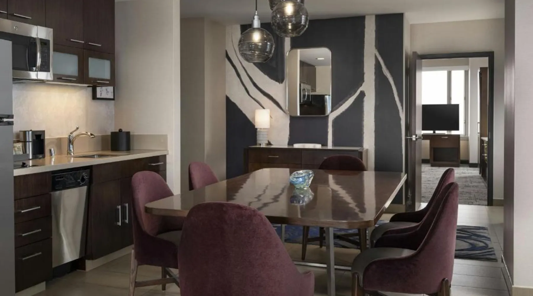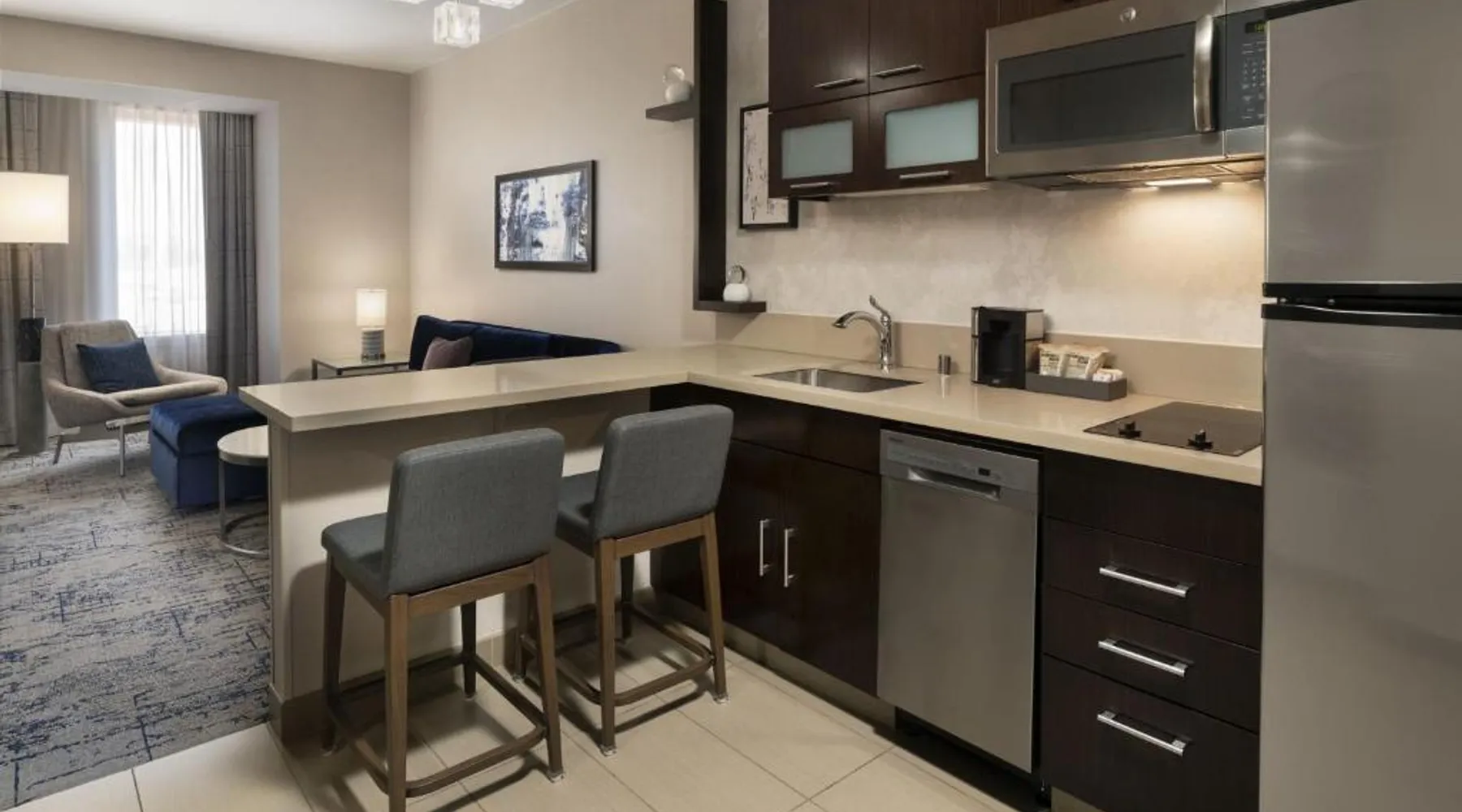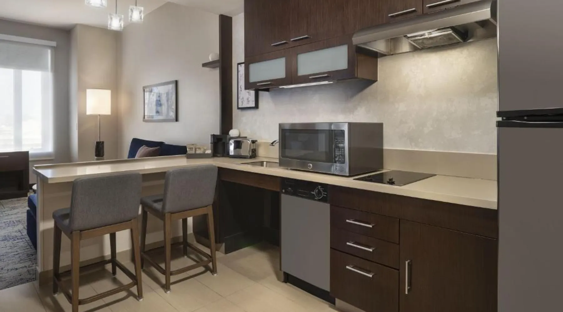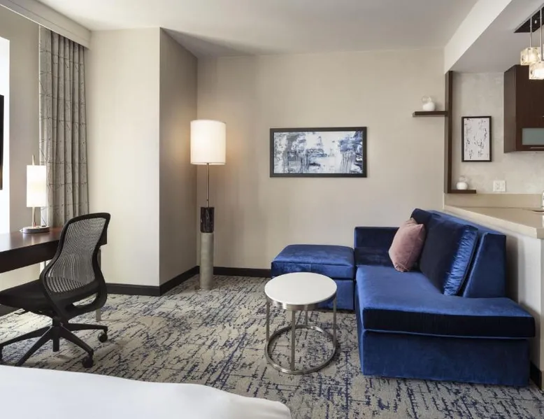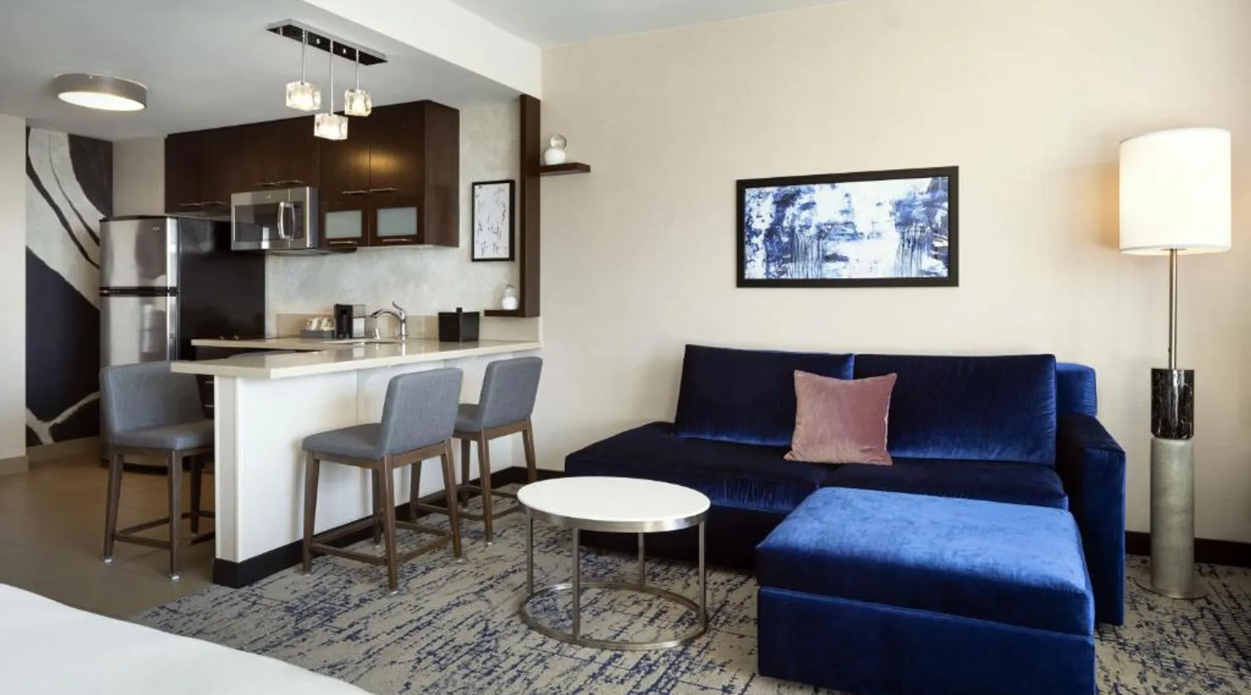 Offering an on-site fitness center, Residence Inn Los Angeles L.A. LIVE is less than 5 minutes' walk from the Staples Center. This hotel features free WiFi access, a free breakfast, and a concierge service. The modern rooms and suites here come with a fully equipped kitchen, a dining area, and a seating area with a sofa. Extras include a cable flat-screen TV with pay-per-view channels and a private bathroom with a bath or shower. Additional amenities offered on site to guests include a 24-hour front desk, valet parking, meeting facilities, and a mini-market. The on-site restaurant, Table 901, offers an American cuisine for breakfast and dinner. Residence Inn Los Angeles L.A. LIVE is a 10-minute walk from the Los Angeles Convention Center, 1.2 mi from the Museum of Contemporary Art, and 2.5 mi from Dodger Stadium. 7th Street/Metro Center Station is a 12-minute walk, Los Angeles Union Station is 2.6 mi, and Los Angeles International Airport is 17 mi from the hotel. This modern suite features a cable flat-screen TV, a seating area with a sofa, and a fully equipped kitchen. Extras include a dining area and a private bathroom with a bath or shower.