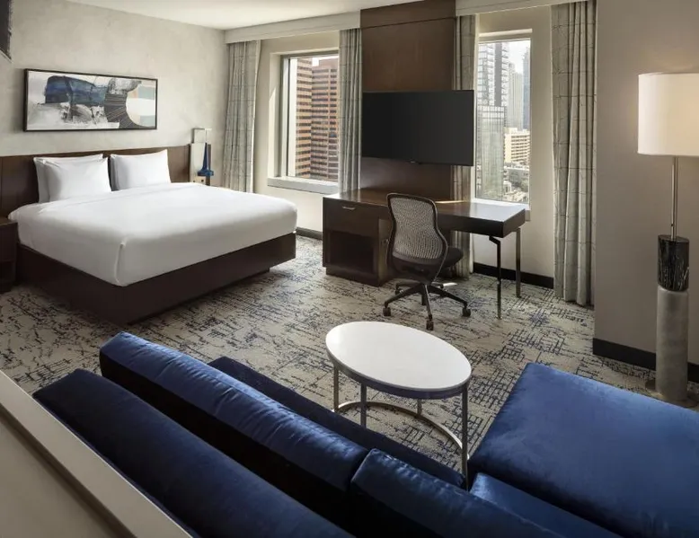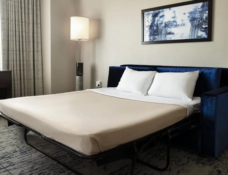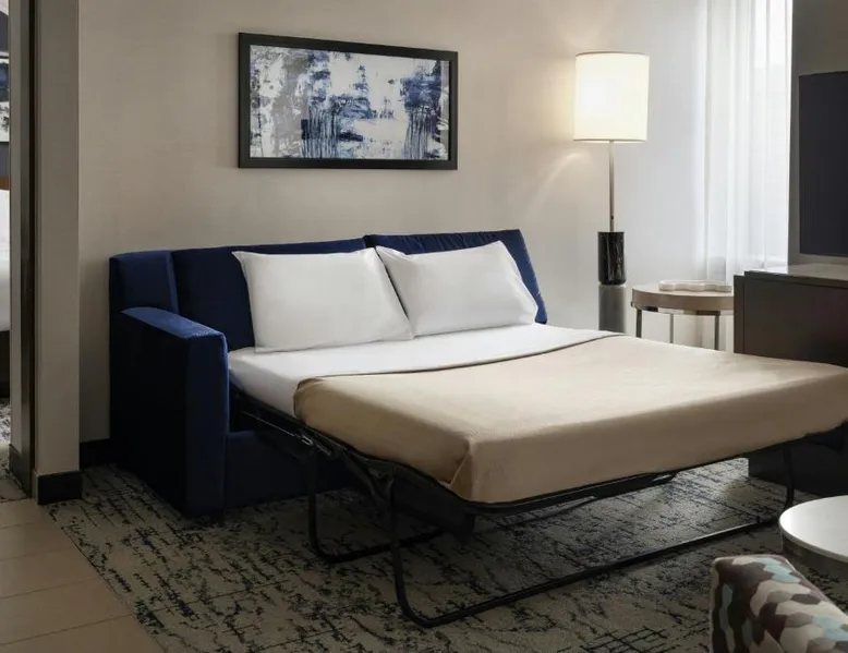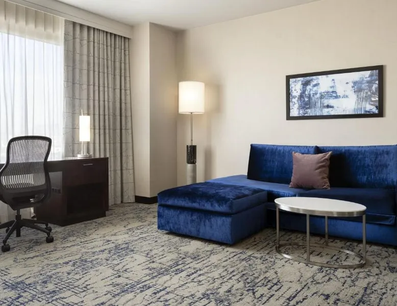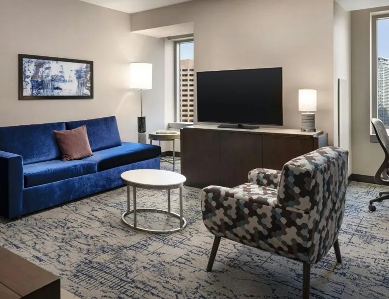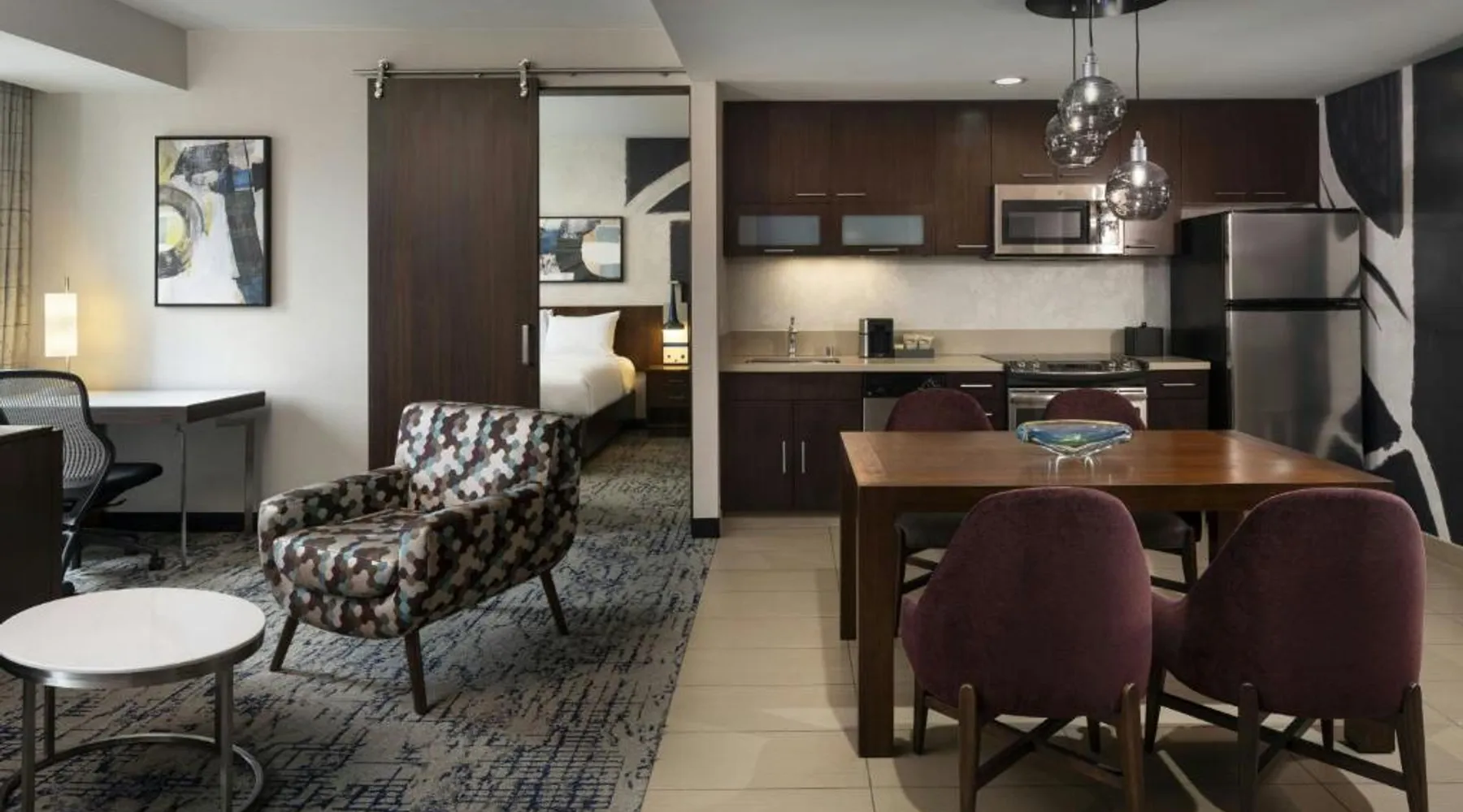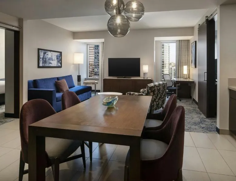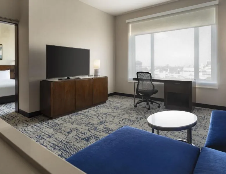 Offering an on-site fitness center, Residence Inn Los Angeles L.A. LIVE is less than 5 minutes' walk from the Staples Center. This hotel features free WiFi access, a free breakfast, and a concierge service. The modern rooms and suites here come with a fully equipped kitchen, a dining area, and a seating area with a sofa. Extras include a cable flat-screen TV with pay-per-view channels and a private bathroom with a bath or shower. Additional amenities offered on site to guests include a 24-hour front desk, valet parking, meeting facilities, and a mini-market. The on-site restaurant, Table 901, offers an American cuisine for breakfast and dinner. Residence Inn Los Angeles L.A. LIVE is a 10-minute walk from the Los Angeles Convention Center, 1.2 mi from the Museum of Contemporary Art, and 2.5 mi from Dodger Stadium. 7th Street/Metro Center Station is a 12-minute walk, Los Angeles Union Station is 2.6 mi, and Los Angeles International Airport is 17 mi from the hotel. This modern suite features a cable flat-screen TV, a seating area with a sofa, and a fully equipped kitchen. Extras include a dining area and a private bathroom with a bath or shower.