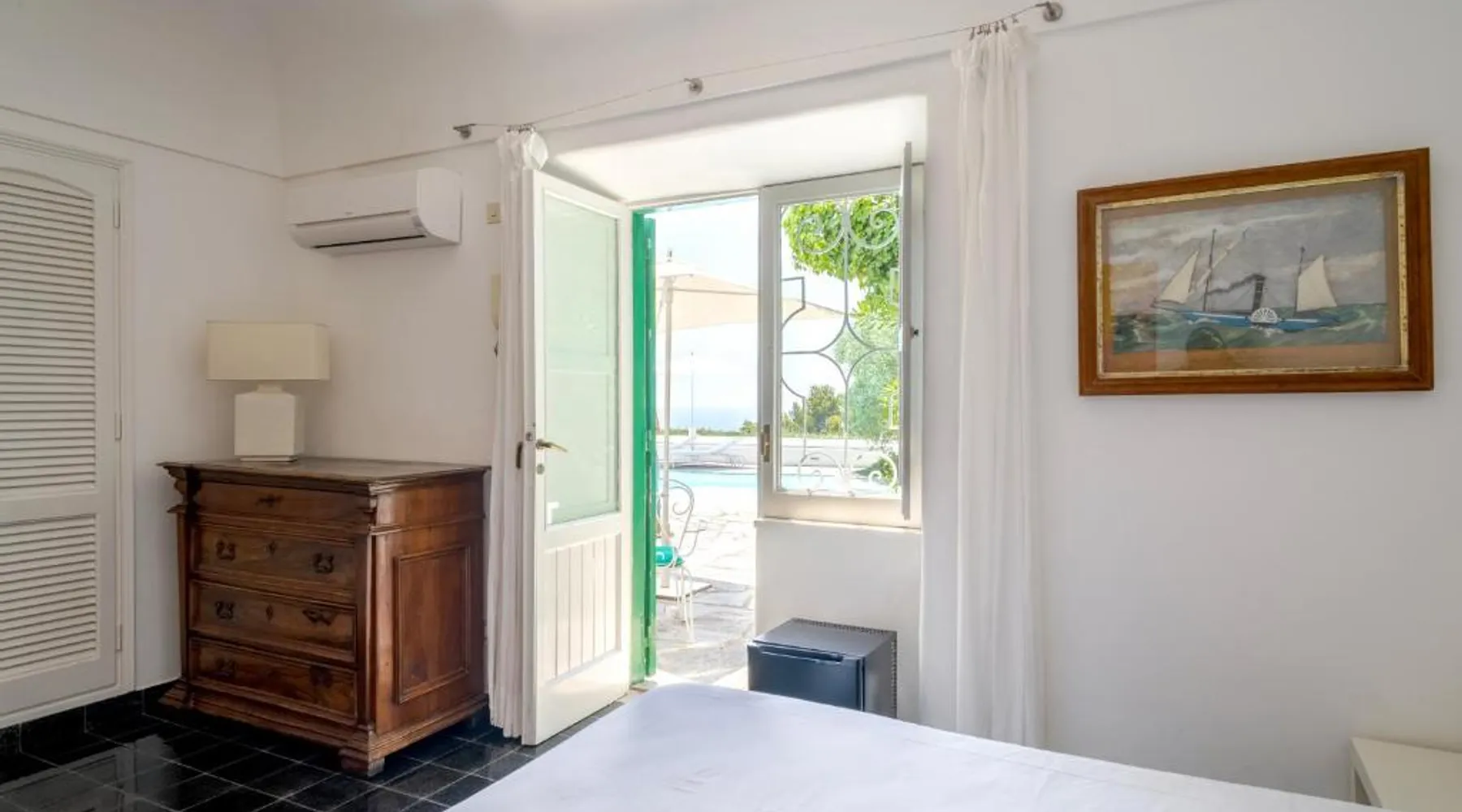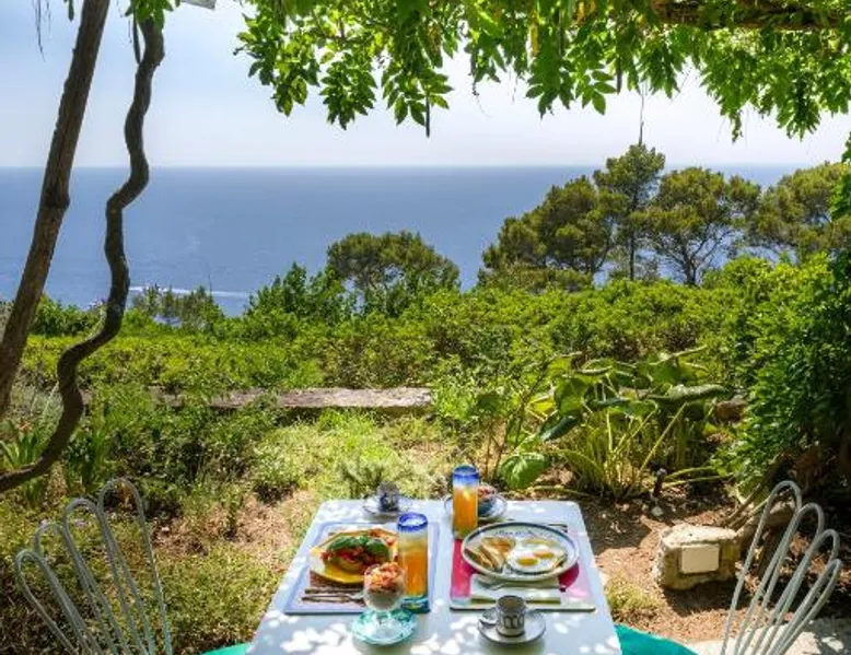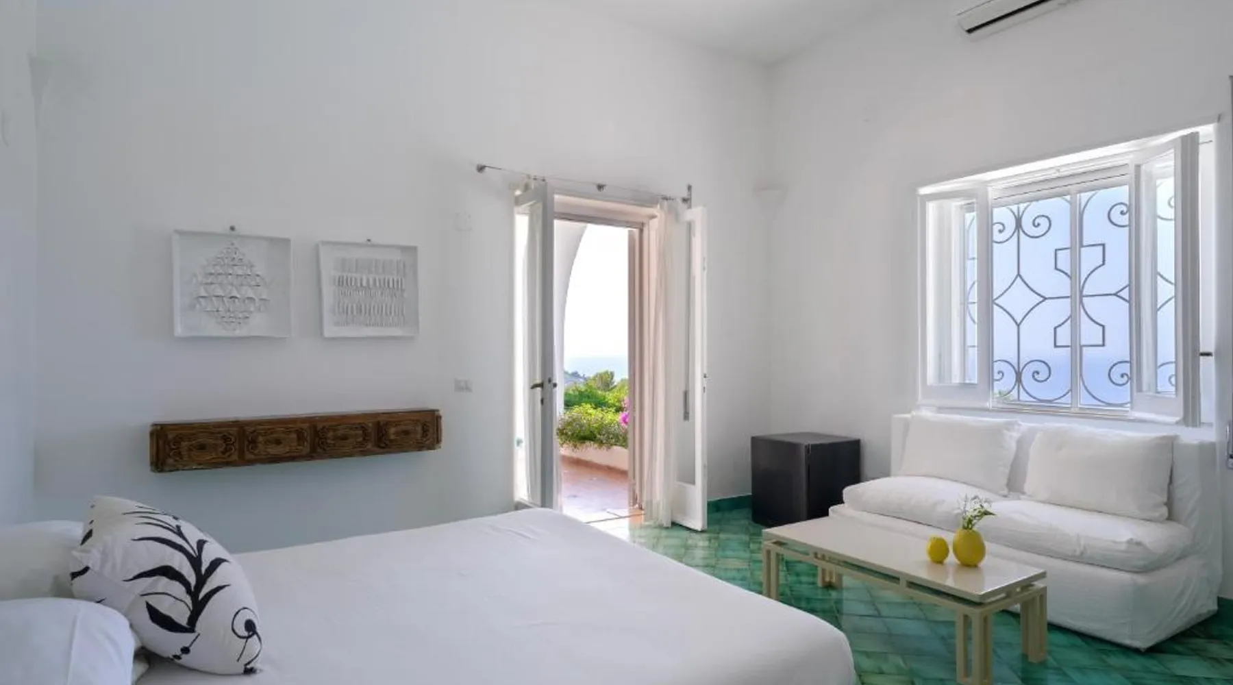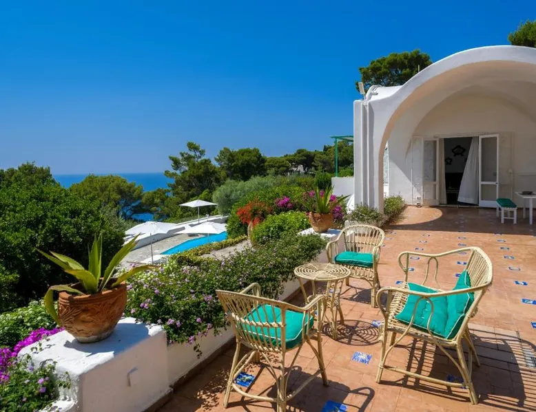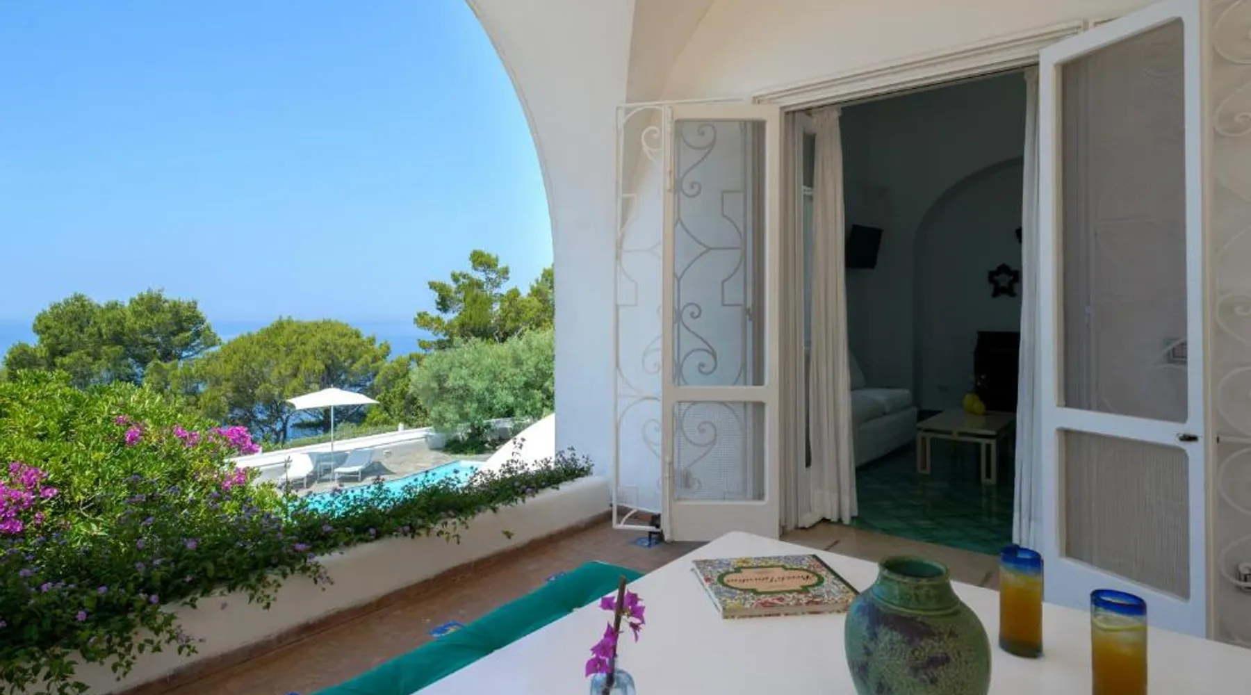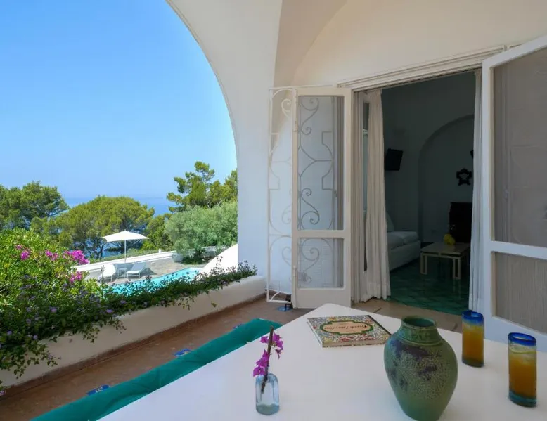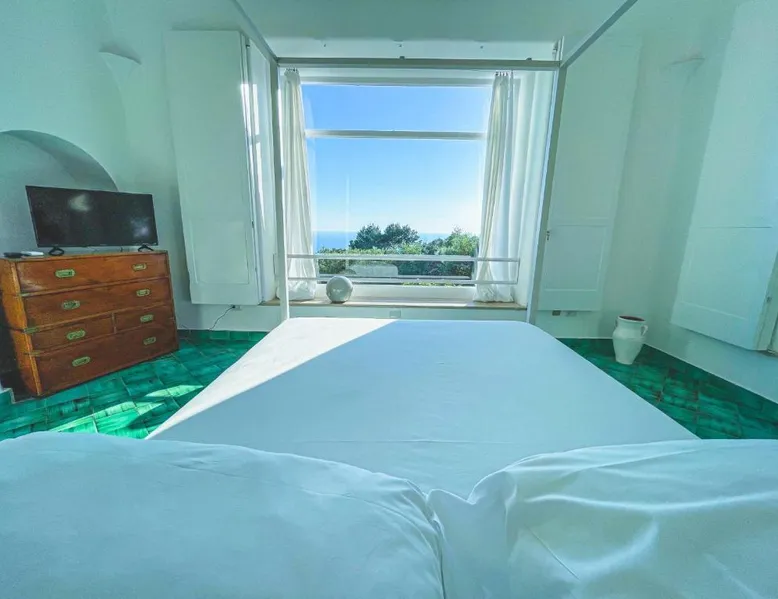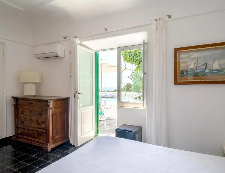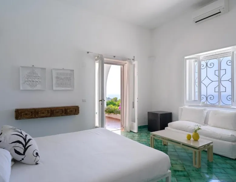 Elegant Accommodations: Il Carrubo Capri in Anacapri offers a country house with a swimming pool, sun terrace, and lush garden. Guests enjoy free WiFi, a bar, and outdoor seating areas. Comfortable Amenities: The property features air-conditioning, private bathrooms, and garden views. Additional amenities include a mini-bar, work desk, and soundproofed rooms. Breakfast and Location: A daily breakfast with juice, fresh pastries, cheese, and fruits is highly rated by guests. The location with stunning views and proximity to Gradola Beach enhance the stay. This double room's standout feature is the pool with a view. The double room offers air conditioning, a private entrance, a terrace with garden views as well as a private bathroom boasting a walk-in shower. The unit has 1 bed.