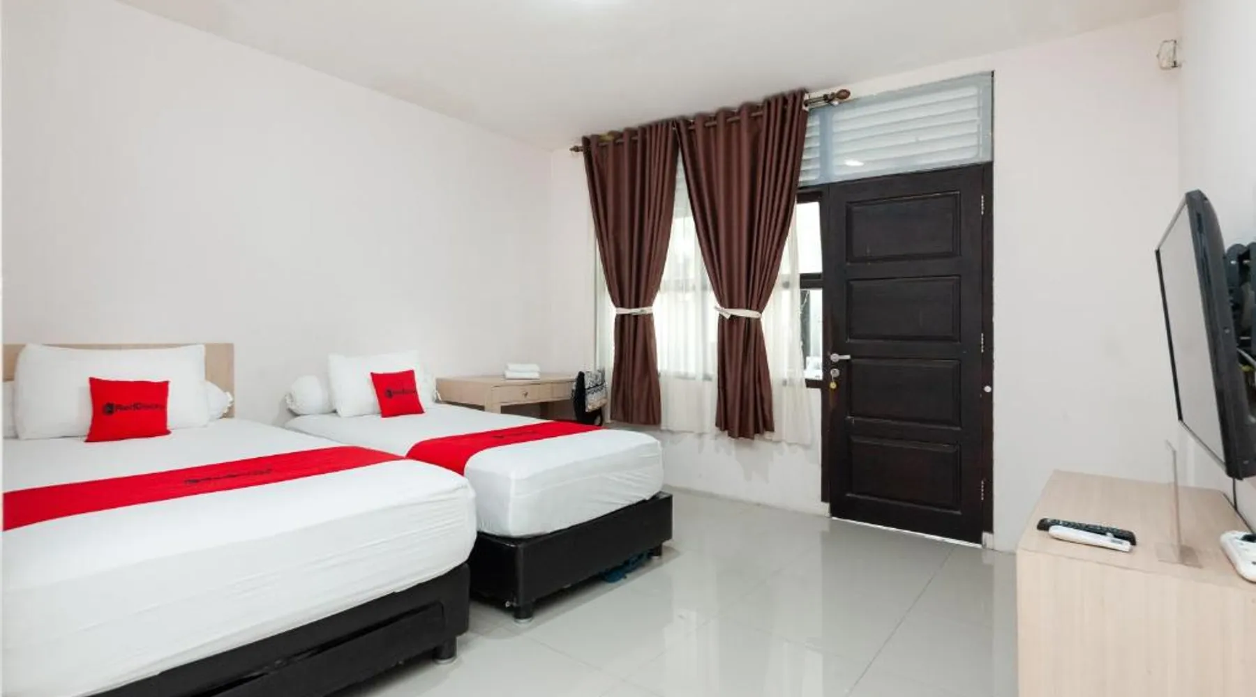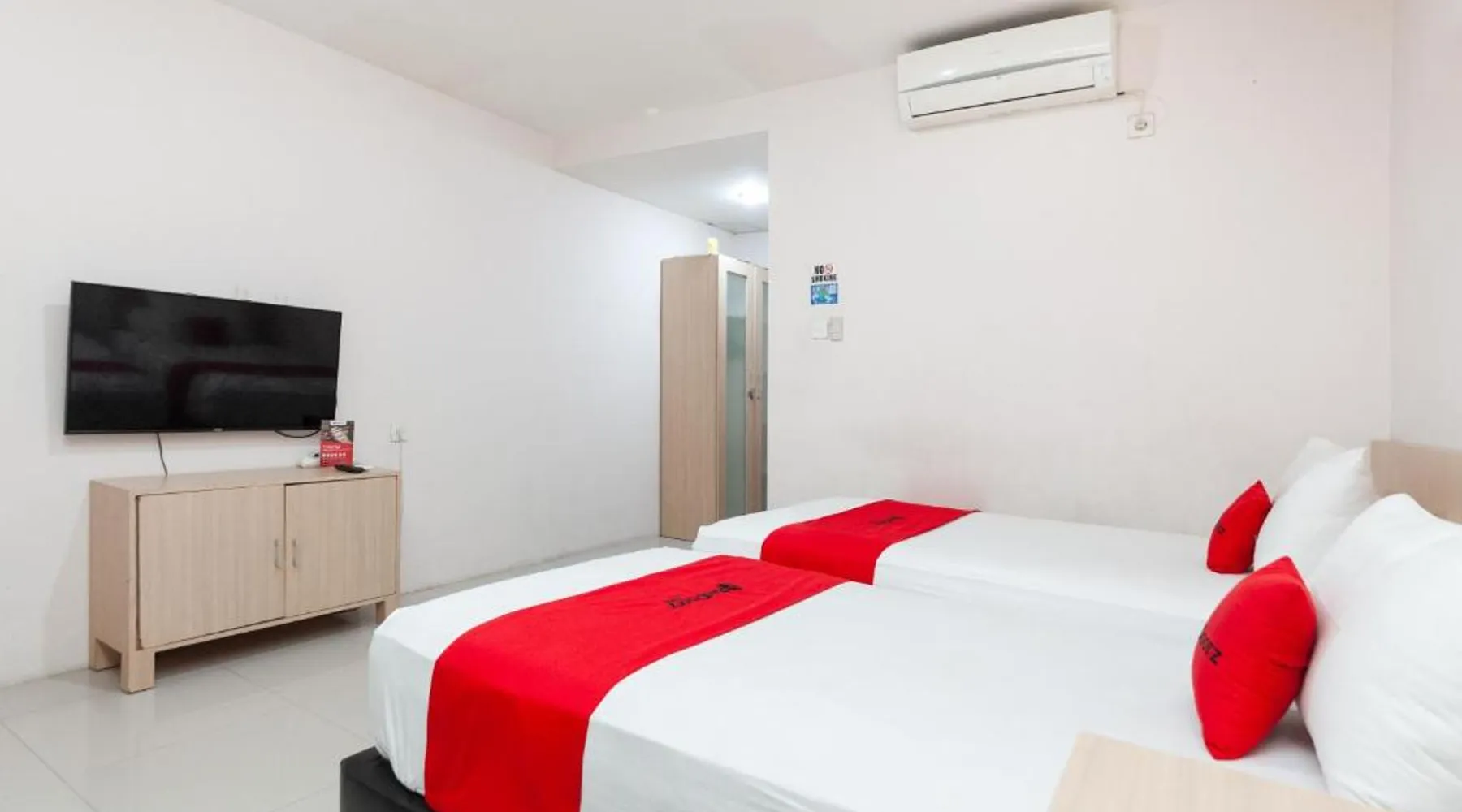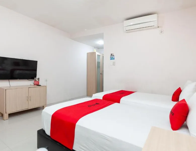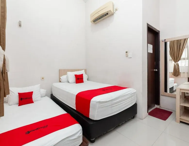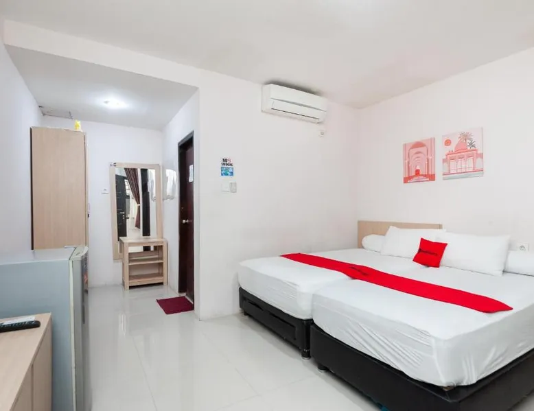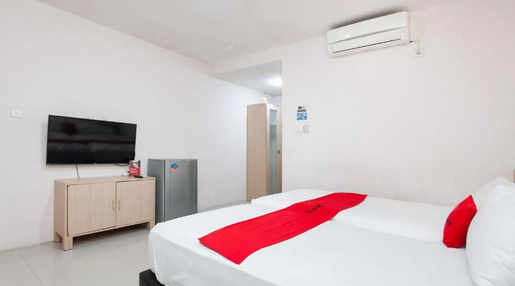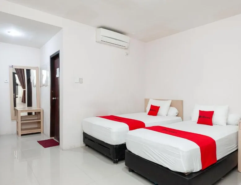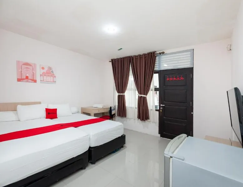 Comfortable Accommodations: RedDoorz Syariah near Banda Aceh Convention Hall in Banda Aceh offers 2-star rooms with air-conditioning, TV, and free WiFi. Each room includes a private bathroom and essential amenities for a pleasant stay. Convenient Facilities: Guests benefit from a 24-hour front desk, free on-site private parking, and free WiFi. The hotel provides a welcoming environment with English and Indonesian-speaking reception staff. Prime Location: Located 6.2 mi from Sultan Iskandar Muda International Airport, the hotel is 5 mi from Harapan Bangsa Stadium. Nearby attractions offer diverse activities for visitors. This twin room features air conditioning and a flat-screen TV. The unit has 2 beds.