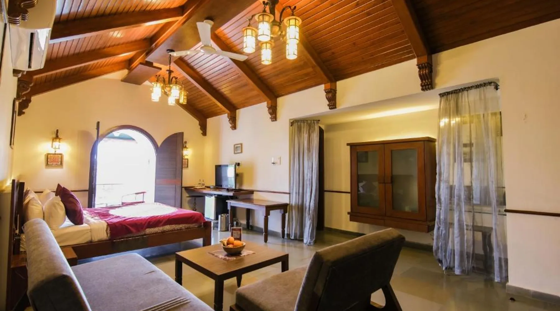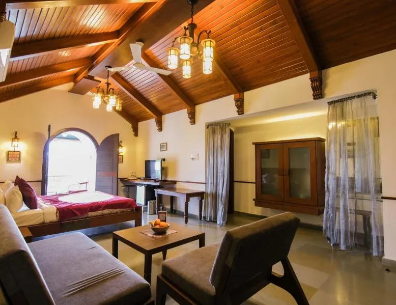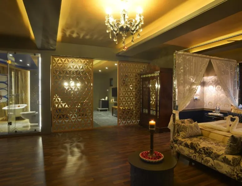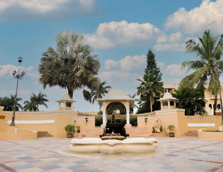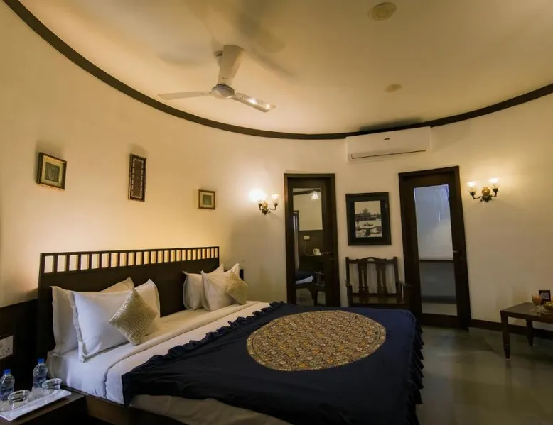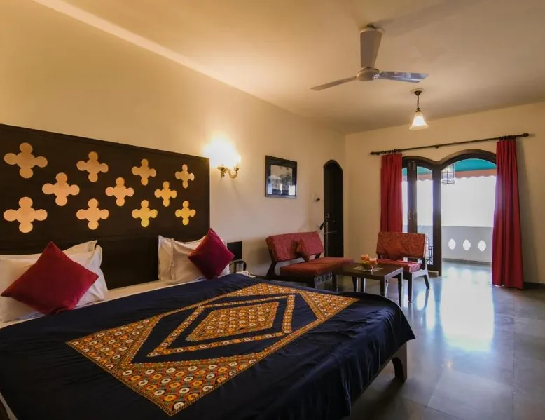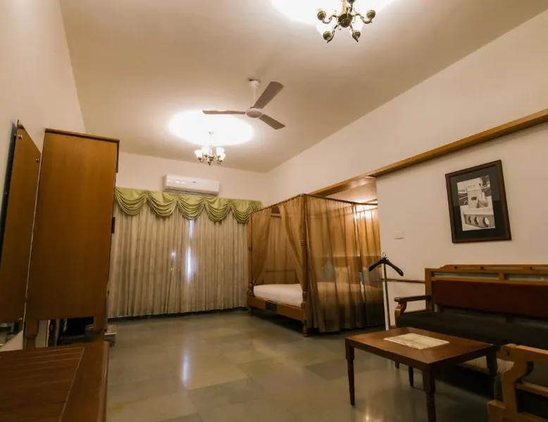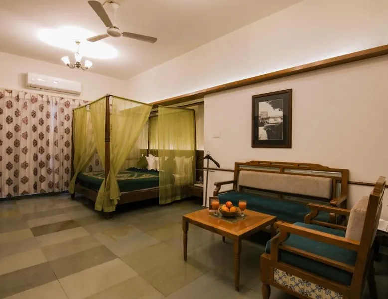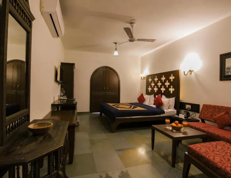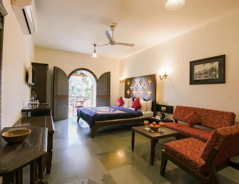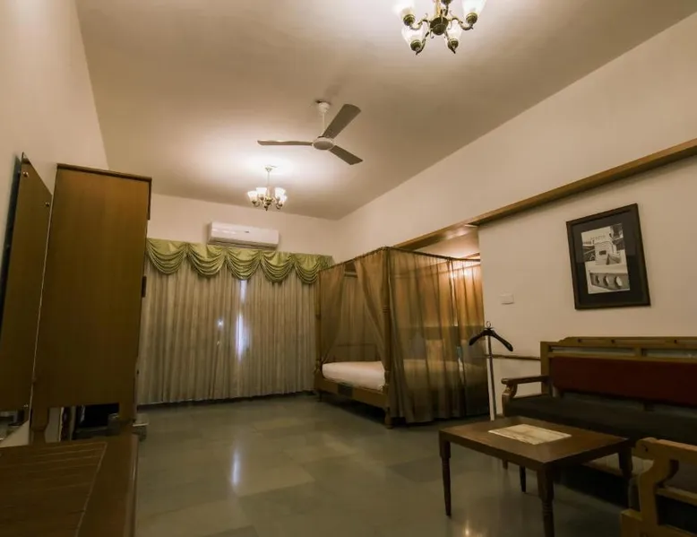 Elegant Accommodations: Heritage Khirasara Palace in Rajkot offers a 5-star experience with luxurious rooms featuring air-conditioning, private bathrooms, and modern amenities. Guests enjoy free WiFi, private check-in and check-out services, and a 24-hour front desk. Exceptional Facilities: The hotel features a spa, indoor and year-round outdoor swimming pools, a garden, terrace, and open-air bath. Additional facilities include a fitness center, tennis and badminton equipment hire, and a games room. Free airport shuttle service is available 28 mi from Rajkot International Airport. Dining Options: A variety of cuisines are served at the on-site restaurant, including Chinese, British, French, Indian, and Italian. Guests can also enjoy breakfast provided by the property, which is highly appreciated by visitors. Prime Location: Located 12 mi from Rajkot Railway Station and 17 mi from Saurashtra Cricket Association Stadium, the hotel offers easy access to local attractions. This room is also know as Pranay Vilas , bigger in size.