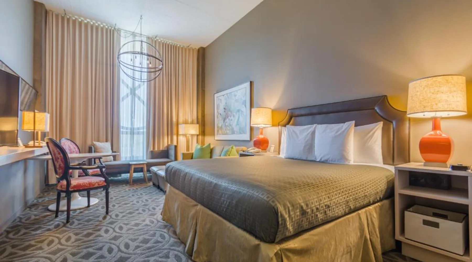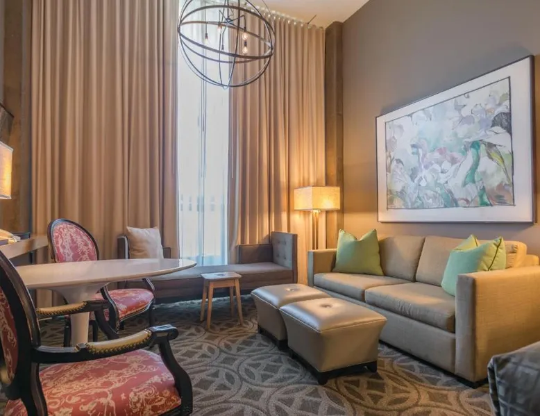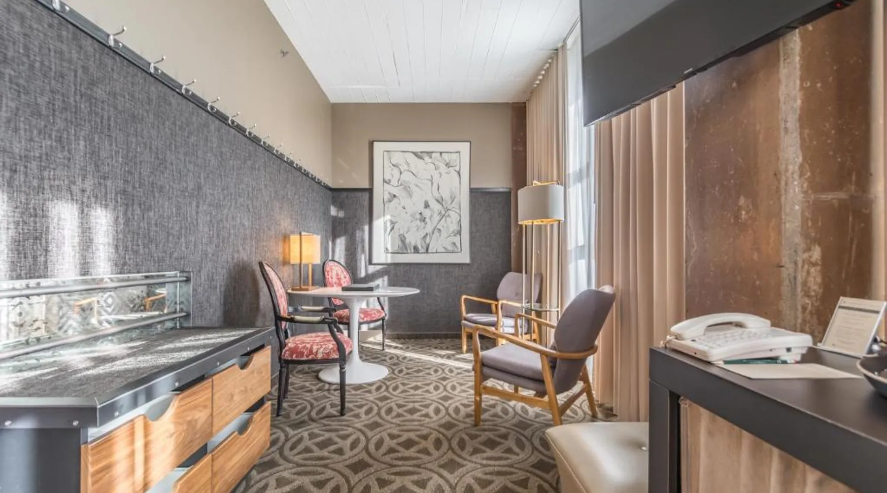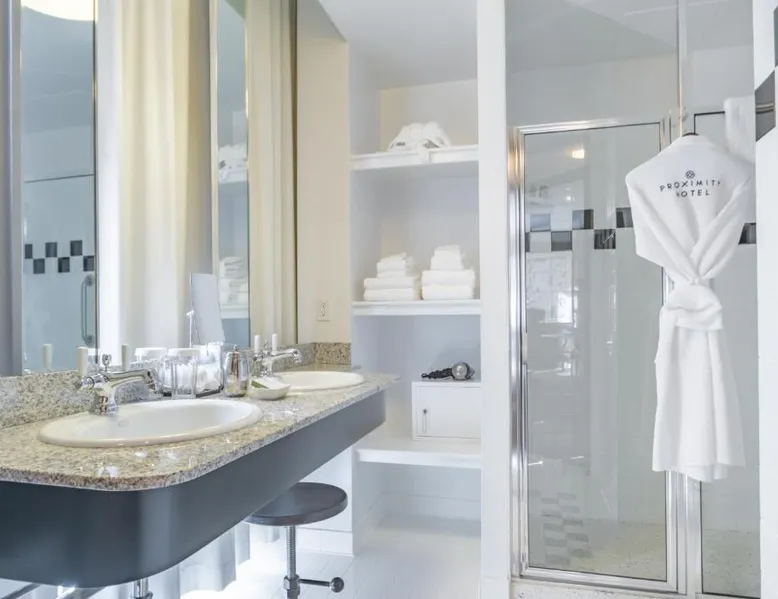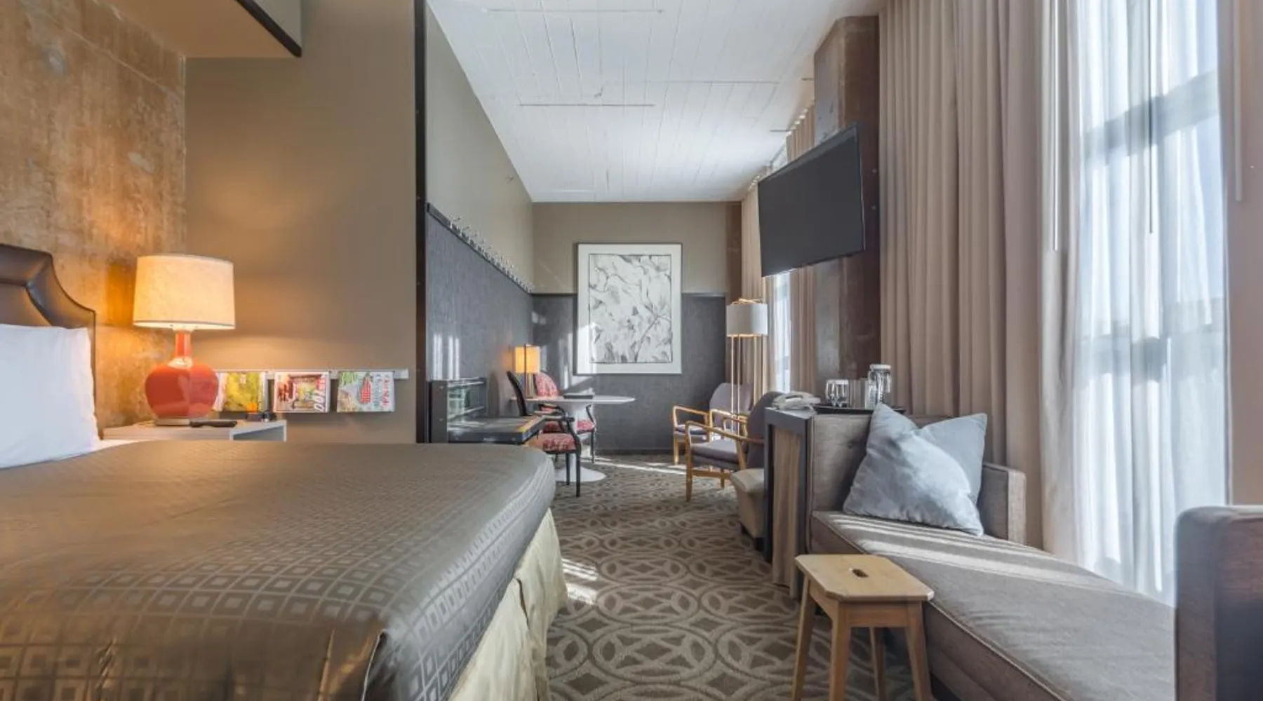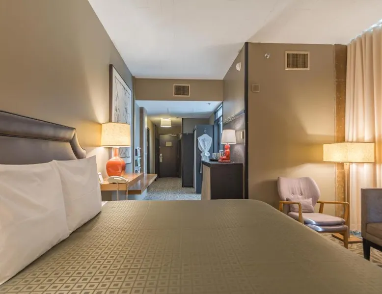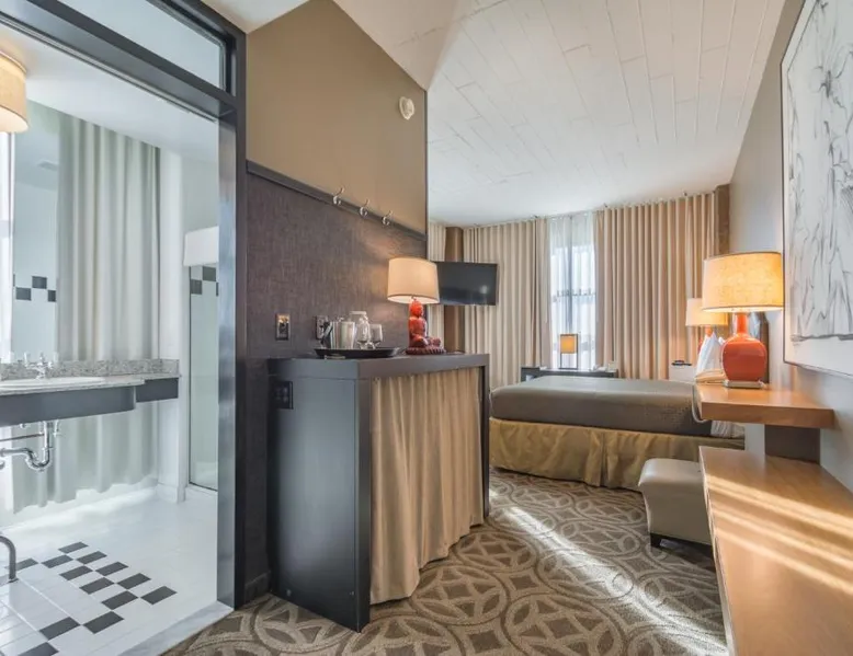 Offering an outdoor pool, free WiFi access, and a restaurant, this eco-friendly hotel is located 2.9 mi from the Greensboro, North Carolina city center. Greensboro Coliseum Complex is 3.3 mi from the Greensboro hotel. A microwave, small refrigerator, and coffee-making facilities are offered in the rooms at Proximity Hotel. A flat-screen cable TV and a seating area are featured as well as a desk. Print Works Bistro, which sources its food from local vendors, serves European-influenced cuisine. The restaurant is open daily for breakfast, lunch, and dinner. A wine menu and an outdoor terrace are offered for guests to enjoy. A fitness center, which offers bicycles for guests to explore the surrounding area, is open 24-hours a day. Wesley Long Hospital is 0.9 mi from the hotel. University of North Carolina – Greensboro is 5 minutes’ drive away from Hotel Proximity. Piedmont Triad International Airport is 11 minutes’ drive away. This room features large windows, high ceilings, and a sitting area with a flat-screen television. Extras include a stereo with CD player, microwave, and a small refrigerator.