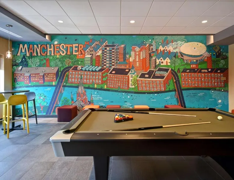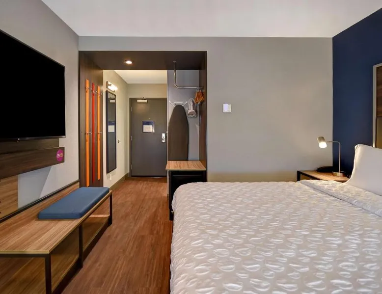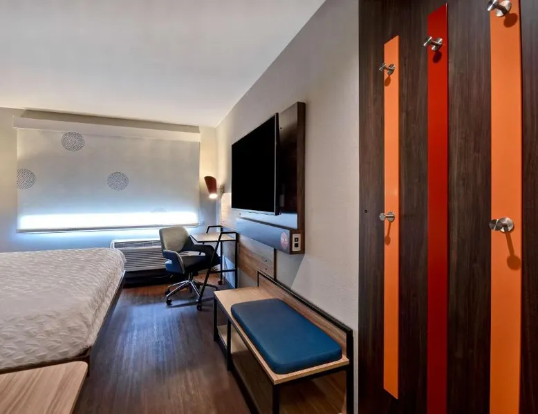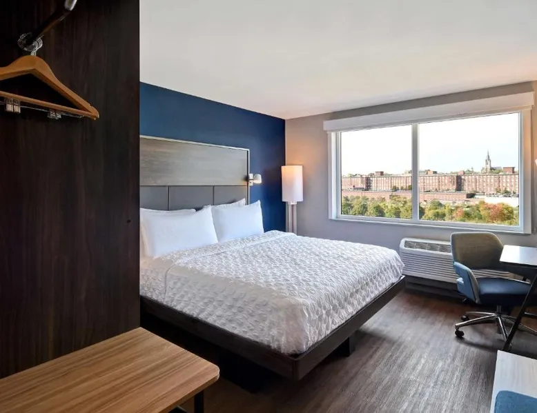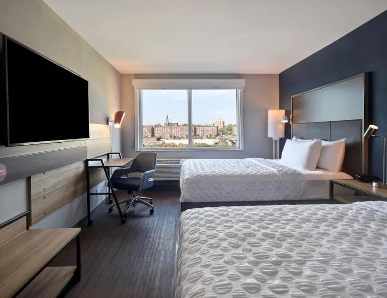 Comfortable Accommodations: Tru By Hilton Manchester Downtown in Manchester offers family rooms with air-conditioning, free WiFi, and amenities such as a work desk, refrigerator, and TV. Each room includes a shower, free toiletries, and a hairdryer. Facilities and Services: Guests can enjoy a fitness center, lounge, and games room. Additional facilities include a minimarket, electric vehicle charging station, business area, and outdoor seating. The hotel provides a 24-hour front desk, elevator, and paid on-site private parking. Dining Options: A buffet breakfast is available with full English or Irish options. Breakfast includes warm dishes, juice, fresh pastries, pancakes, cheese, and fruits. Location and Attractions: Located 5 mi from Manchester Boston Regional Airport, the hotel is near Mall Of New Hampshire (4.3 mi), State Park (2.1 mi), and an ice-skating rink. Guests appreciate the property staff and service support, room cleanliness, and convenient location. This quadruple room has air conditioning, heating and a TV. The unit has 2 beds.