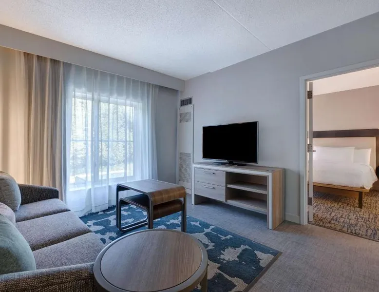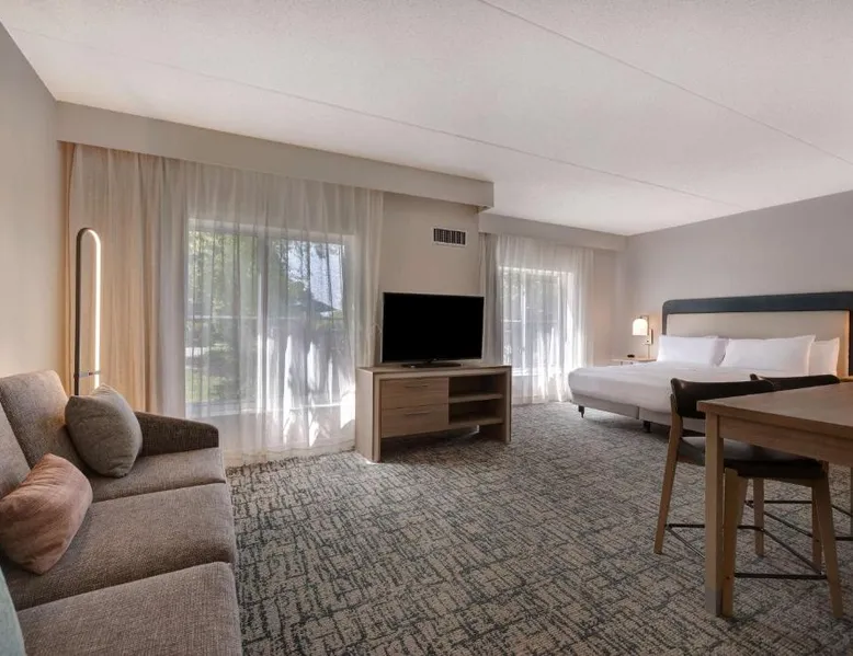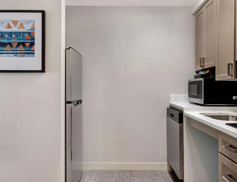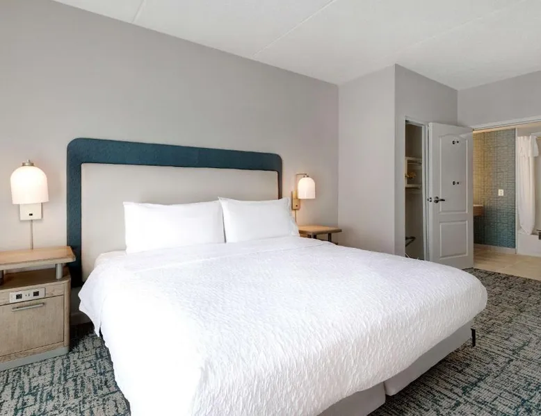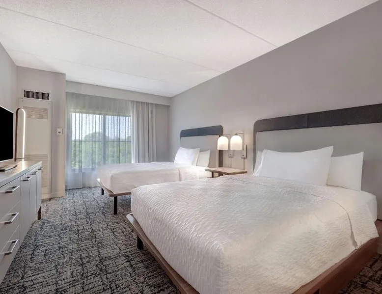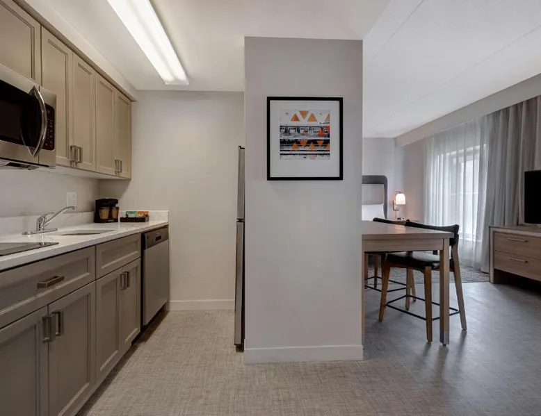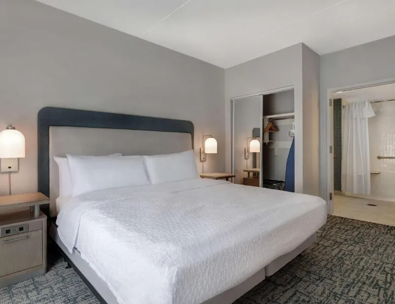 Comfortable Accommodations: Homewood Suites Lansdale in Lansdale offers family rooms with air-conditioning, refrigerators, microwaves, and free WiFi. Each room includes a kitchen with a stovetop, toaster, and dishwasher. Leisure Facilities: Guests can enjoy a year-round outdoor swimming pool, hot tub, fitness room, and outdoor seating area. Additional amenities include a minimarket, barbecue facilities, and a 24-hour front desk. Dining Experience: A buffet breakfast is served daily, featuring warm dishes, fresh pastries, pancakes, fruits, and juice. The property also offers a paid airport shuttle service and paid off-site parking. Nearby Attractions: Located 35 mi from Philadelphia International Airport, the hotel is close to Temple University (22 mi), Pennsylvania Convention Center (24 mi), and the Liberty Bell (24 mi). This suite has a bedroom with one king bed and a bedroom with two double beds.
