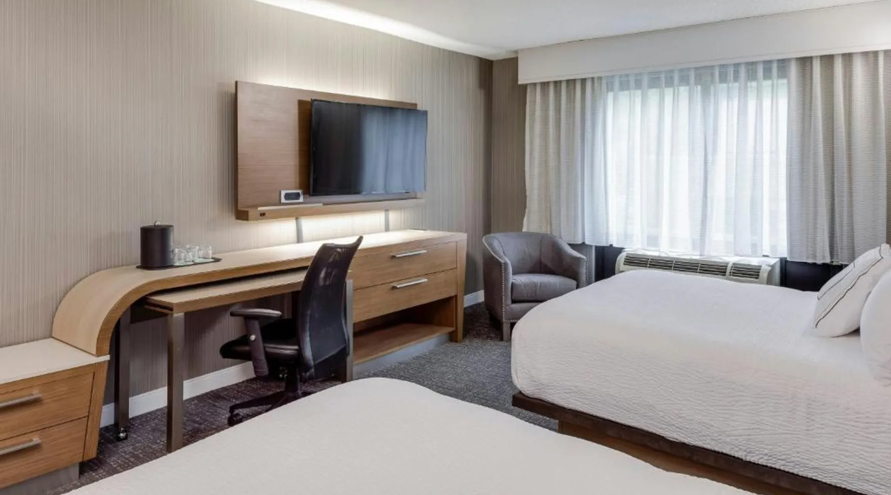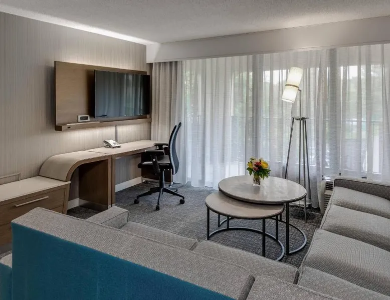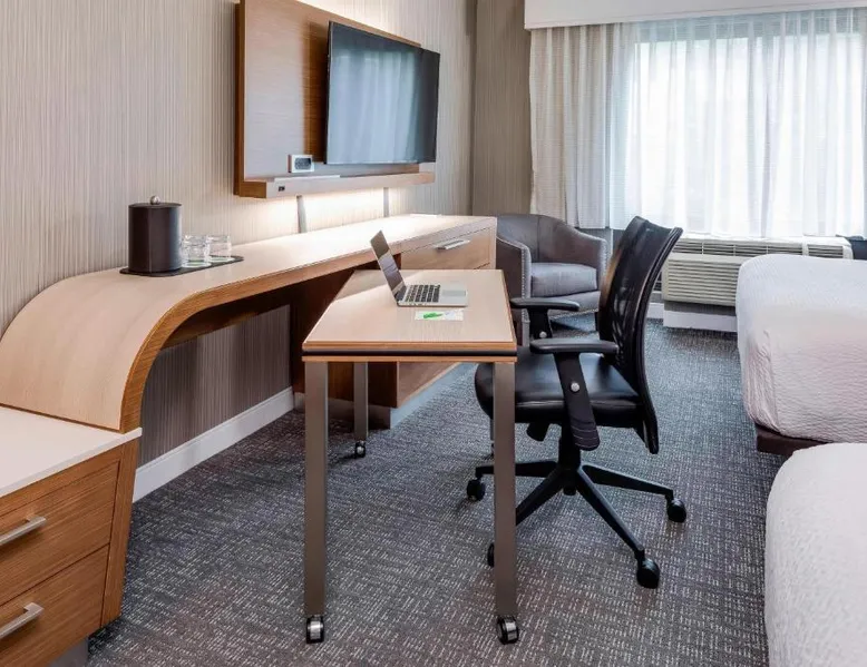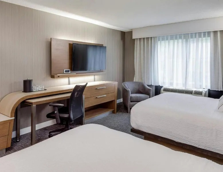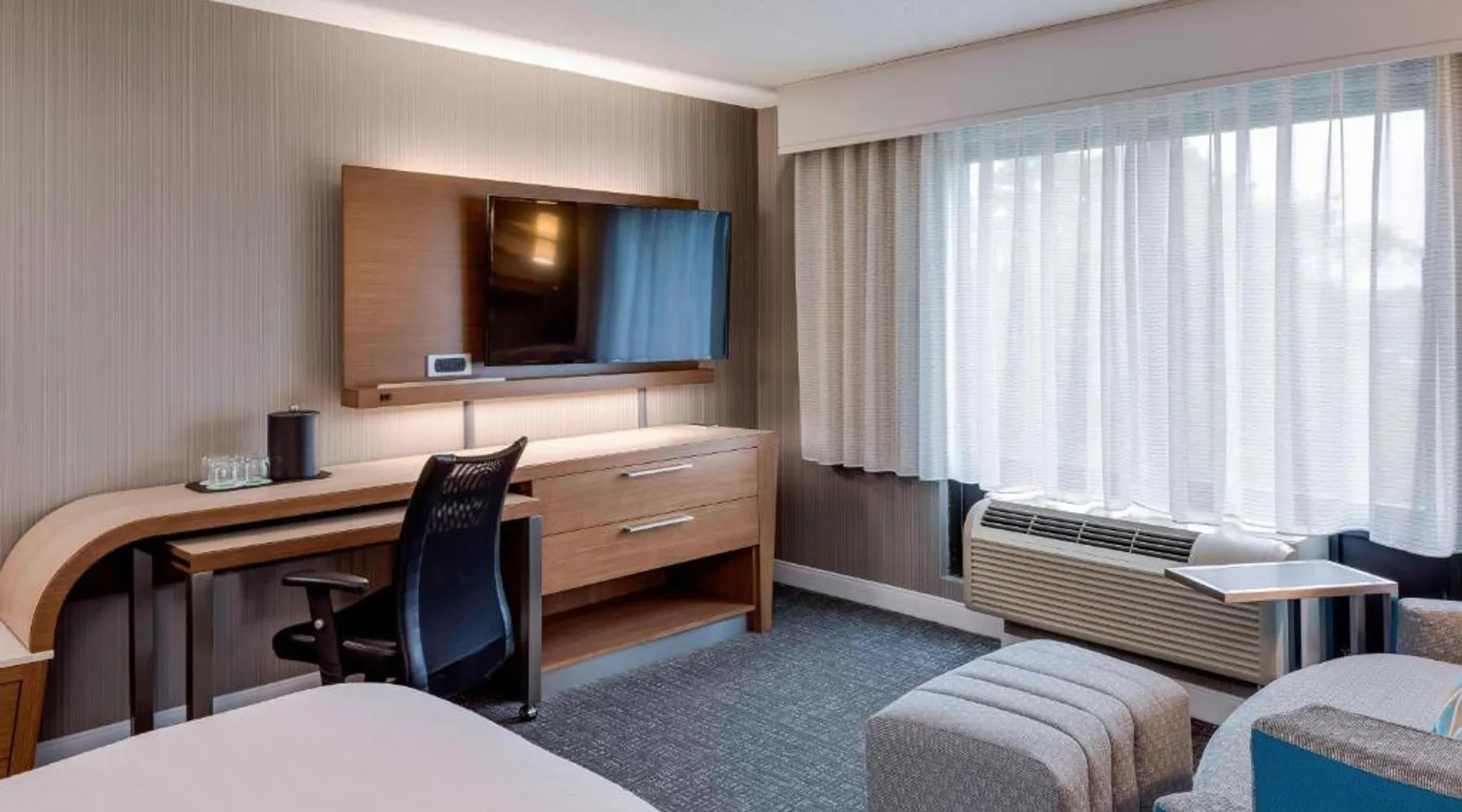 Comfortable Accommodations: Courtyard by Marriott Portsmouth in Portsmouth offers rooms with air-conditioning, balconies, private bathrooms, tea and coffee makers, hairdryers, refrigerators, work desks, microwaves, bath or showers, and TVs. Dining and Leisure: The hotel features a restaurant serving American cuisine for dinner, a bar, and an indoor swimming pool. Guests can also enjoy a fitness center and free on-site parking. Convenient Location: Located 3.7 mi from Portsmouth International Airport at Pease, the hotel is near attractions such as Water Country (5.6 mi) and Ogunquit Museum of American Art (16 mi). Guests appreciate the airport shuttle and the hotel’s convenient location. This room features a microwave, refrigerator, and a flat-screen TV.
