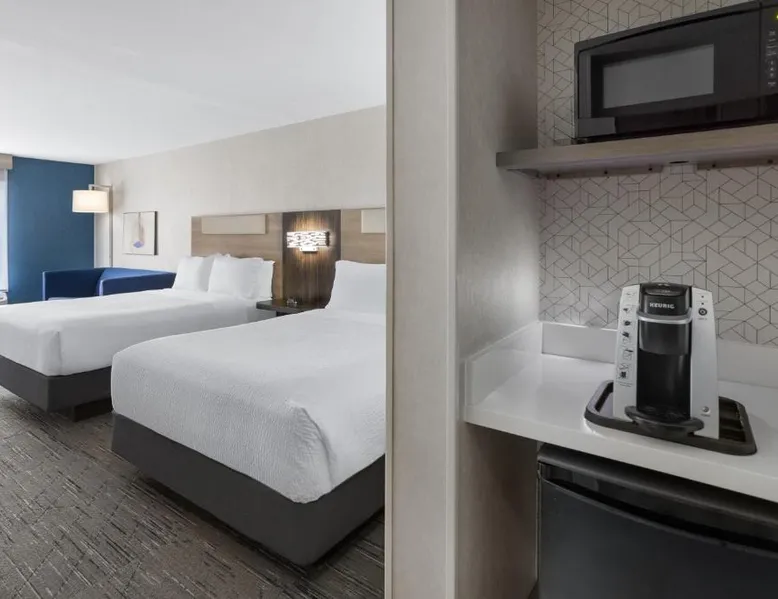 Comfortable Accommodations: Holiday Inn Express Hotel & Suites Brattleboro by IHG in Brattleboro offers air-conditioned rooms with private bathrooms, tea and coffee makers, and free WiFi. Each room includes a work desk, TV, and wardrobe. Leisure Facilities: Guests can enjoy a fitness center, indoor swimming pool, and outdoor fireplace. Additional amenities include a lounge, outdoor seating area, and a child-friendly buffet. Dining Options: A continental buffet breakfast is served daily, featuring fresh pastries, pancakes, fruits, and juice. The property also offers a minimarket and a business area. Location and Attractions: Located 63 mi from Lebanon Municipal Airport, the hotel is near attractions such as Fort Dummer State Park (4.3 mi) and Santa's Land USA (12 mi). Free on-site parking is available. This room features a flat-screen TV with cable channels, a microwave, and refrigerator.