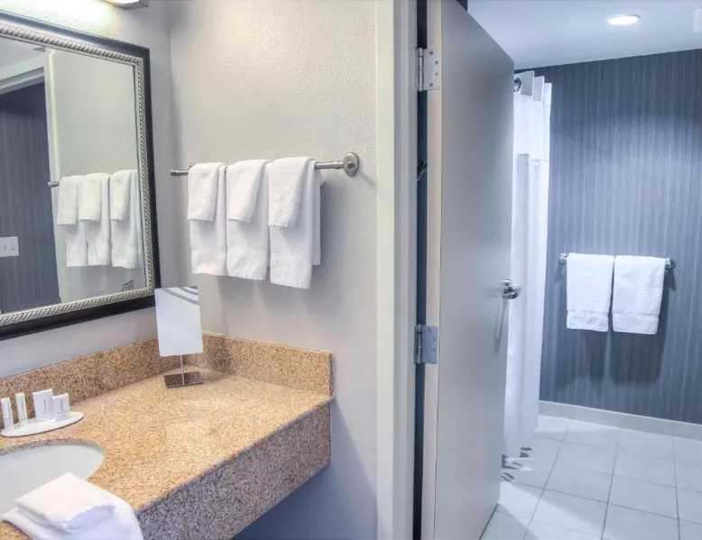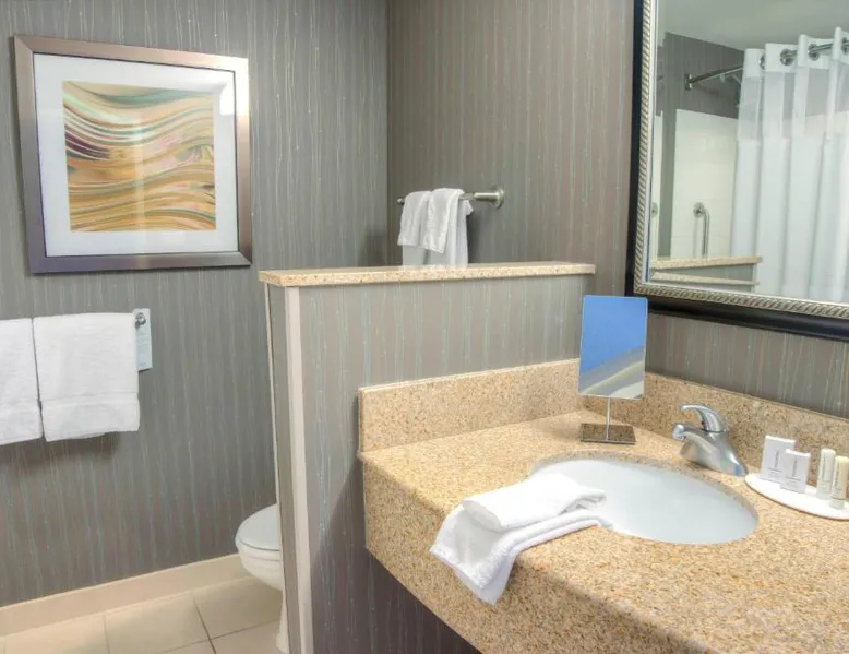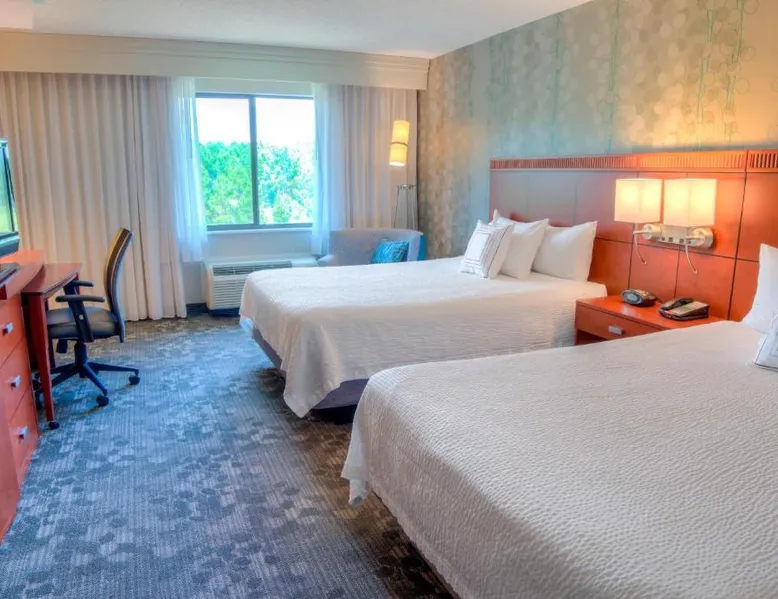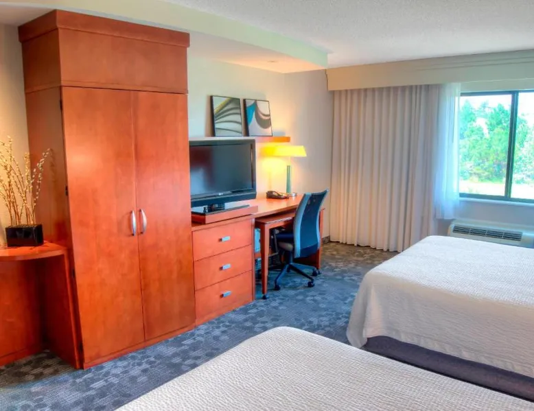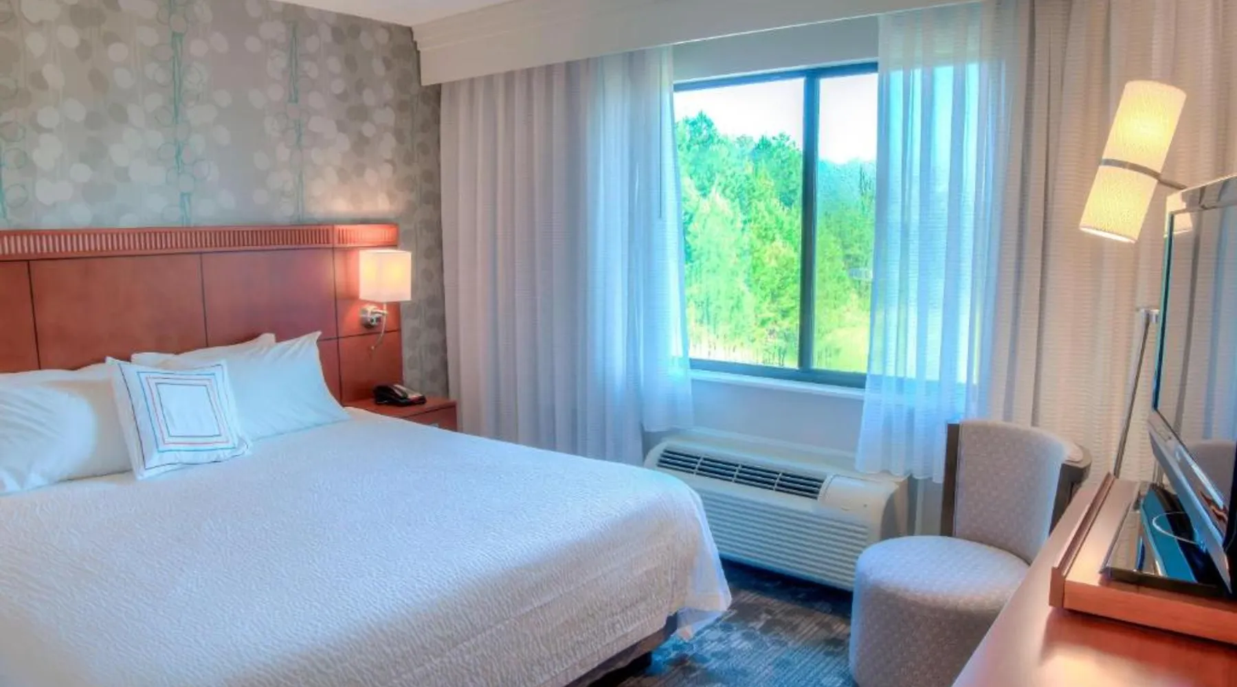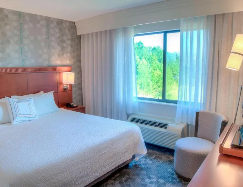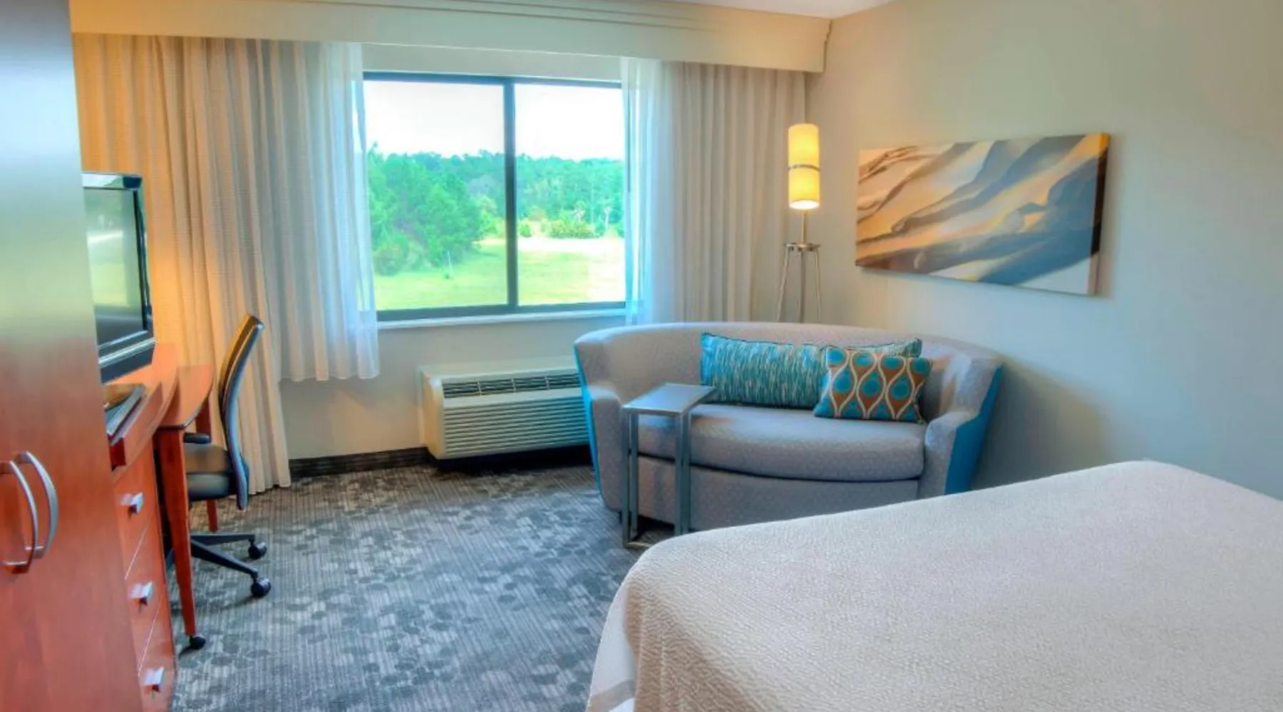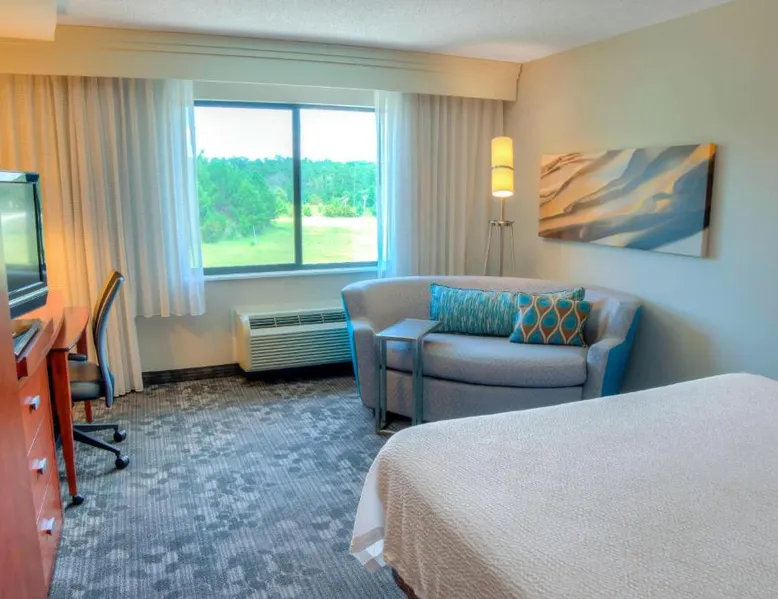 Comfortable Accommodations: Courtyard Mobile Spanish Fort/Eastern Shore in Spanish Fort offers air-conditioned rooms with private bathrooms, free WiFi, and modern amenities. Each room includes a work desk, sofa bed, and flat-screen TV. Exceptional Facilities: Guests can enjoy a fitness center, indoor swimming pool, terrace, and free bicycles. Additional facilities include a lounge, outdoor fireplace, hot tub, and 24-hour front desk. Dining Experience: The modern restaurant serves American cuisine for dinner and cocktails. Outdoor seating areas provide relaxing spaces. Convenient Location: Located 22 mi from Mobile Regional Airport, the hotel is near attractions such as USS Alabama Battleship Memorial Park (8.1 mi) and Mobile Civic Center (9.9 mi). This room features a flat-screen TV, small refrigerator, and coffee-making facilities. A desk is also included.