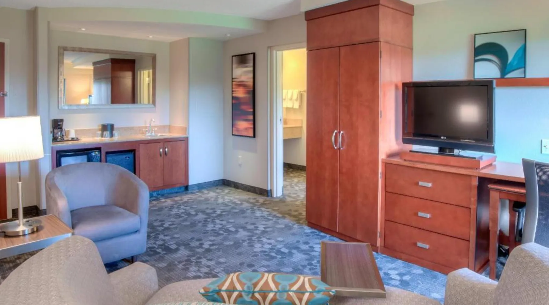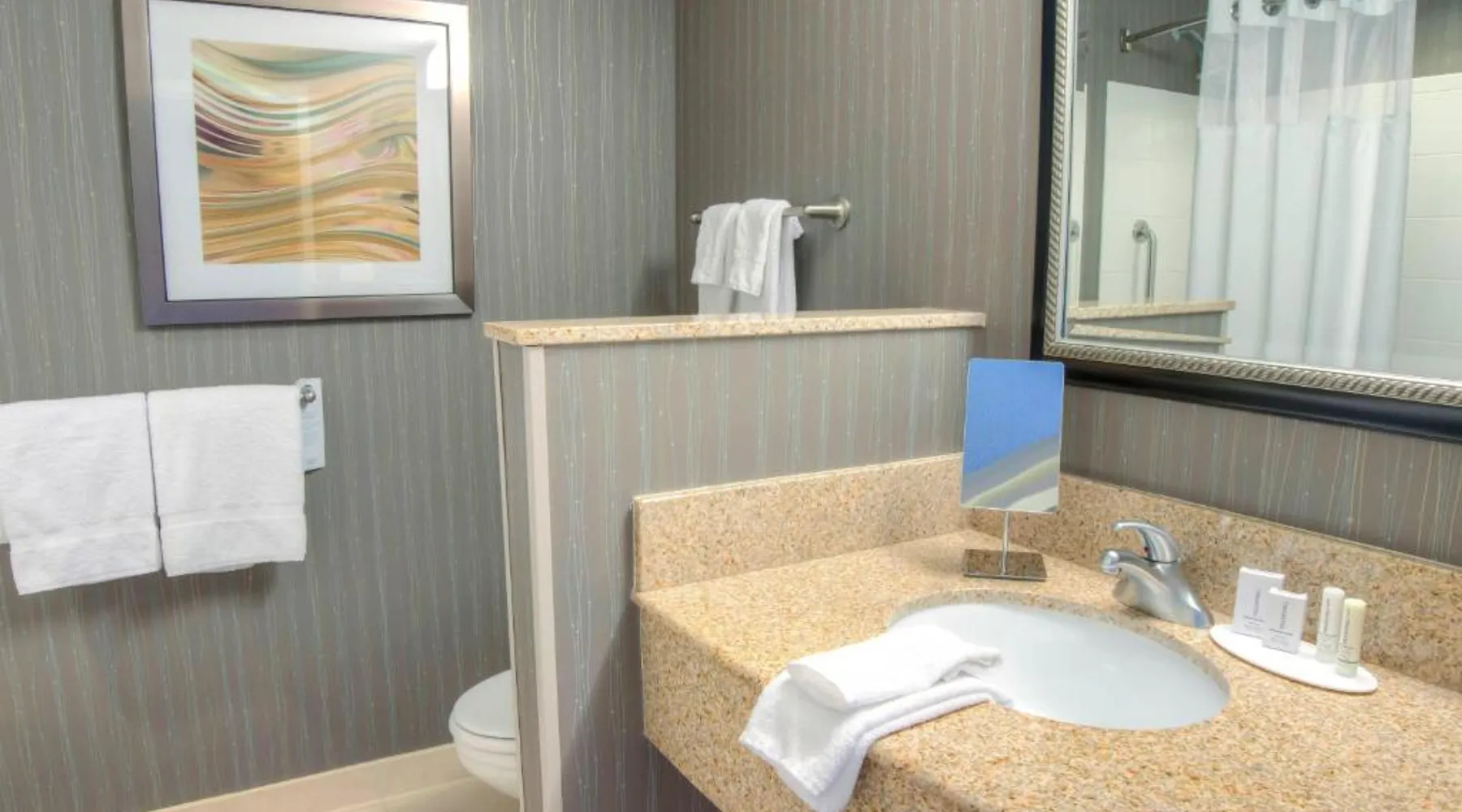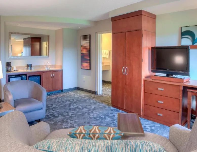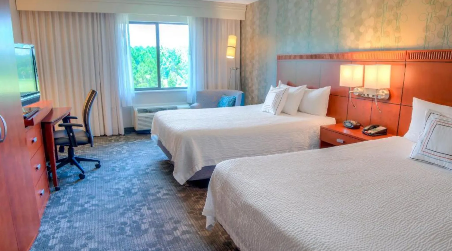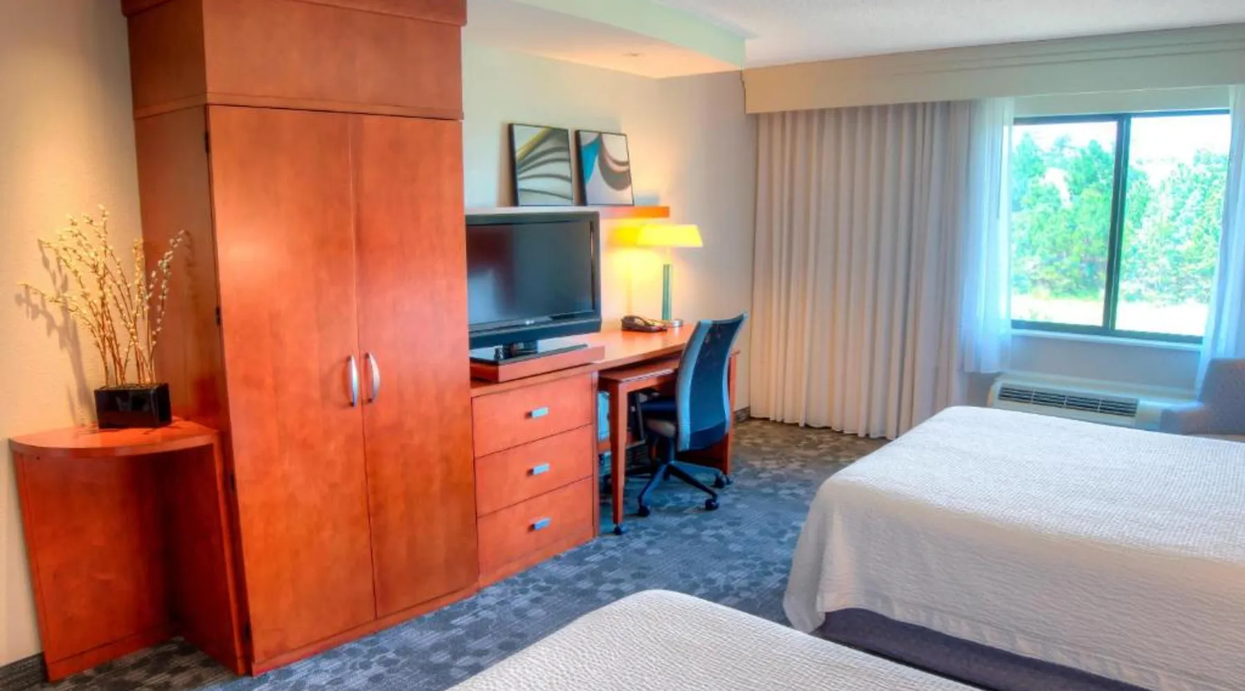 Comfortable Accommodations: Courtyard Mobile Spanish Fort/Eastern Shore in Spanish Fort offers air-conditioned rooms with private bathrooms, free WiFi, and modern amenities. Each room includes a work desk, sofa bed, and flat-screen TV. Exceptional Facilities: Guests can enjoy a fitness center, indoor swimming pool, terrace, and free bicycles. Additional facilities include a lounge, outdoor fireplace, hot tub, and 24-hour front desk. Dining Experience: The modern restaurant serves American cuisine for dinner and cocktails. Outdoor seating areas provide relaxing spaces. Convenient Location: Located 22 mi from Mobile Regional Airport, the hotel is near attractions such as USS Alabama Battleship Memorial Park (8.1 mi) and Mobile Civic Center (9.9 mi). This room features a flat-screen TV, small refrigerator, and coffee-making facilities. A desk is also included.