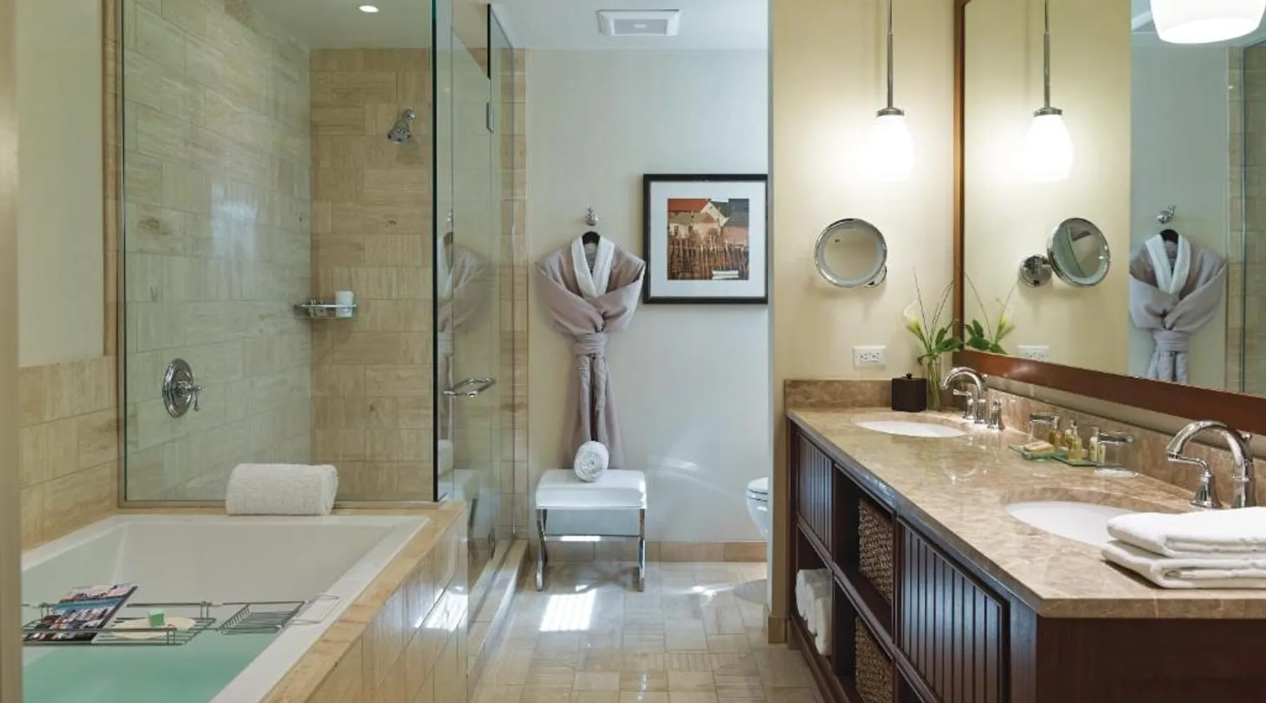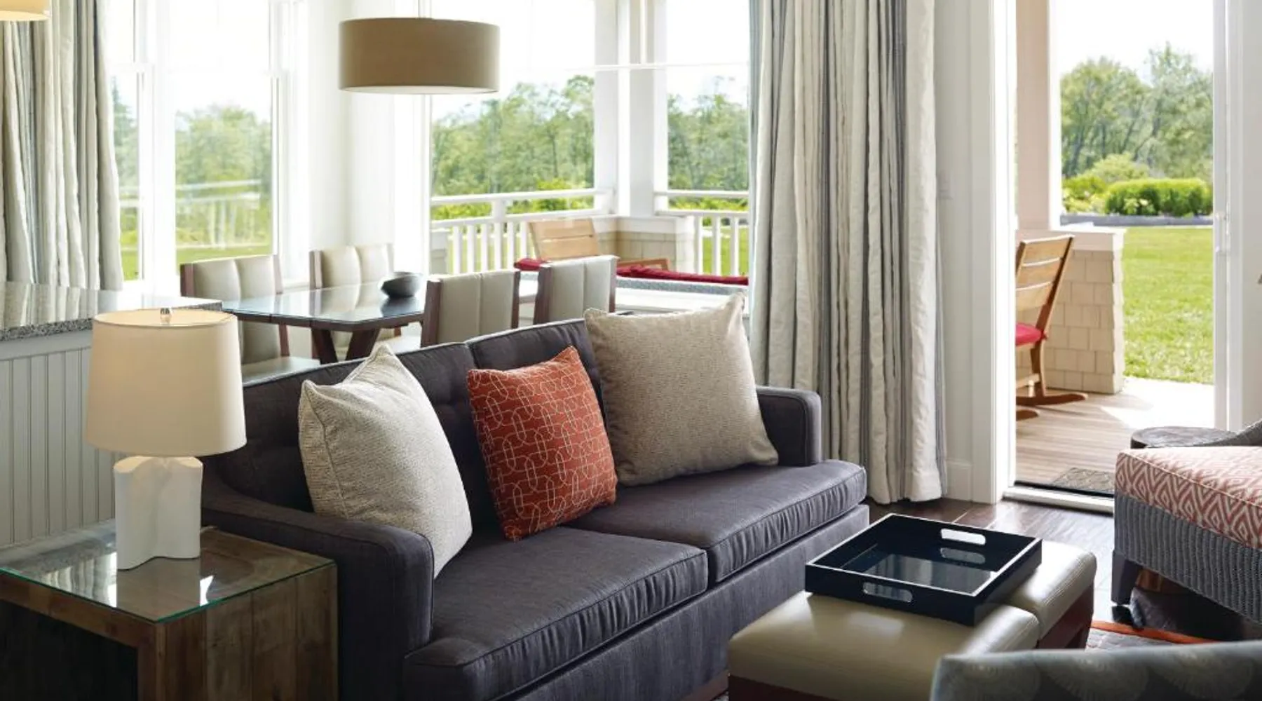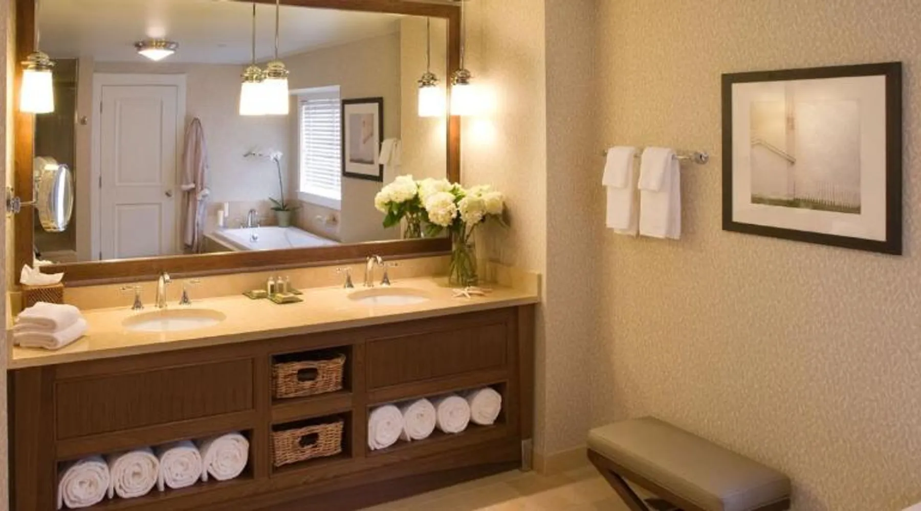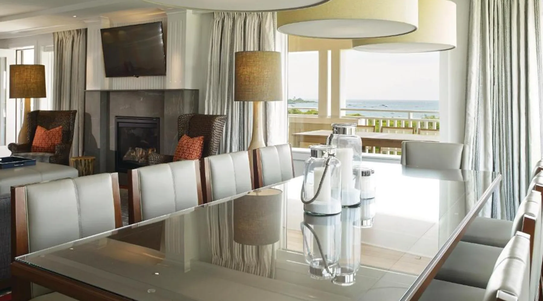 Comfortable Accommodations: Inn By the Sea in Cape Elizabeth offers family rooms with sea views, balconies, and private bathrooms. Each room includes air-conditioning, a work desk, and a flat-screen TV. Wellness and Leisure: Guests can enjoy spa facilities, a swimming pool with a view, fitness center, sun terrace, and garden. Additional amenities include a steam room, sauna, and yoga classes. Dining Experience: The traditional, romantic restaurant serves American cuisine with vegetarian, vegan, and gluten-free options. Brunch, lunch, and dinner are available, alongside cocktails at the bar. Location and Attractions: Located 9.3 mi from Portland International Jetport, the hotel is a 12-minute walk from Crescent Beach. Nearby attractions include Merrill Auditorium and Portland Observatory. This suite offers an ocean view and has a large bathroom.