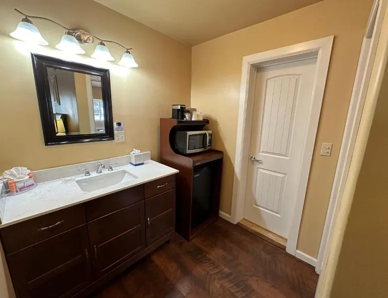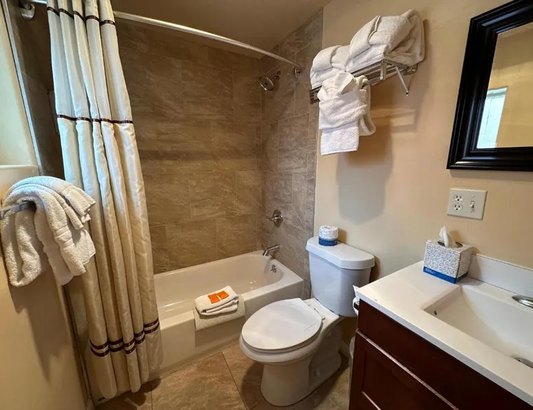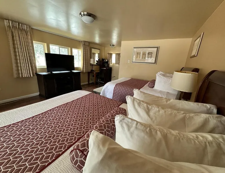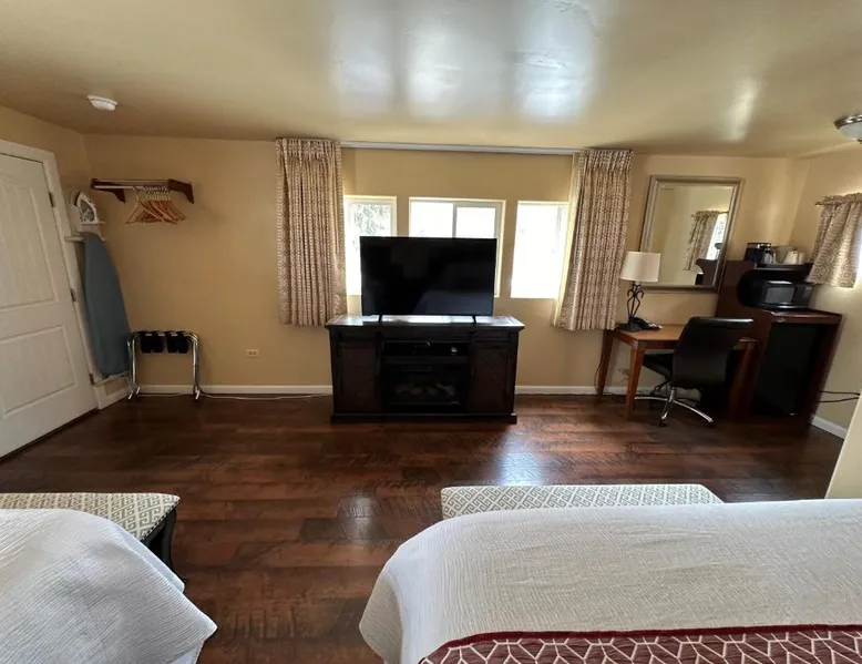 Comfortable Accommodations: Abram Inn & Suites in Ouray offers family rooms with private bathrooms, air-conditioning, and mountain views. Each room includes a tea and coffee maker, refrigerator, and free toiletries. Essential Facilities: Guests enjoy free WiFi, private and express check-in and check-out services, an outdoor fireplace, and an outdoor seating area. Additional amenities include a work desk, sofa bed, and parquet floors. Breakfast and Parking: A continental and American breakfast is served daily. Free on-site private parking is available. Activities and Location: Located 37 mi from Montrose Regional Airport, the inn is near winter sports and hiking. Guests appreciate the convenient location, room comfort, and cleanliness. The fireplace is the standout feature of this suite. The air-conditioned suite has 2 bedrooms and 1 bathroom with a bath and a shower. The suite features a tea and coffee maker, parquet floors, heating, as well as a flat-screen TV with satellite channels. The unit has 3 beds.