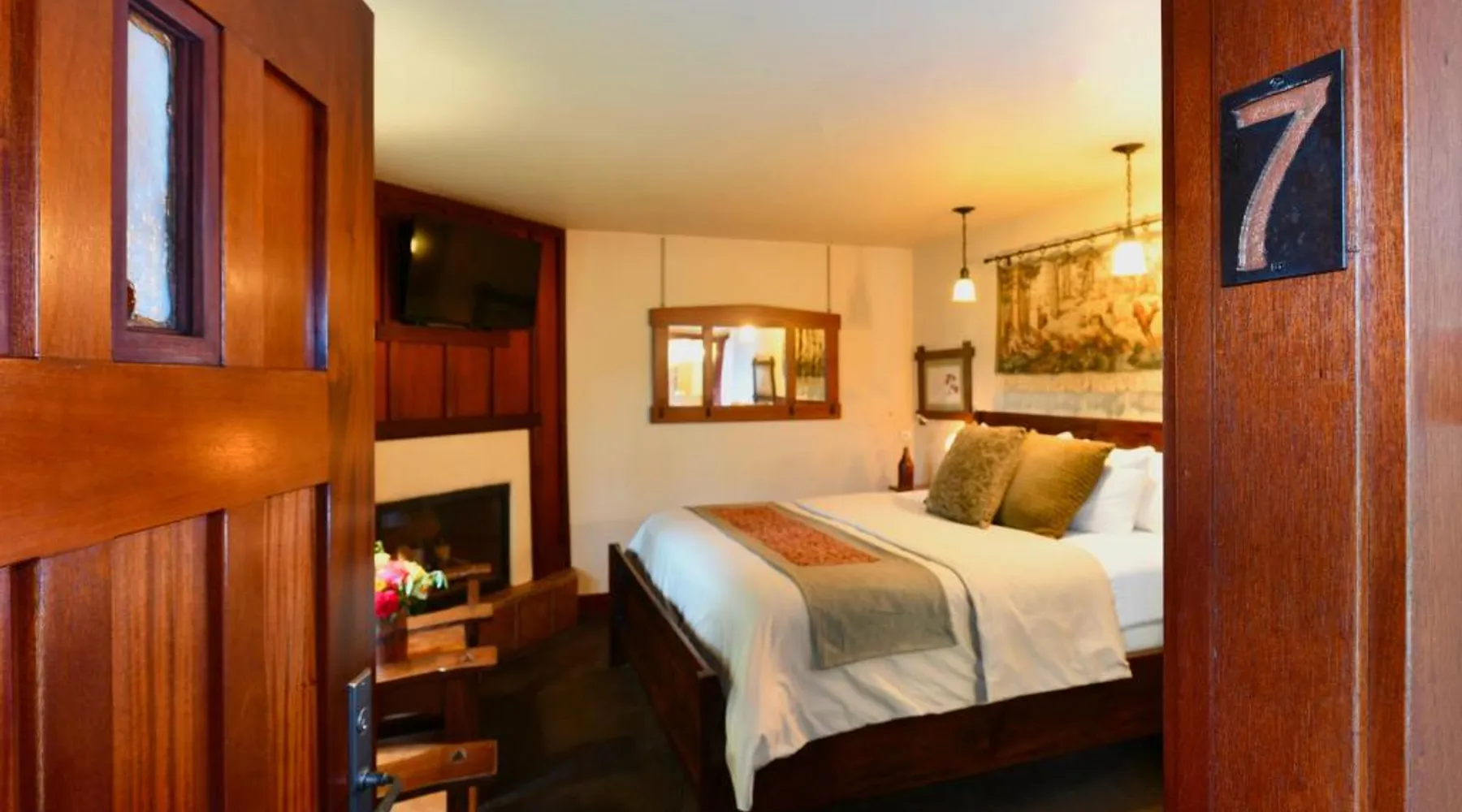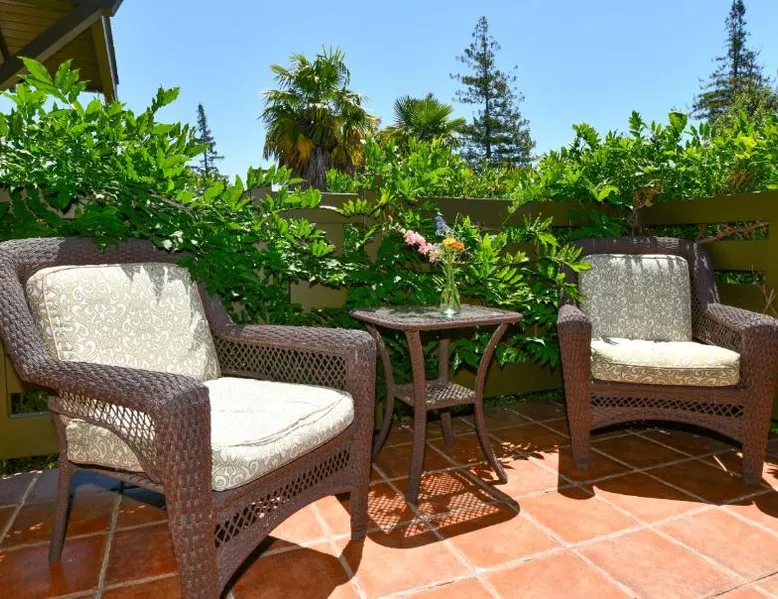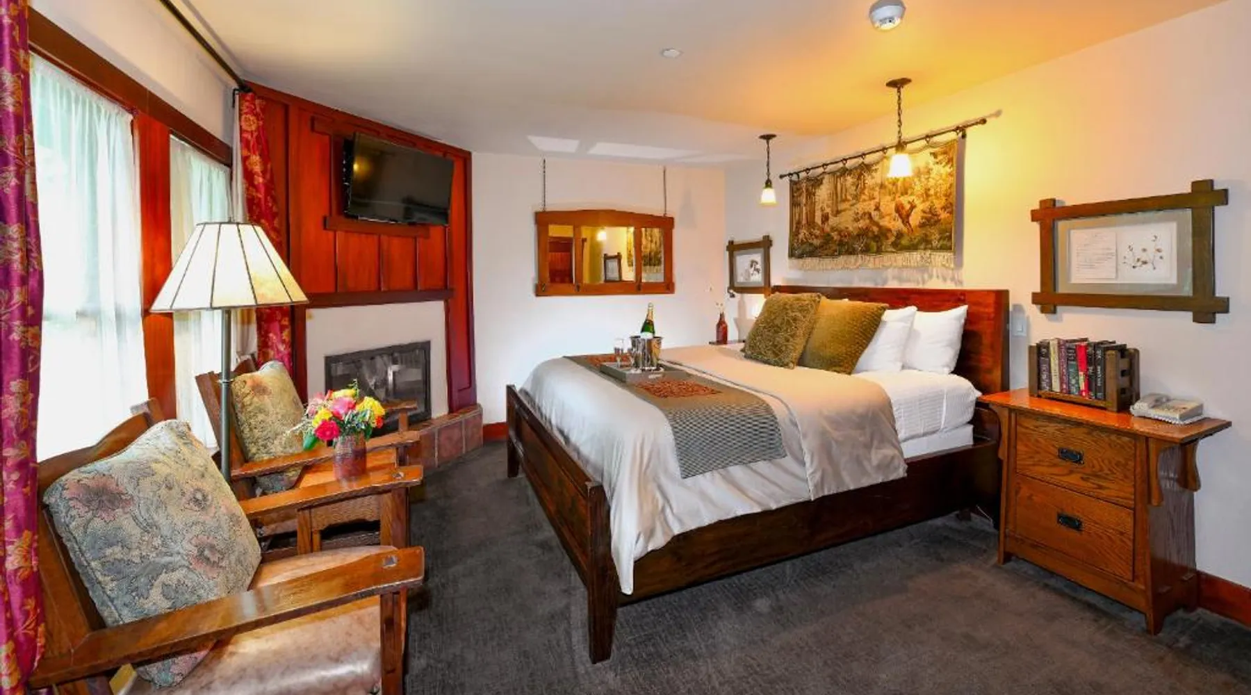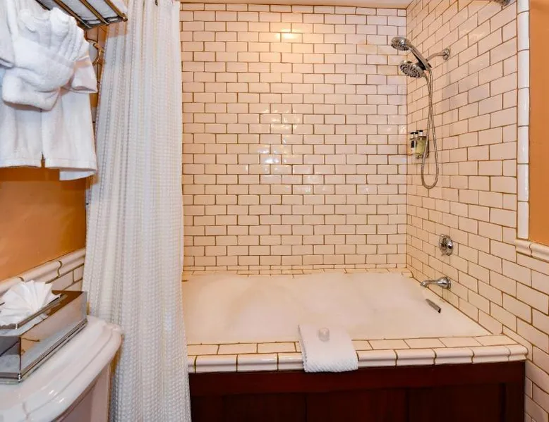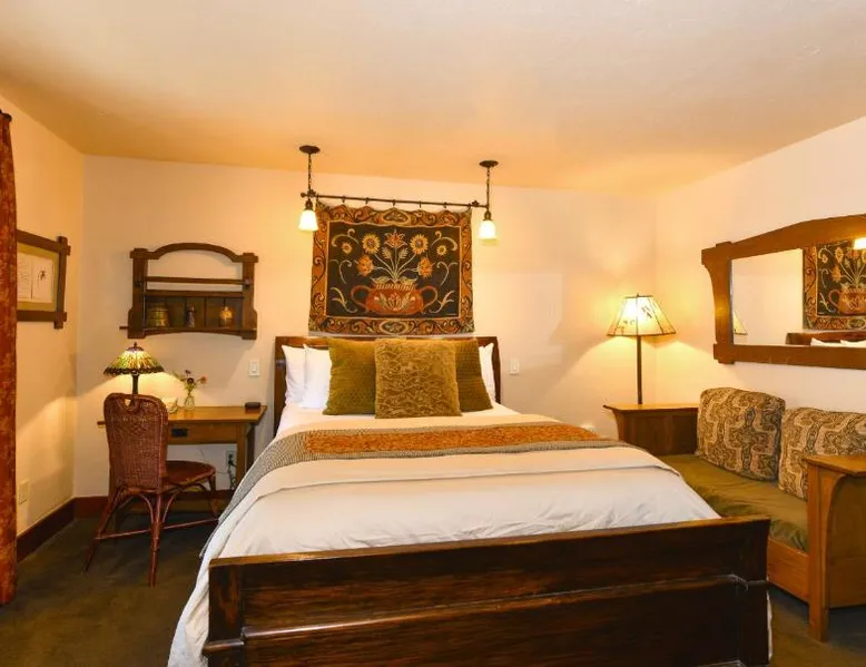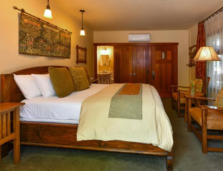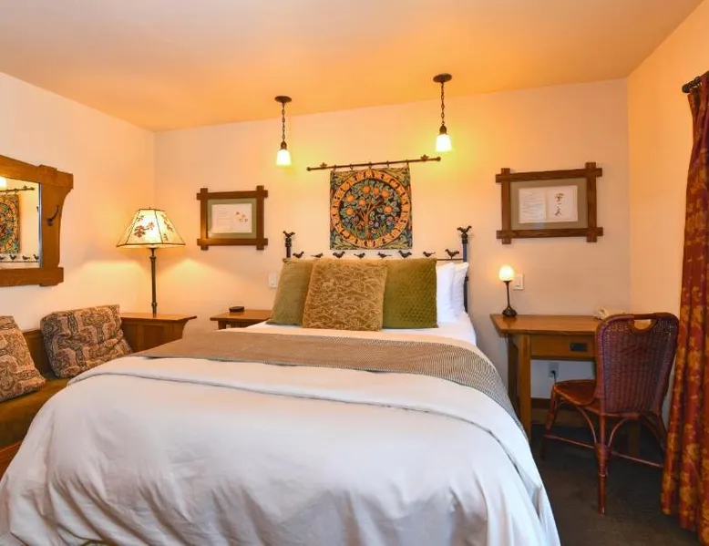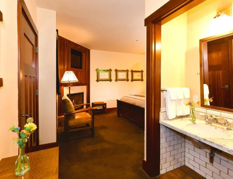 This bed and breakfast is located in Downtown Napa, California, easy walking distance to tasting rooms, restaurants, shops, and the Uptown Theater. A free full breakfast and evening wine and snacks are provided daily. Blackbird Inn serves freshly baked cookies every day. Free water, coffee, tea and soft drinks are available throughout the day. Guests may use the concierge services to get help selecting restaurants and wineries. Directly across the parking lot from the Arts and Crafts Blackbird Inn, is the Finch Guest House, a historic 1890's Queen Anne. Both buildings are renowned locally for their exquisite architecture, woodwork, and stained glass windows. Both share the property's gardens, gazebo and free parking. Guest rooms at Blackbird Inn are individually decorated. All offer a private bathroom. Some rooms offer: gas fireplaces, private patios or balconies. Some bathrooms have luxurious jacuzzi or bubble tubs. Many area wineries, the Napa Valley Wine Train, and the Oxbow Public Market are only a short distance from Blackbird Inn. This double room features tile/marble floor and bathrobe. This room is also known as "Deluxe King Spa with Fireplace".