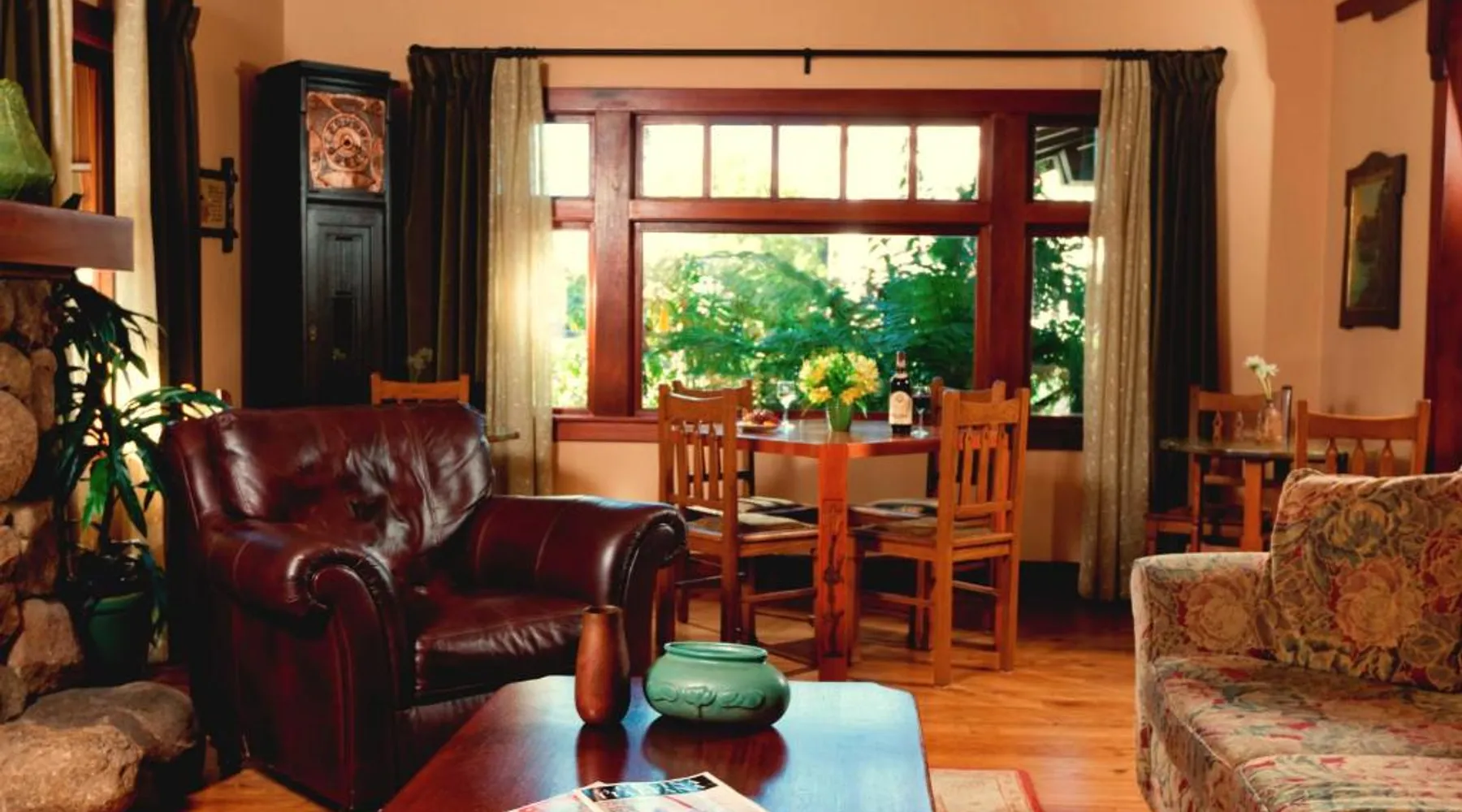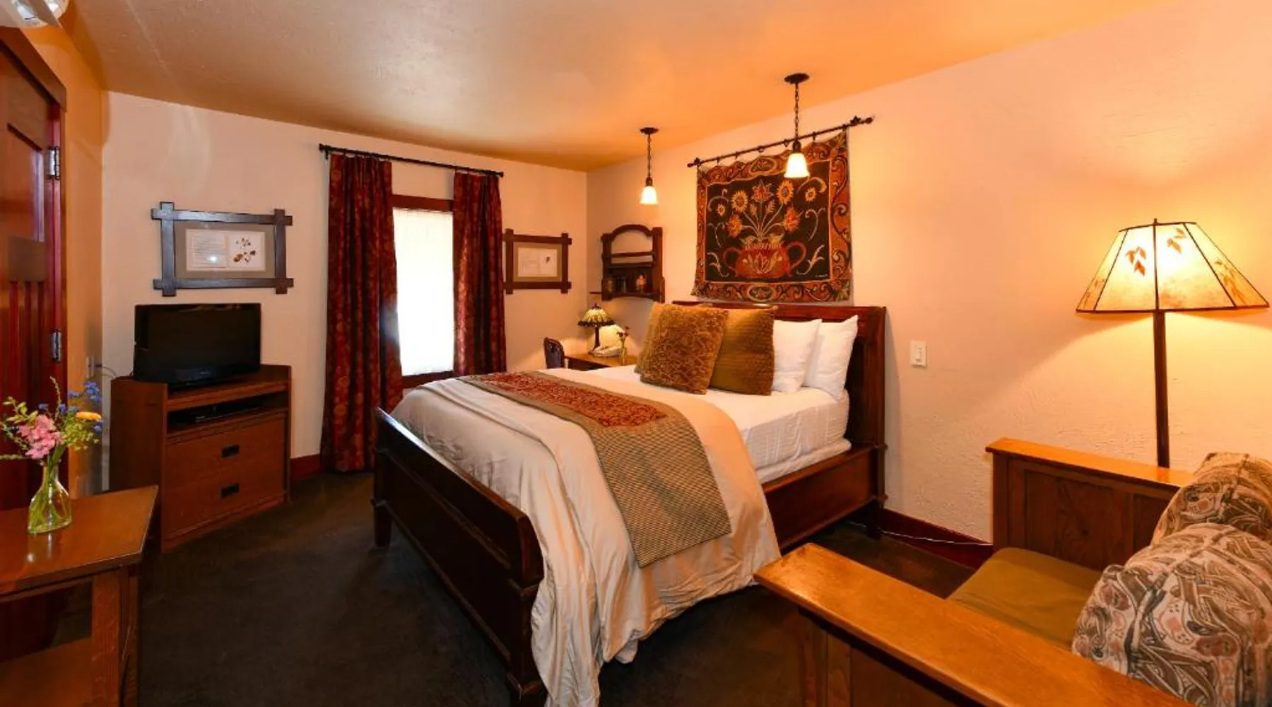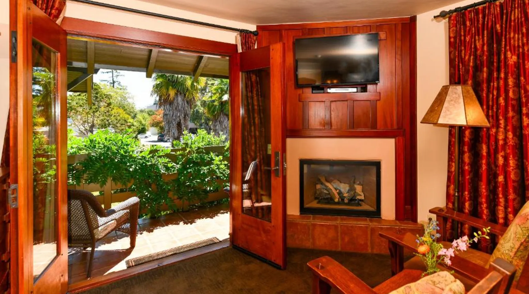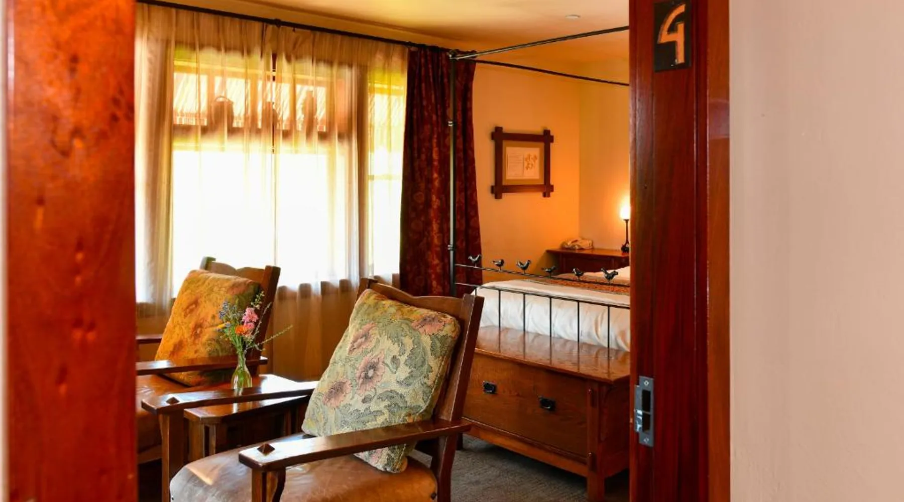 This bed and breakfast is located in Downtown Napa, California, easy walking distance to tasting rooms, restaurants, shops, and the Uptown Theater. A free full breakfast and evening wine and snacks are provided daily. Blackbird Inn serves freshly baked cookies every day. Free water, coffee, tea and soft drinks are available throughout the day. Guests may use the concierge services to get help selecting restaurants and wineries. Directly across the parking lot from the Arts and Crafts Blackbird Inn, is the Finch Guest House, a historic 1890's Queen Anne. Both buildings are renowned locally for their exquisite architecture, woodwork, and stained glass windows. Both share the property's gardens, gazebo and free parking. Guest rooms at Blackbird Inn are individually decorated. All offer a private bathroom. Some rooms offer: gas fireplaces, private patios or balconies. Some bathrooms have luxurious jacuzzi or bubble tubs. Many area wineries, the Napa Valley Wine Train, and the Oxbow Public Market are only a short distance from Blackbird Inn. This double room features tile/marble floor and bathrobe. This room is also known as "Deluxe King Spa with Fireplace".
