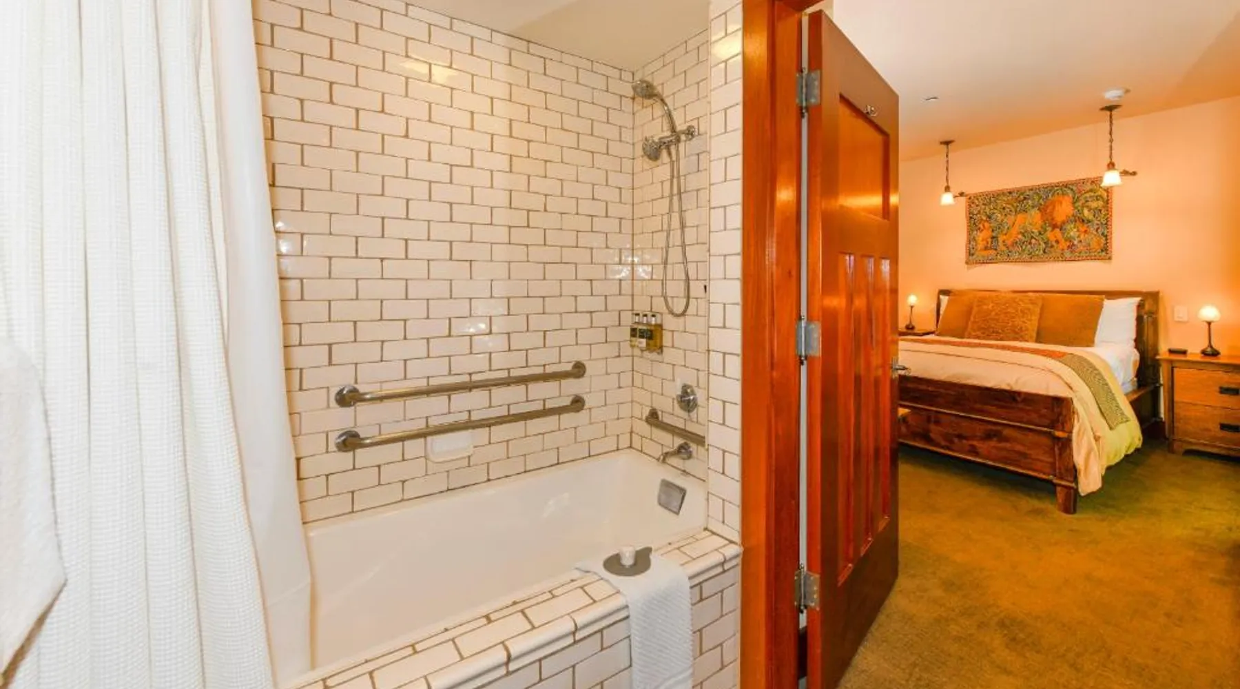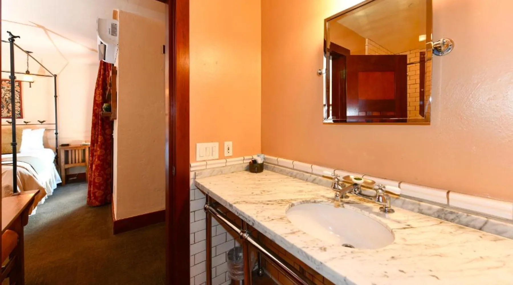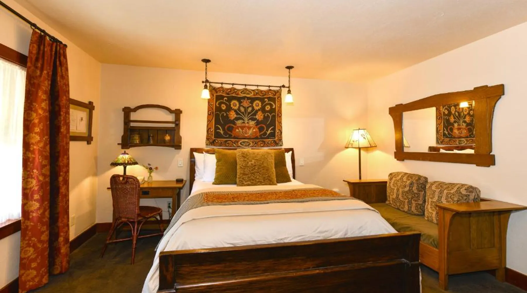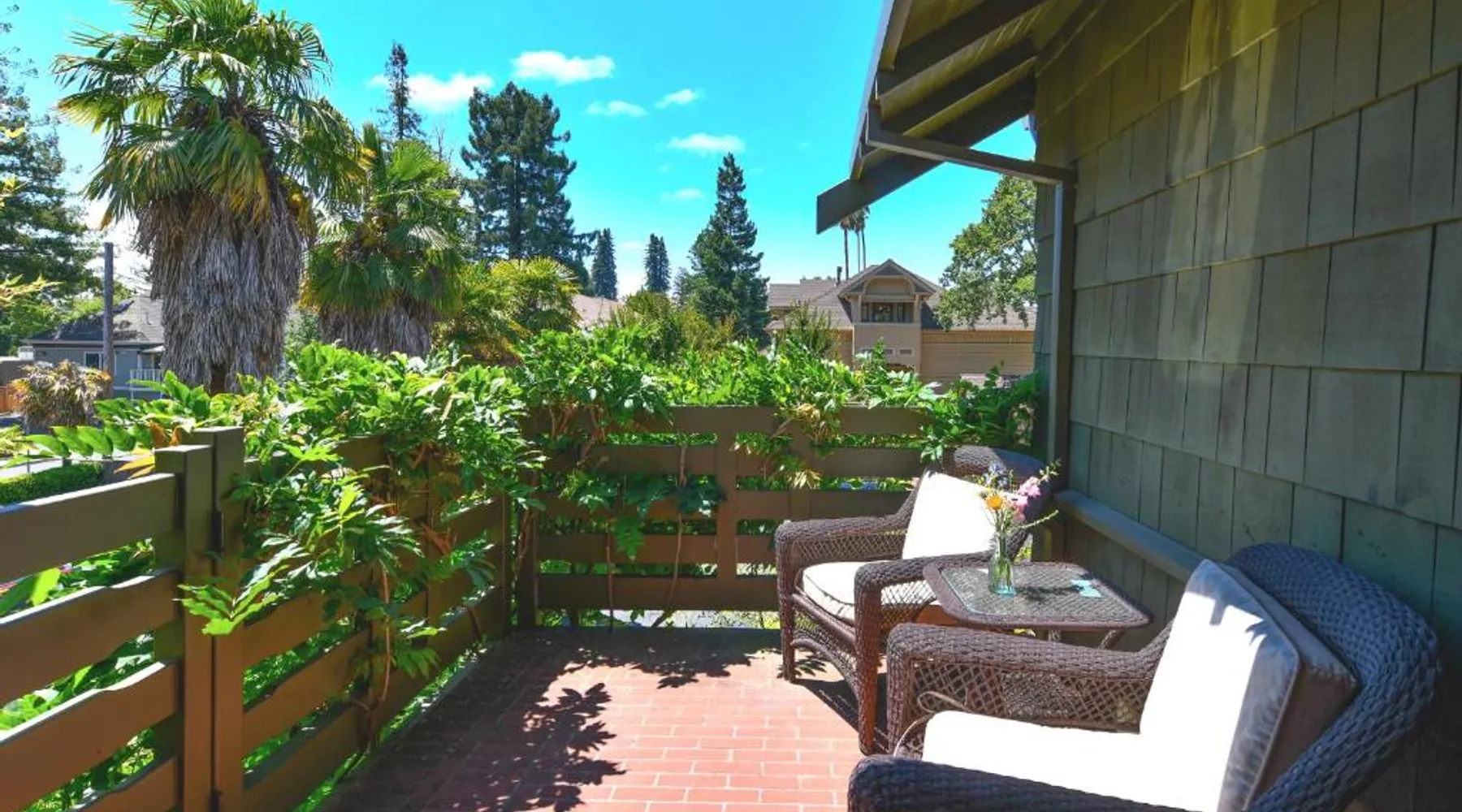 This bed and breakfast is located in Downtown Napa, California, easy walking distance to tasting rooms, restaurants, shops, and the Uptown Theater. A free full breakfast and evening wine and snacks are provided daily. Blackbird Inn serves freshly baked cookies every day. Free water, coffee, tea and soft drinks are available throughout the day. Guests may use the concierge services to get help selecting restaurants and wineries. Directly across the parking lot from the Arts and Crafts Blackbird Inn, is the Finch Guest House, a historic 1890's Queen Anne. Both buildings are renowned locally for their exquisite architecture, woodwork, and stained glass windows. Both share the property's gardens, gazebo and free parking. Guest rooms at Blackbird Inn are individually decorated. All offer a private bathroom. Some rooms offer: gas fireplaces, private patios or balconies. Some bathrooms have luxurious jacuzzi or bubble tubs. Many area wineries, the Napa Valley Wine Train, and the Oxbow Public Market are only a short distance from Blackbird Inn. This double room features tile/marble floor and bathrobe. This room is also known as "Deluxe King Spa with Fireplace".