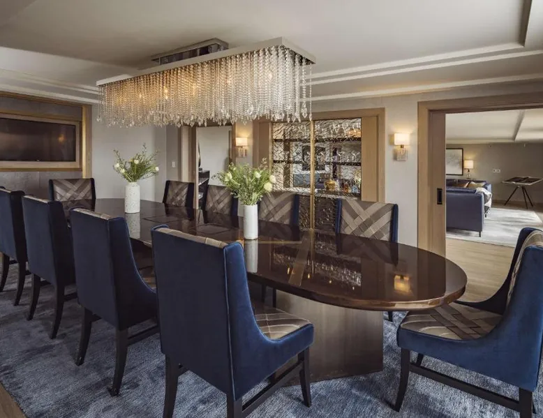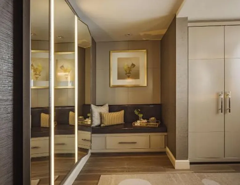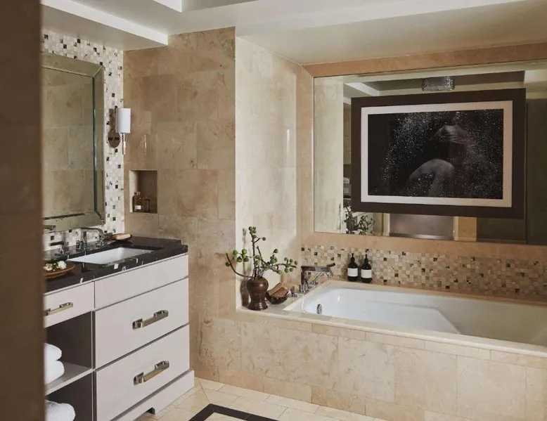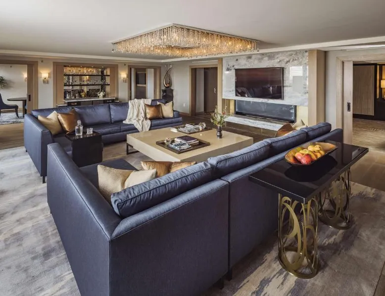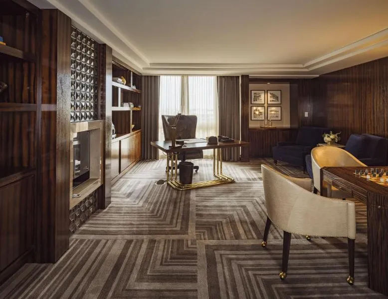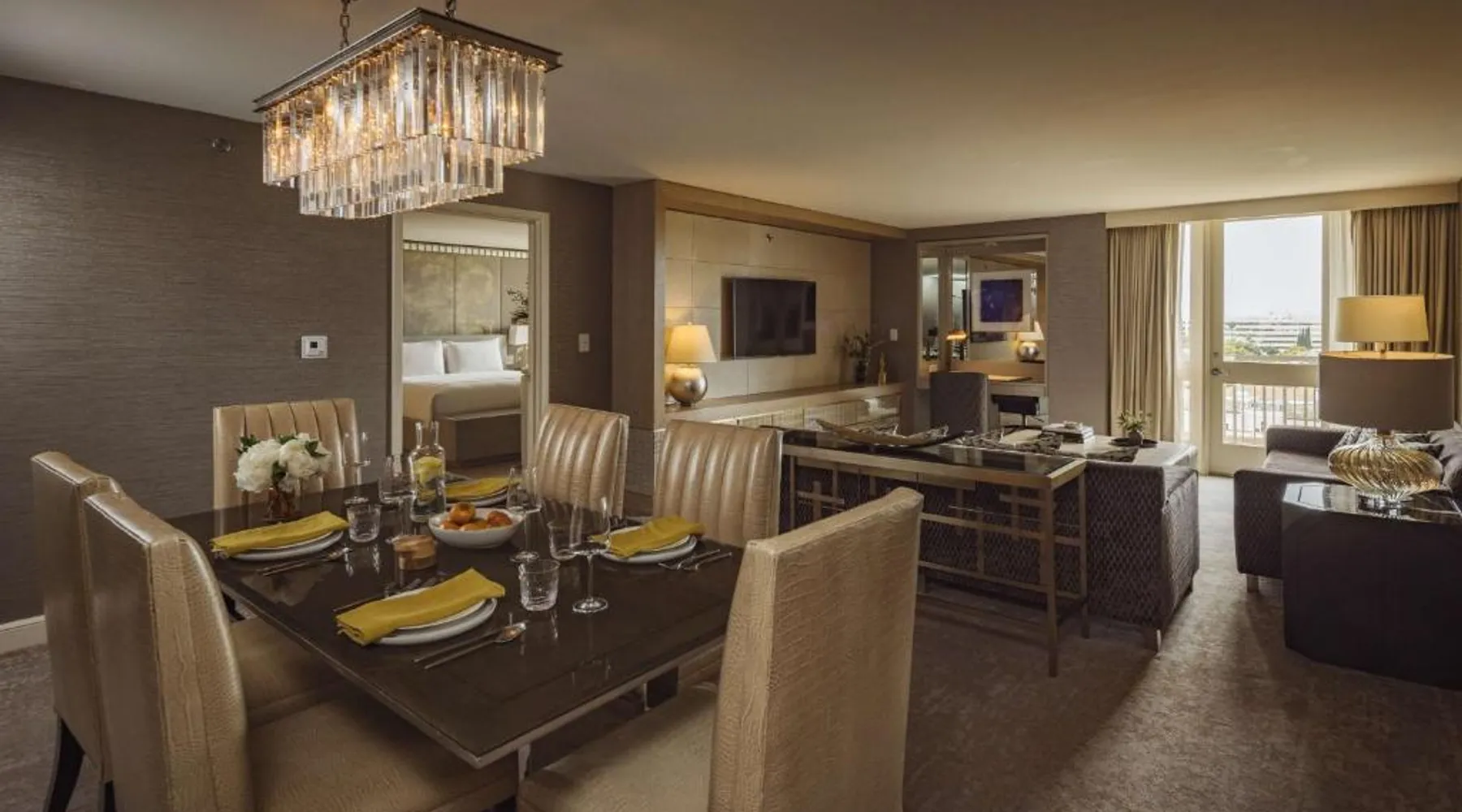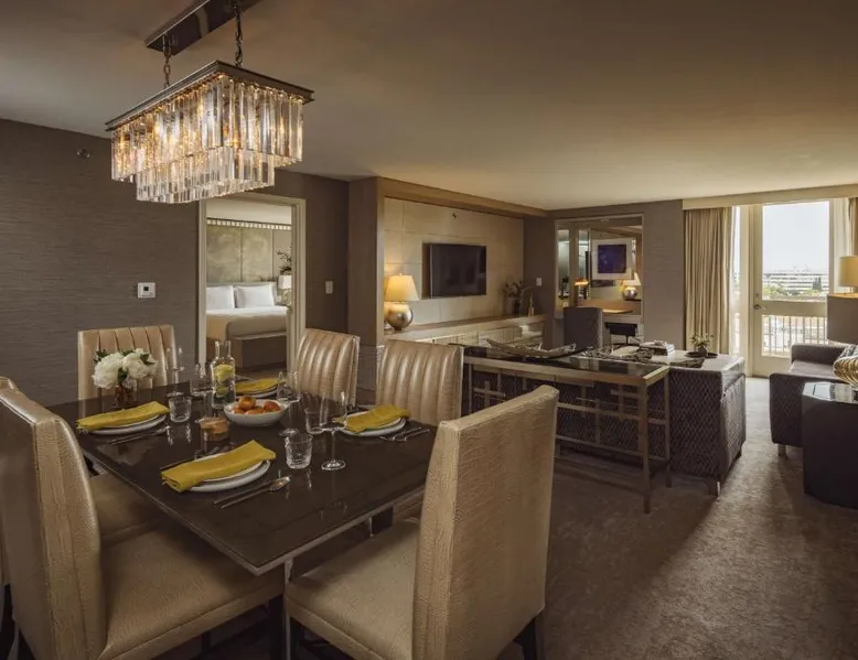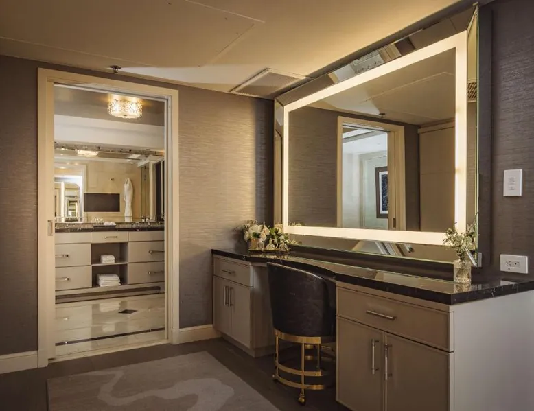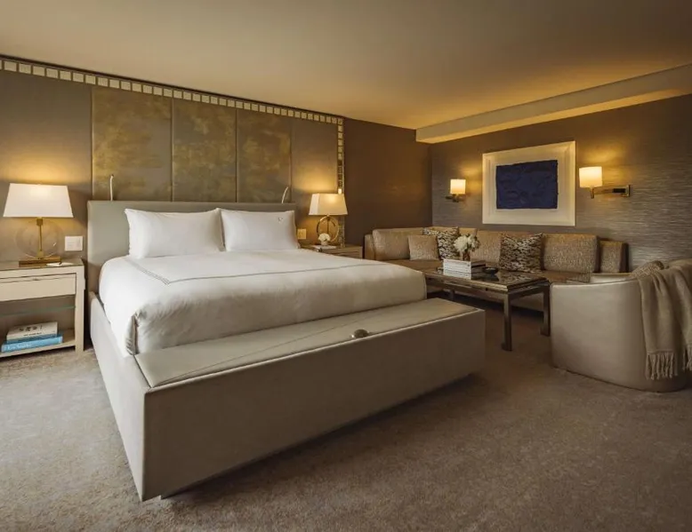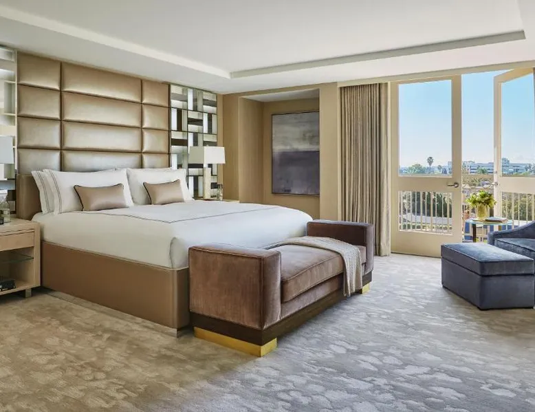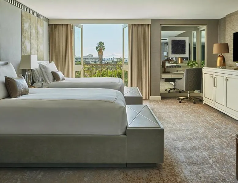 Nestled on a palm-lined residential boulevard in the heart of Beverly Hills, L'Ermitage Beverly Hills is a luxurious, independent five-star hotel. Renowned for its understated luxury, the hotel is the longest-tenured all-suite hotel with a Forbes Five-Star rating in the world. It's also recognized with MICHELIN Two Keys and AAA Five Diamonds. Offering a residential-style experience, L'Ermitage Beverly Hills preserves the elegance of its original design. Suites are appointed in a sophisticated palette of calming neutral tones and offer all the comforts guests would expect of a private luxury residence. The 116-suite hotel features several of the largest and most luxurious suites in Beverly Hills, including the impressive L'Ermitage Suite, spanning up to 4,450 square feet and featuring outstanding attributes such as a private screening room, spa treatment room, and personal office with a fireplace. Overlooking the lush Hollywood Hills on one side and Downtown LA's dynamic skyline on the other, The Canopy at L'Ermitage is an awe-inspired rooftop retreat offering a poolside sundeck and private cabanas. Debuting in late 2024 includes an exciting rooftop expansion featuring a brand-new eatery. Tucked into L'Ermitage Beverly Hills, Costa Covo Osteria introduces a refreshingly simple and delectable take on coastal Italian cuisine with subtle hints of the French Riviera. Executive Chef Todd Matthews brings this menu to life through Italian plates ranging from market-fresh crudo to a simply prepared cacciucco, handmade pasta, to classic cuts of beef with vibrant seasonal vegetables. Costa Covo's beverage program is a star in its own right, with a highly-curated wine list that focuses on new-world Italian and French varietals and cocktail concepts that smirk and wink at everyone's favorite summer libations. Costa Covo emerges on the Beverly Hills restaurant scene with an inherent sense of place and attitude that evokes la dolce vita, enjoyed by anyone who appreciates time well spent with close friends, bright drinks, and delicious dishes. A destination for wellness enthusiasts, L'Ermitage Beverly Hills is also home to Joanna Czech Studio, the skincare guru's first and only Los Angeles studio, as well as the only Los Angeles outpost for Ricari Studios, offering renowned, tech-forward wellness treatments. Partial Hollywood Hills views are featured from the private balcony in this suite. A grand seating and lounge area with a plush Italian-style corner sofa is provided. A spacious business desk with built-in USB ports and additional plug-ins is also featured. A Nespresso coffee machine is provided.