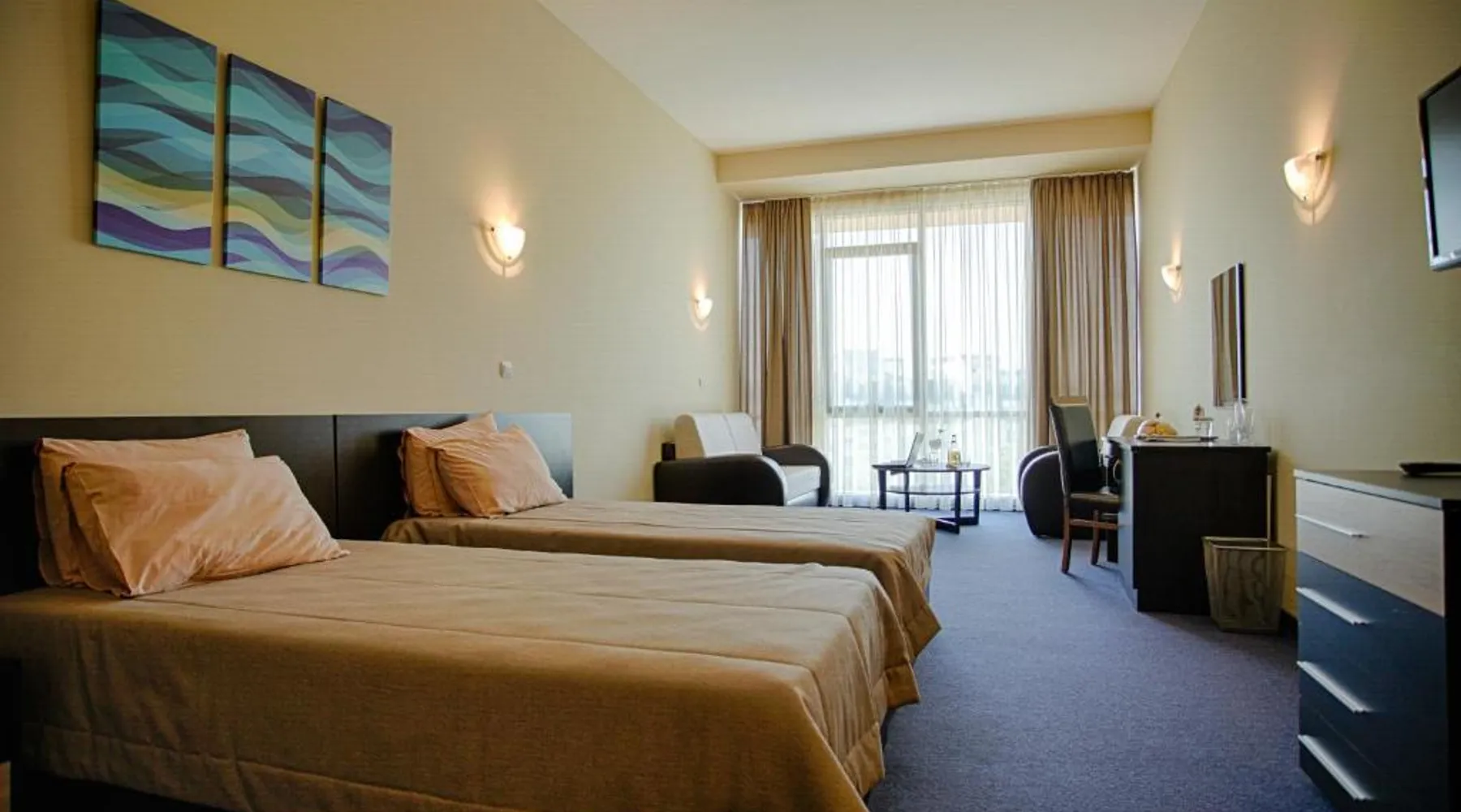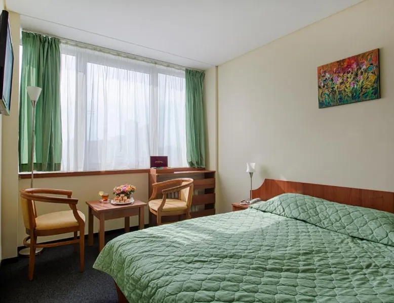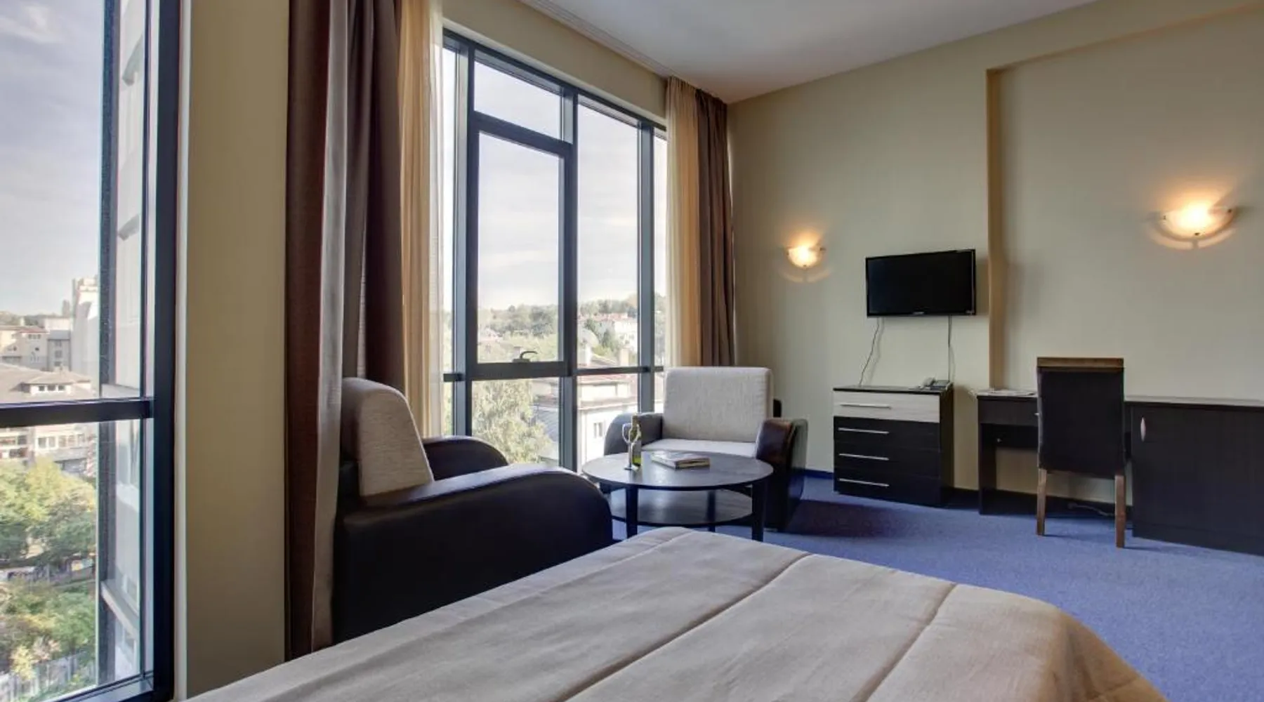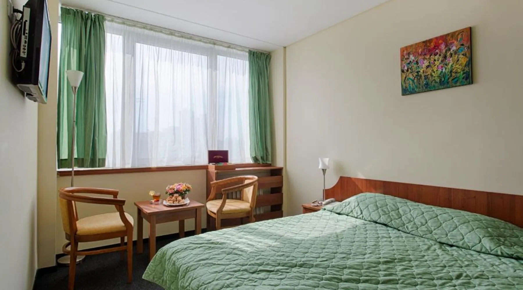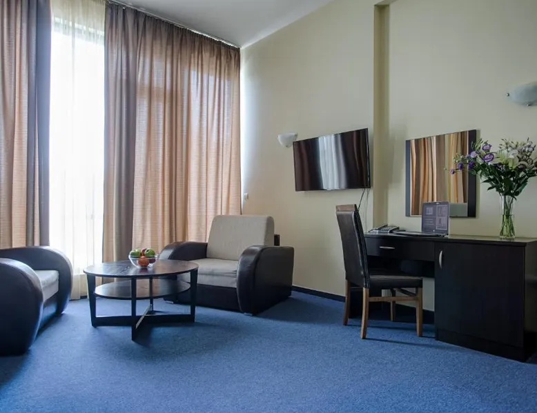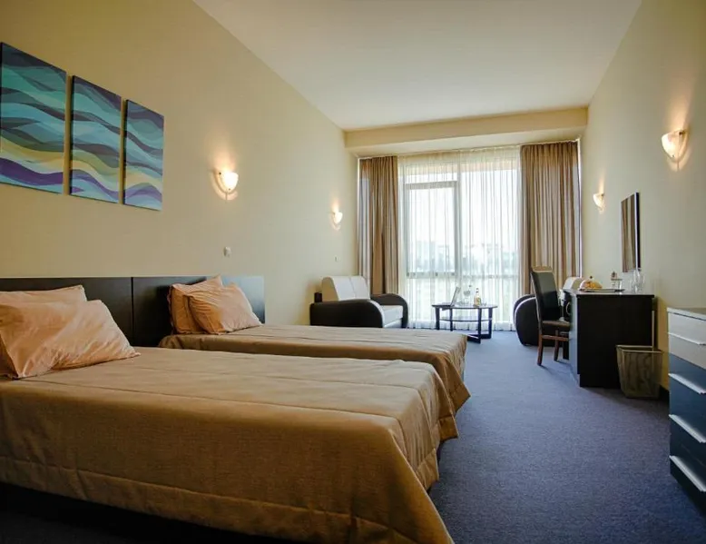 Located opposite the City Center Sofia shopping center, Hotel Hemus provides elegant rooms with mini-bars at a surcharge, cable TV and free internet access. Each of the rooms features individually-controlled air conditioning. The elegantly decorated restaurant serves international cuisine and local dishes. An on-site casino and a night club, as well as conference rooms are provided in the 2 buildings of the Hemus Hotel. Parking in the guarded garage parking is possible for an additional charge at the Hemus Hotel Sofia. The European Union Metro Station is located next to the hotel. Hotel Hemus is within easy walking distance to the National Palace of Culture and Alexander Nevski Cathedral. The popular Vitosha Boulevard with many shopping possibilities is 2297 feet away. This double room has a cable TV. Please note that some units are with 2 adjacent single beds and some are with 1 double bed.
