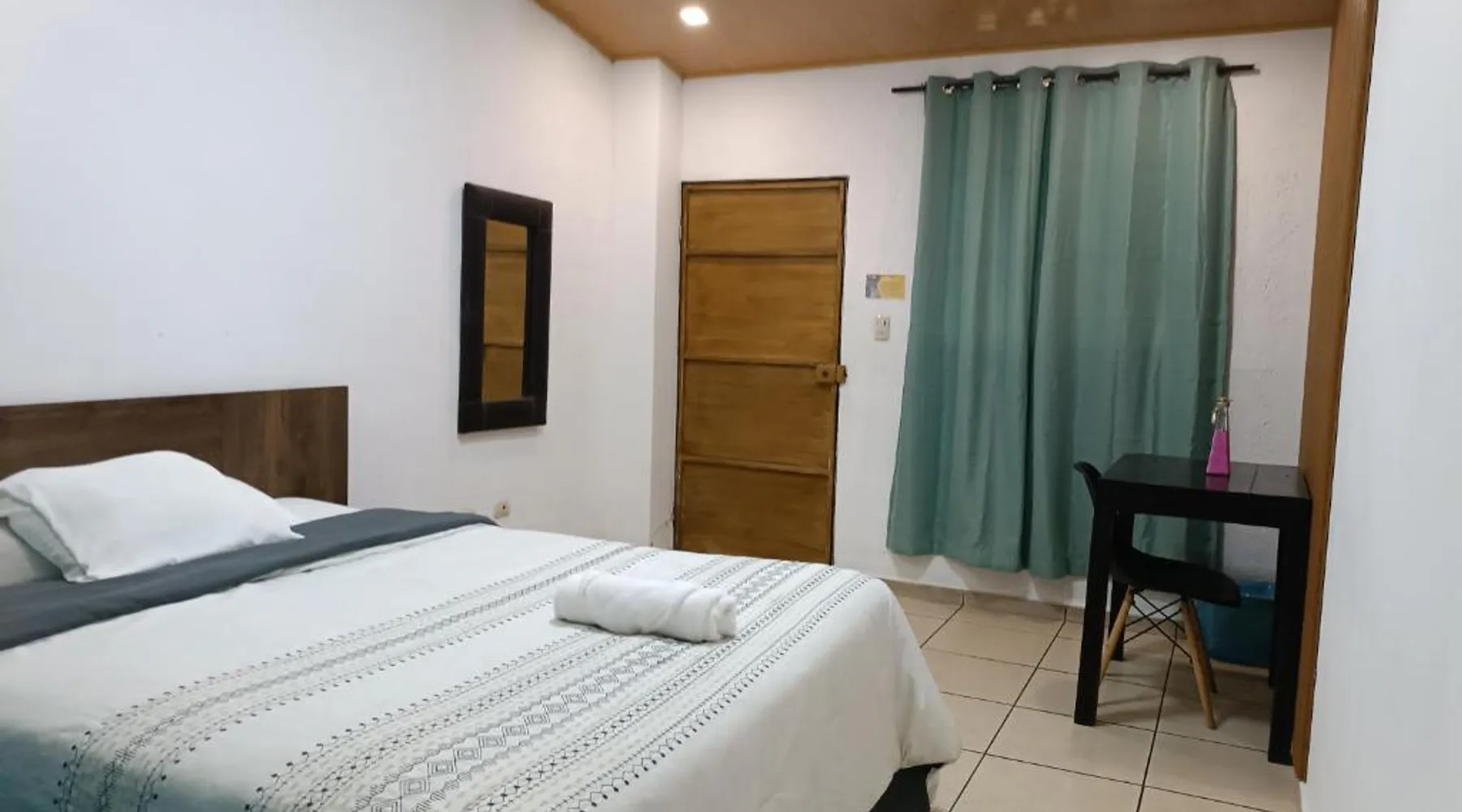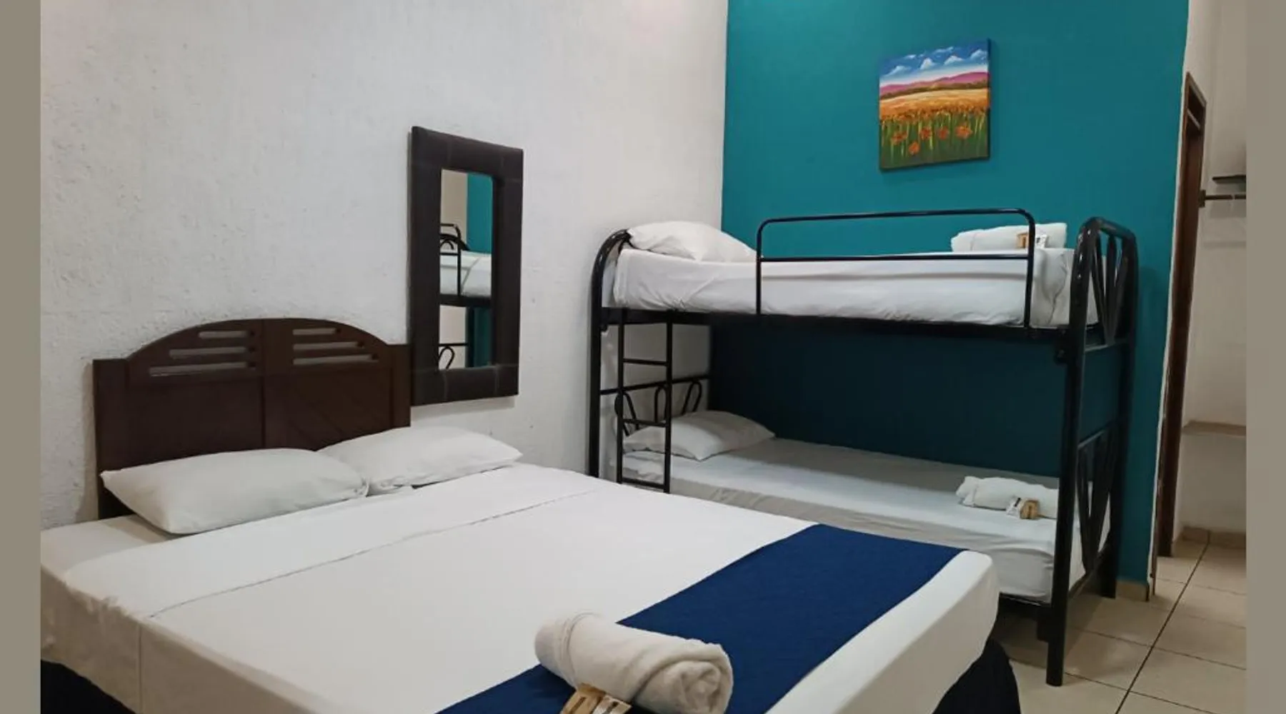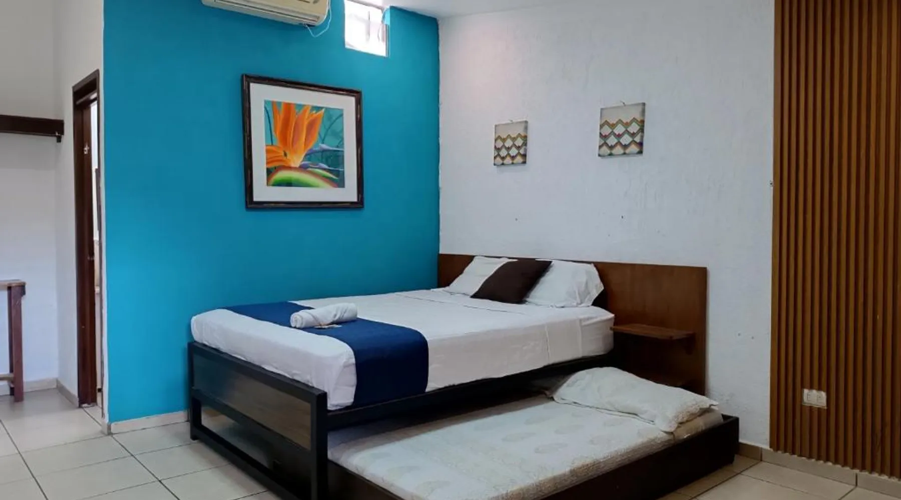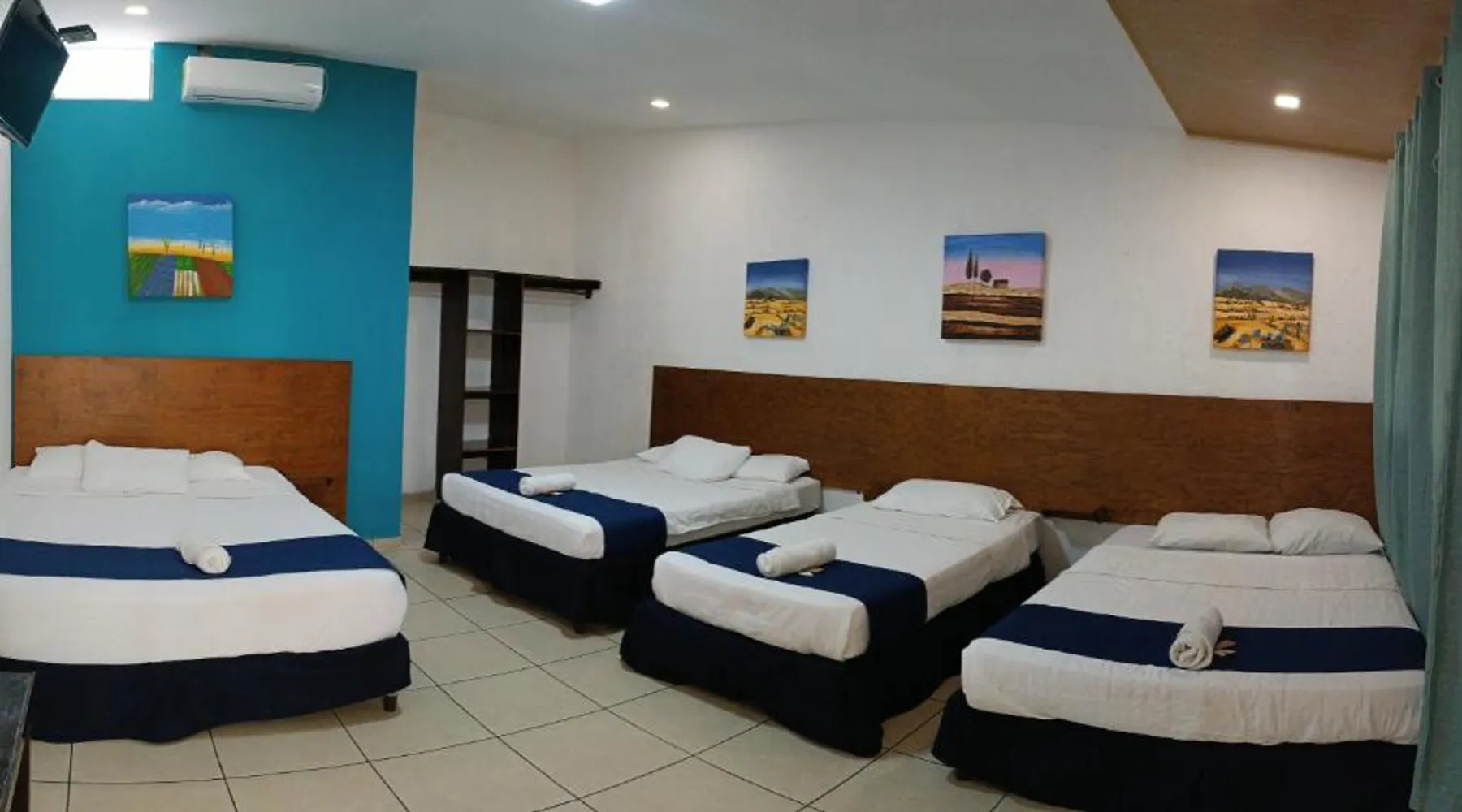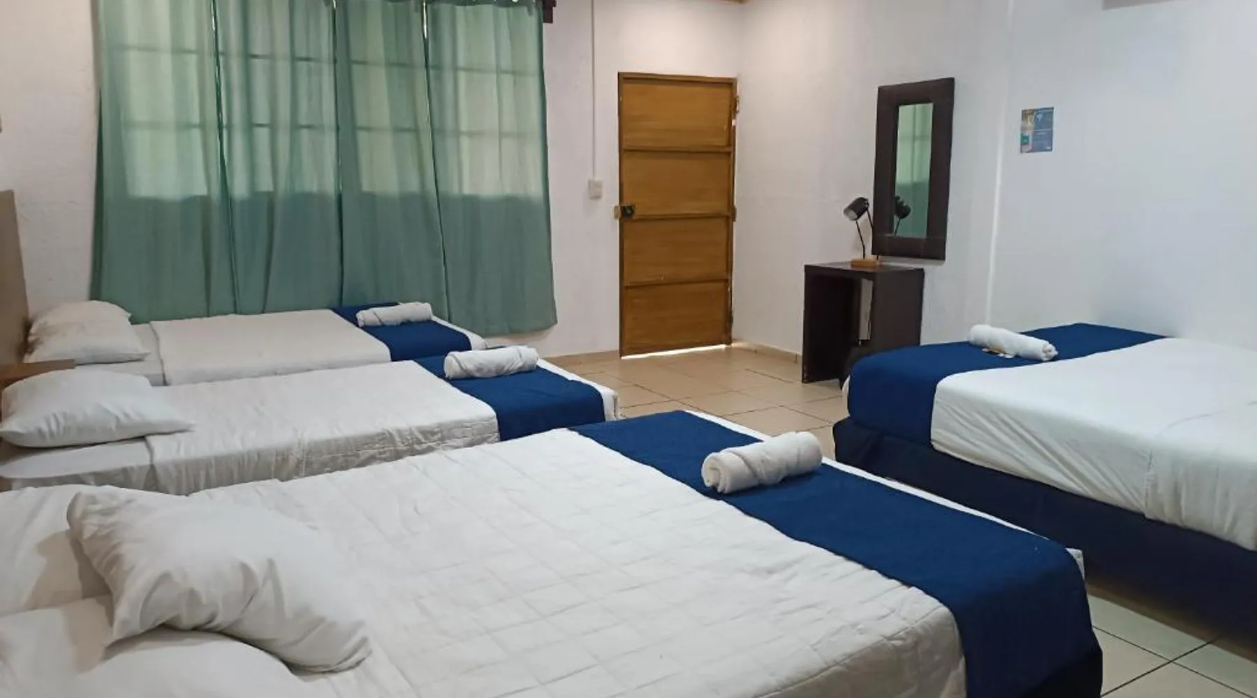 Comfortable Accommodations: El Patio de Don Moncho in Santa Tecla offers family rooms with air-conditioning, private bathrooms, and free toiletries. Each room includes a TV and private entrance, ensuring a pleasant stay. Dining and Leisure: Guests can enjoy a sun terrace, garden, and a family-friendly restaurant serving Latin American cuisine. The on-site bar provides a relaxing atmosphere, while free WiFi is available throughout the property. Convenient Location: Located 30 mi from El Salvador International Airport and 6.2 mi from San Salvador Bicentennial Park, the hotel offers easy access to local attractions. Free on-site private parking and a car park are also available. Guest Services: The hotel provides a 24-hour front desk, paid shuttle service, lounge, public bath, and yoga and fitness classes. Additional amenities include a shared kitchen, picnic area, and games room. Offering free toiletries, this family room includes a private bathroom with a shower. This family room has air conditioning, a private entrance and a flat-screen TV. The unit has 4 beds.