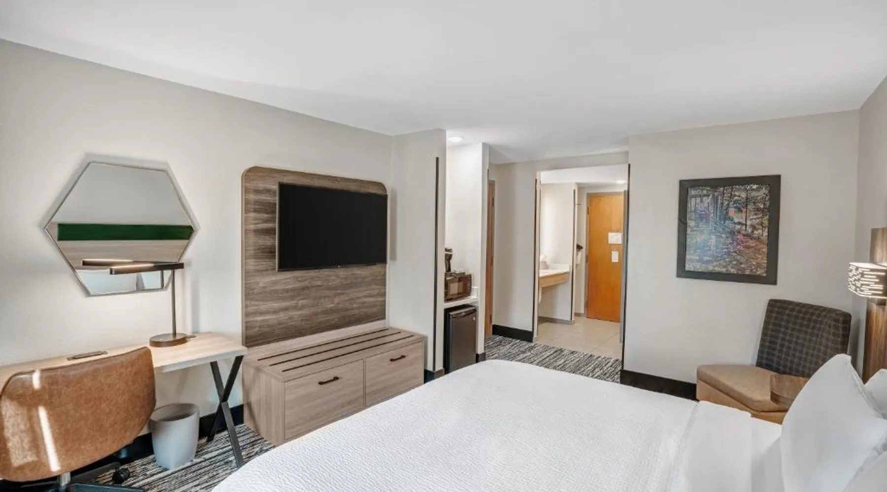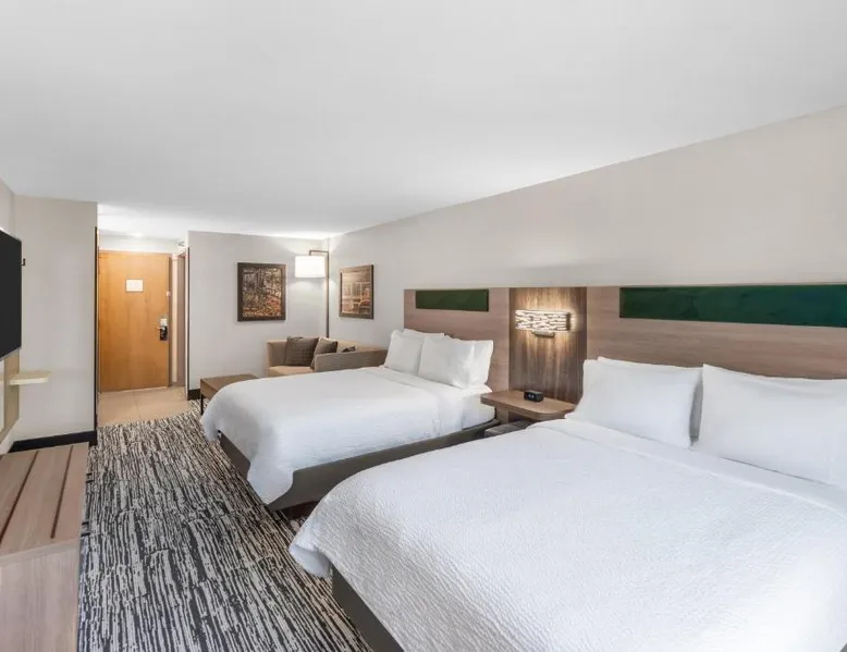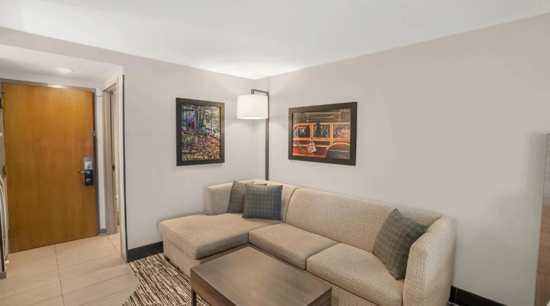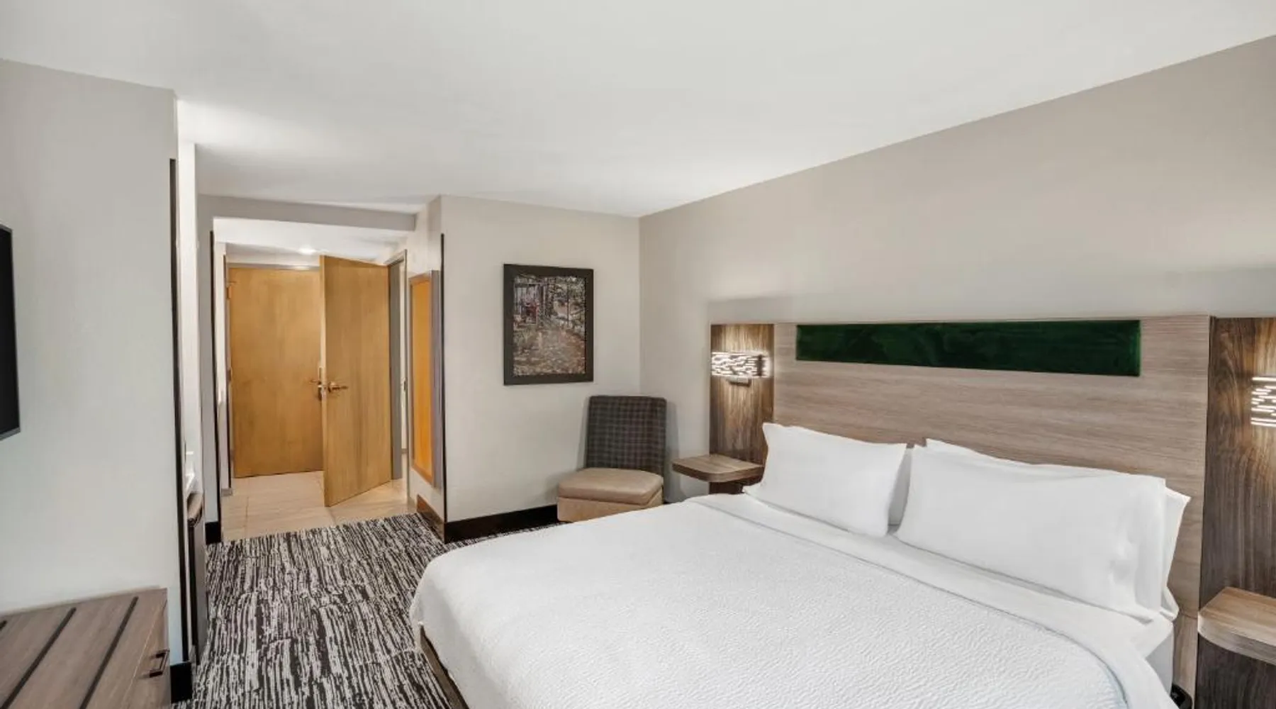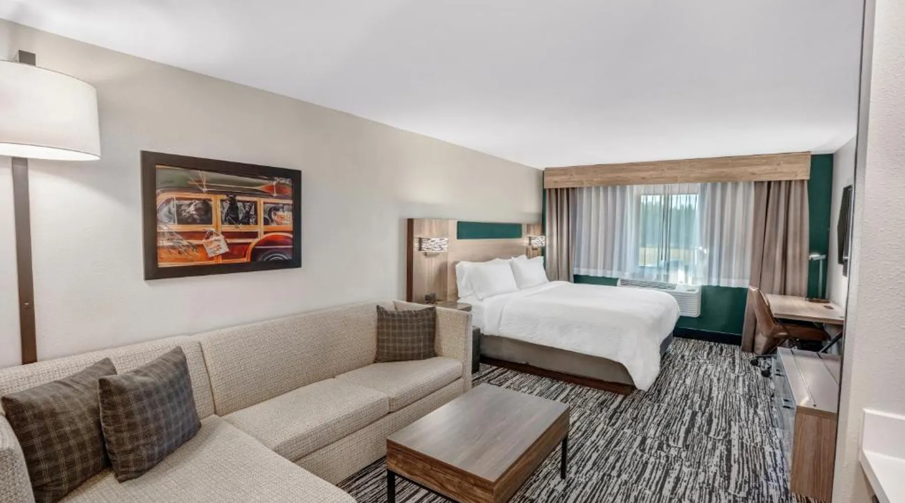Comfortable Accommodations: Holiday Inn Express & Suites Hayward by IHG in Hayward offers air-conditioned rooms with private bathrooms, tea and coffee makers, and free toiletries. Each room includes a work desk, refrigerator, and TV. Leisure Facilities: Guests can enjoy a sauna, fitness center, sun terrace, and indoor swimming pool. Additional amenities include a hot tub, fitness room, and outdoor play area. Dining Options: A continental buffet breakfast is served daily, featuring fresh pastries and pancakes. The property also offers a minimarket and outdoor seating area. Convenient Location: Located less than 0.6 mi from the National Fresh Water Fishing Hall of Fame and 81 mi from Duluth International Airport. Highly rated for its breakfast, staff, and convenient location. The suite offers air conditioning, a tea and coffee maker, as well as a private bathroom boasting a walk-in shower and a hairdryer. The suite features a wardrobe, a sofa, a tiled floor, a carpeted floor and a flat-screen TV with cable channels. The unit has 1 bed.