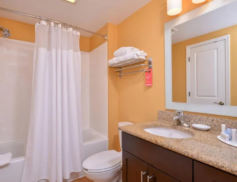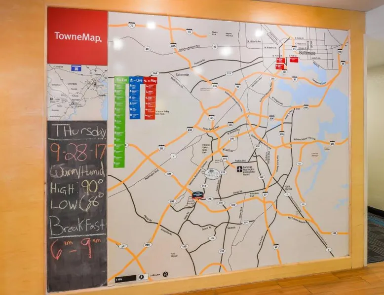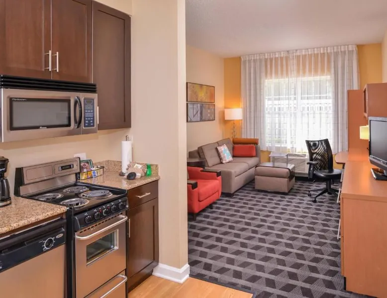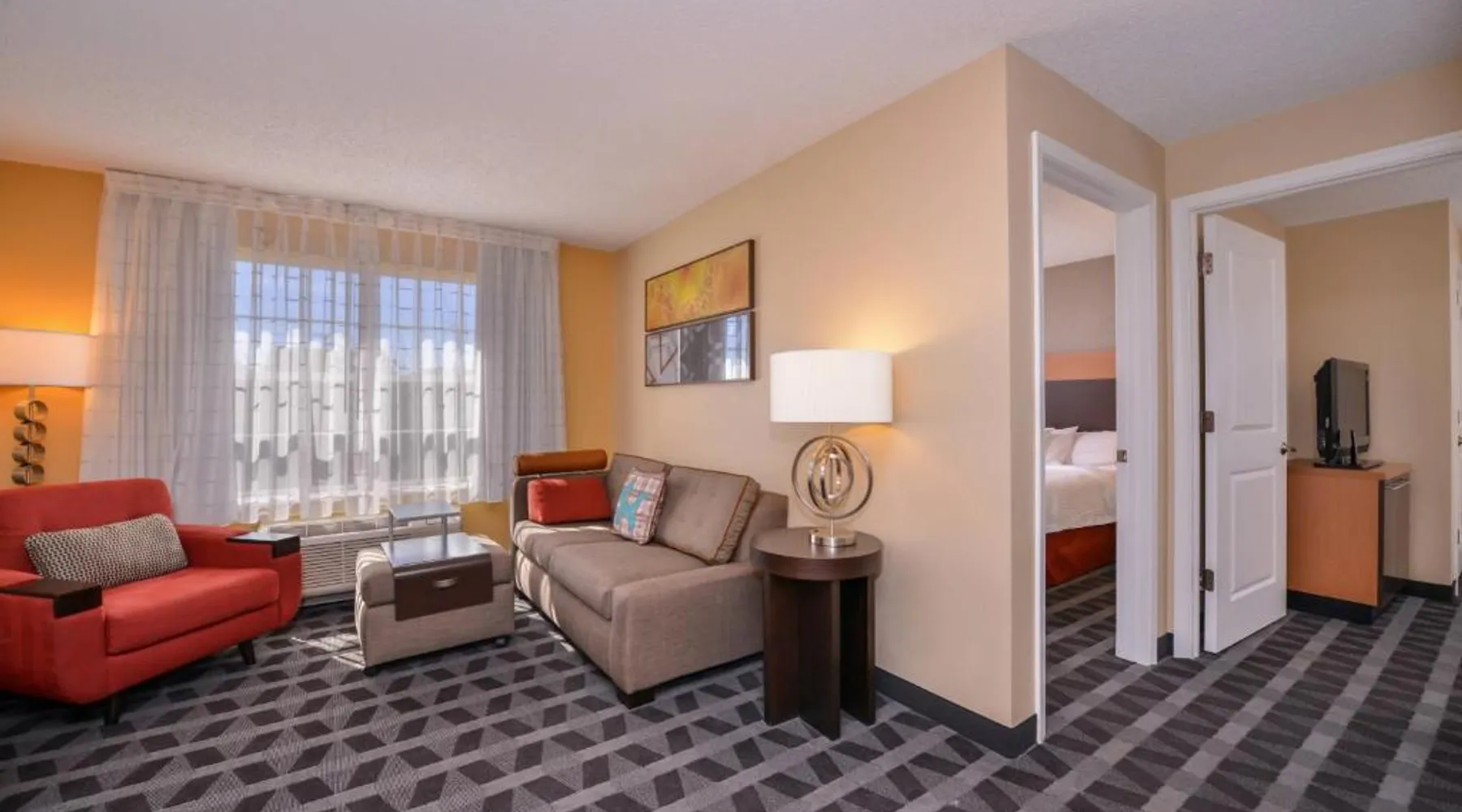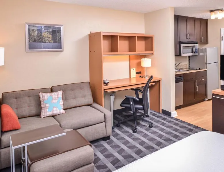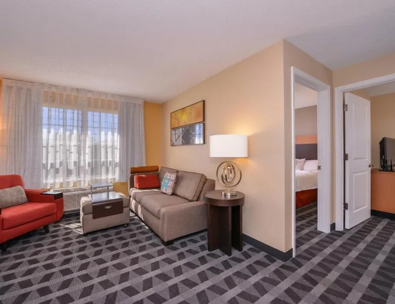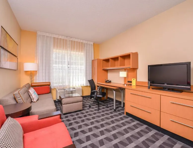Comfortable Accommodations: TownePlace Suites Arundel Mills BWI Airport in Hanover offers family rooms with air-conditioning, private bathrooms, and fully equipped kitchens. Each room includes a sofa bed, work desk, and free WiFi. Convenient Facilities: Guests can relax on the terrace or enjoy the outdoor seating area. The hotel provides a 24-hour front desk, paid on-site parking, and a continental buffet breakfast with warm dishes, fresh pastries, and juice. Prime Location: Located 2.5 mi from Baltimore - Washington International Airport, the hotel is near attractions such as Carroll Park (12 mi) and Inner Harbor (12 mi). Guests appreciate the convenient location, nearby shops, and attentive staff. This suite features 2 TVs, a dining area and separate living room with sofa bed.