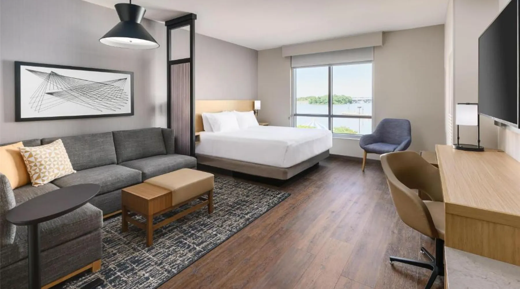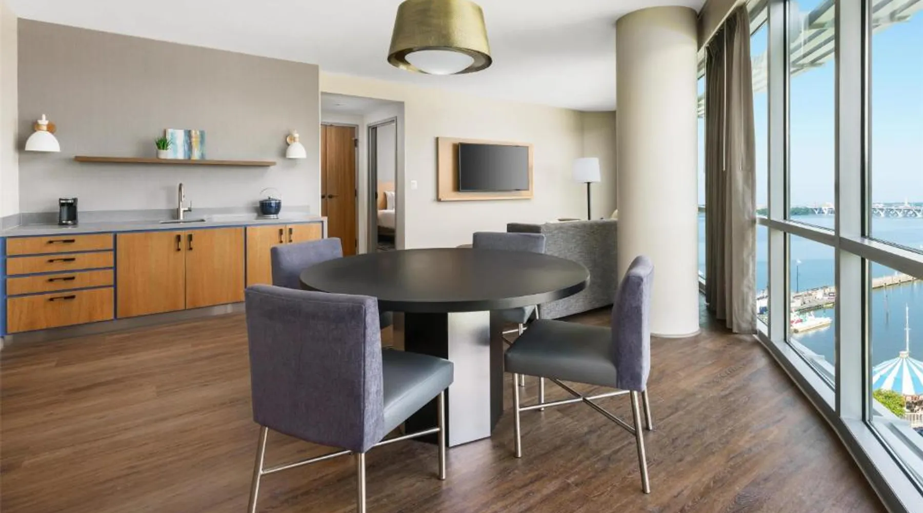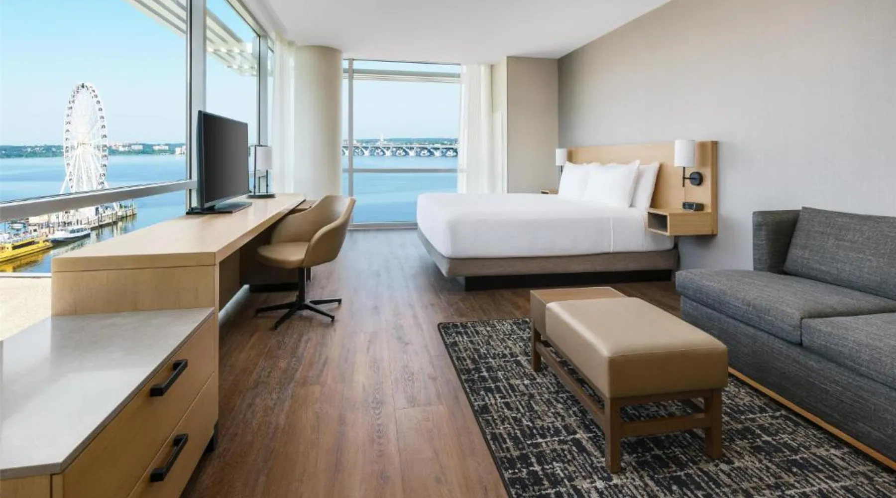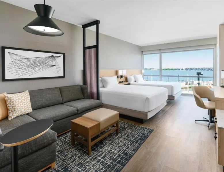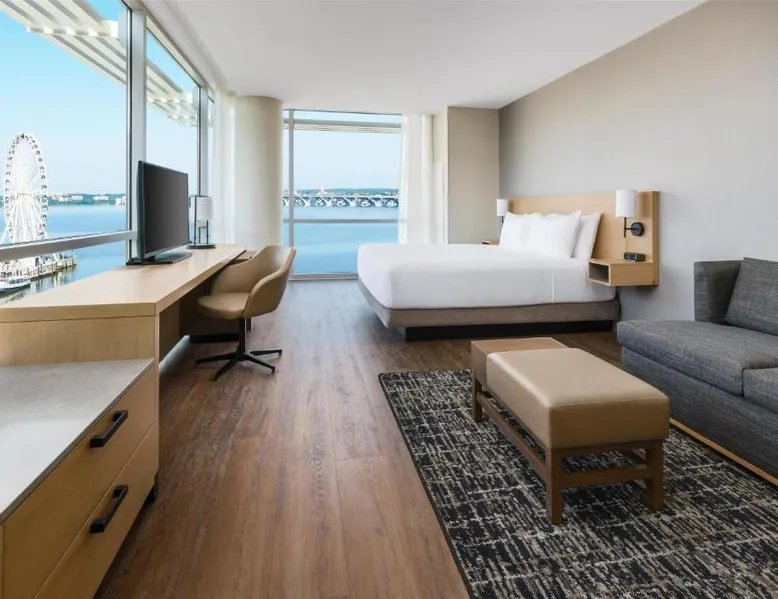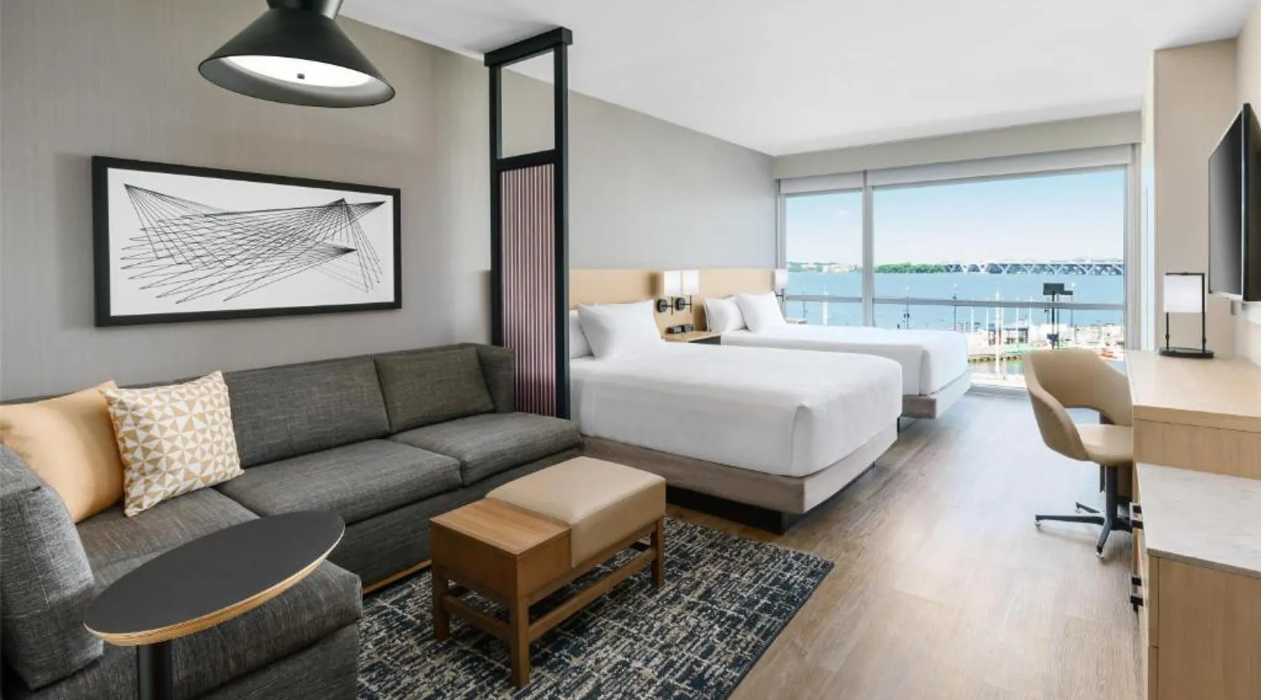 Comfortable Accommodations: Hyatt Place National Harbor in National Harbor offers family rooms with air-conditioning, private bathrooms, and modern amenities. Each room includes a tea and coffee maker, hairdryer, refrigerator, and free toiletries. Dining and Leisure: The hotel features a fitness center, terrace, restaurant, and bar. Guests can enjoy American and seafood cuisines in a family-friendly, traditional, modern, or romantic ambiance. Breakfast is served as an American buffet. Convenient Location: Located 8.1 mi from Ronald Reagan Washington National Airport, the hotel is a 1-minute walk from National Harbor. Nearby attractions include Alexandria's Christ Church (3.7 mi) and Nationals Park (6.8 mi). Guests appreciate the attentive staff and excellent service. This air-conditioned family room includes a flat-screen TV with cable channels and a private bathroom. The unit offers 3 beds.
