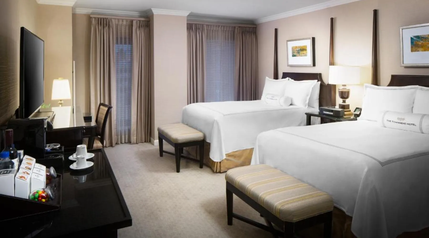 This sophisticated European-style hotel, situated in the heart of trendy Birmingham, Michigan, and only a short drive from Metro Detroit, features luxurious accommodations in a peaceful suburban setting. The Townsend Hotel is surrounded by a variety of luxury and designer shops, gourmet restaurants and art galleries. A number of major attractions, including Cranbrook Museum and a many sporting and entertainment venues are only a short drive away. While staying at the Townsend, guests can relax in the elegant surroundings and thoughtfully furnished guestrooms. For those wishing to explore the area, the dedicated concierge service can help arrange dinner reservations, theater tickets, spa services and much more. Features French doors separating the bedroom from living area, a balcony, oversize marble bathroom with soaking tub
