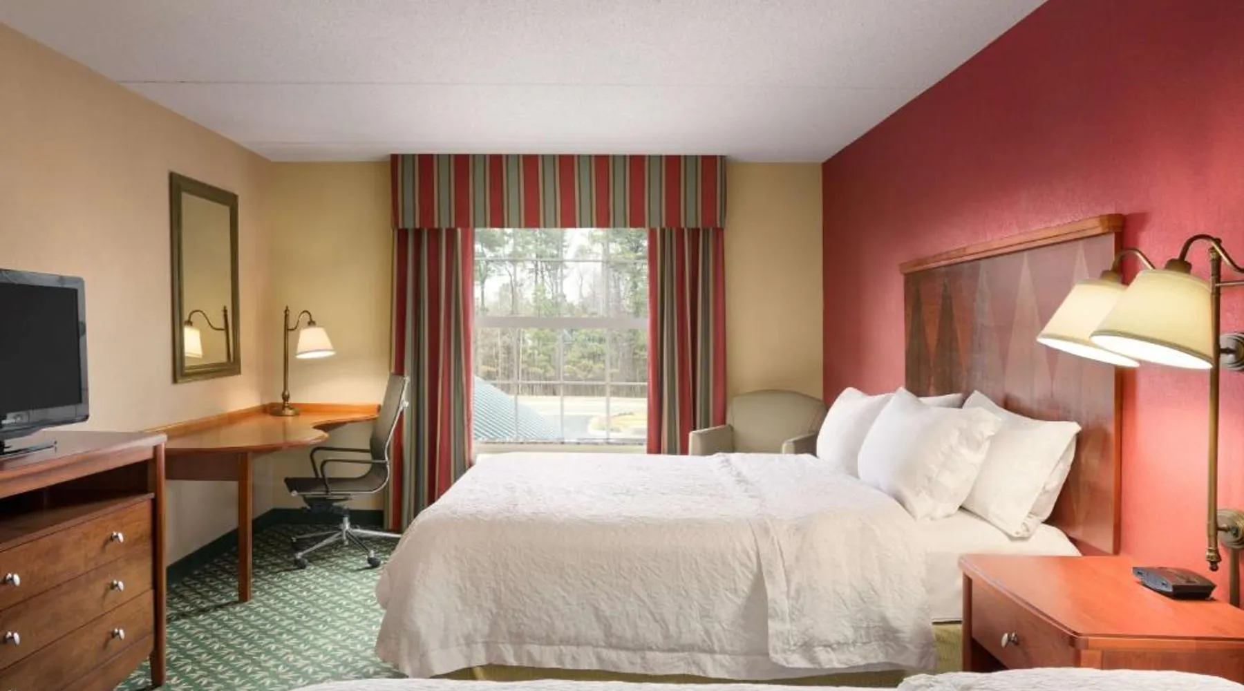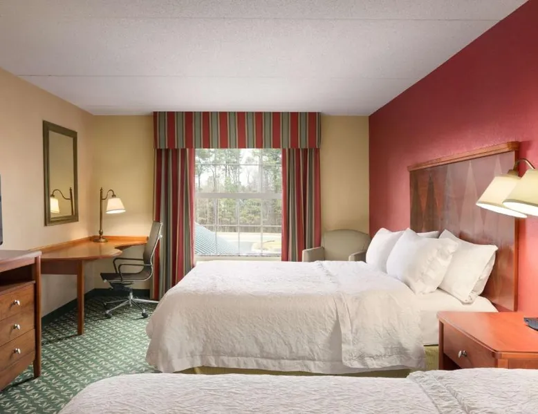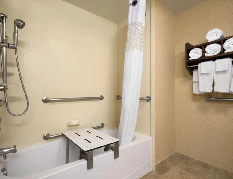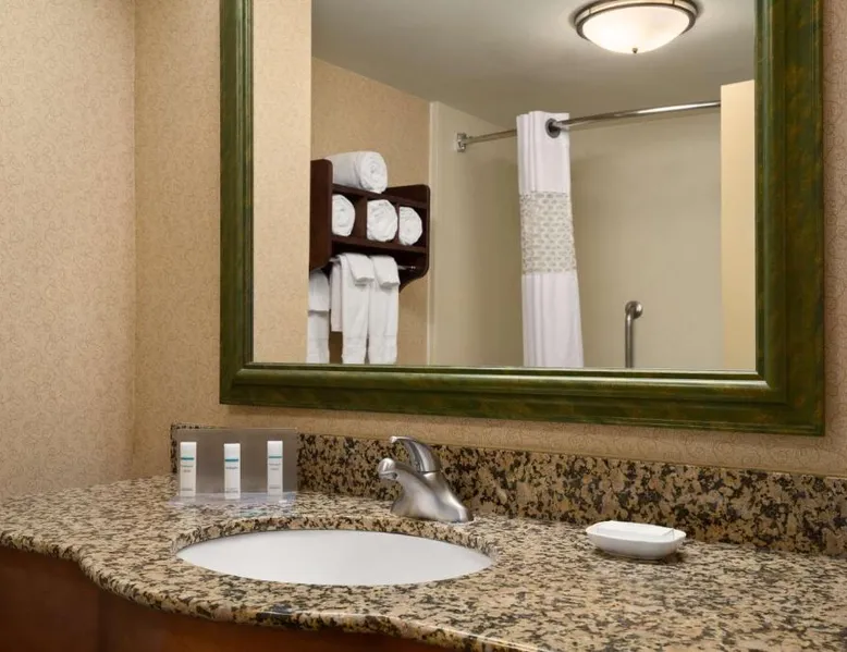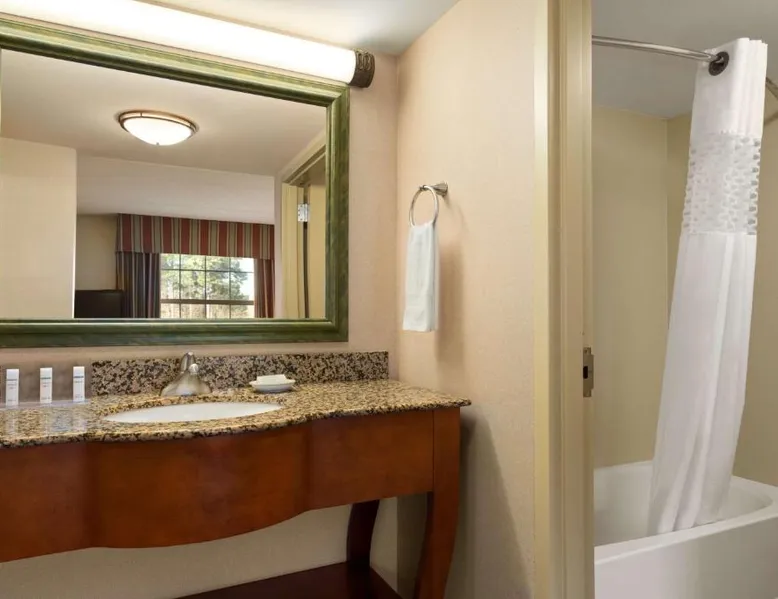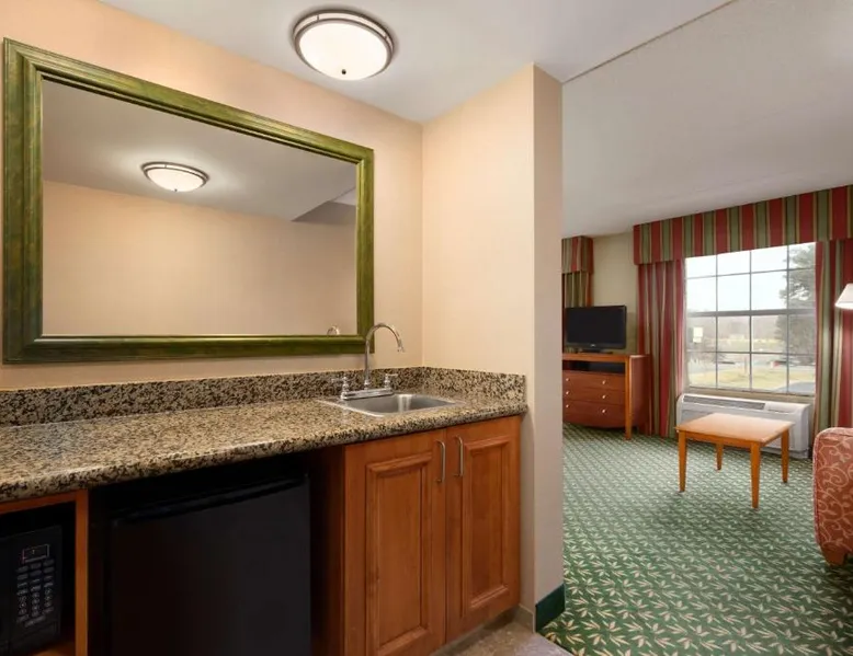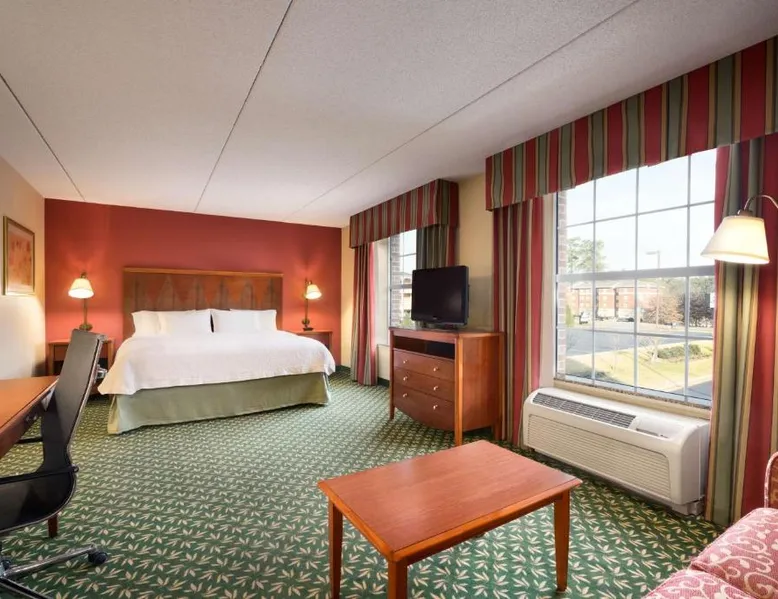 Comfortable Accommodations: Hampton Inn & Suites Williamsburg-Central in Williamsburg offers rooms with air-conditioning, bathrobes, tea and coffee makers, and free WiFi. Each room includes a mini-bar, TV, and work desk. Leisure Facilities: Guests can enjoy an indoor swimming pool, hot tub, fitness room, and lounge. Free bicycles are available for exploring the area. Convenient Amenities: The hotel provides free on-site parking, a 24-hour front desk, business area, and outdoor seating. Additional features include a picnic area and interconnected rooms. Prime Location: Located 1.2 mi from Colonial Williamsburg and 18 mi from Newport News/Williamsburg International Airport. Nearby attractions include Historic Jamestown (7.5 mi) and Busch Gardens Williamsburg (8.1 mi). This studio features a flat-screen TV, a seating area, and a sofa bed.