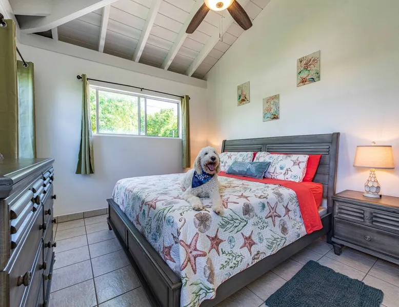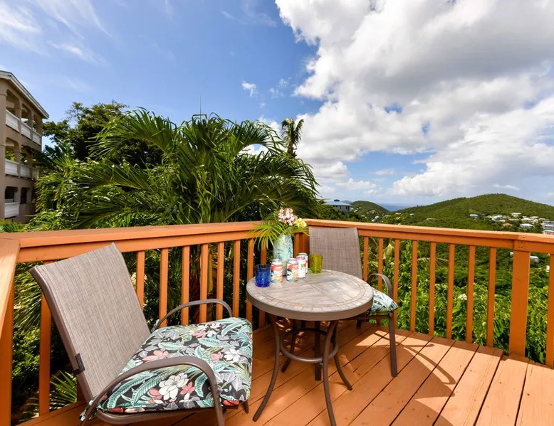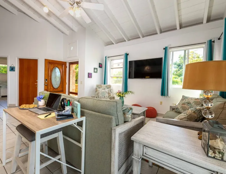 Sugarapple at Kapok Villas is a beautiful spot for your St. John, USVI getaway. This spacious unit is well lit w/ vaulted ceilings, 2 bedrooms with AC, 2 full bathrooms & a full service kitchen with breakfast bar that flows into the open dining and living room areas. The covered outdoor balcony has majestic views of the lush VI National Park & beautiful blue Caribbean Sea. There is an expansive pool deck area with a full size pool, tiki bar & entertainment area. 12 minute drive to the beach! The space Sugarapple has 2 large bedrooms with king-size beds and a queen sleeper sofa in the living room that easily accommodates 6 guests with ample room for everyone and everything! (The master bathroom is ensuite.) Private Balcony/Porch with spectacular views of the National Park and beautiful blue water….perfect for relaxing at the end of your busy day. Unit includes fully stocked kitchen, BBQ grill, IN UNIT washer/dryer, Beach chairs, towels, snorkel gear, coolers, etc. Parking for this unit is just a few steps from front entrance. Enjoy the beautiful gardens surrounding the property with local fruit trees! Guest access The driveway has space for 2 cars/ unit. A 4-wheeled vehicle is not needed for our property or surrounding areas.