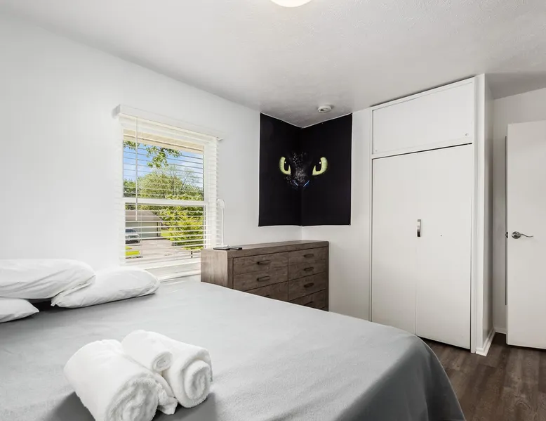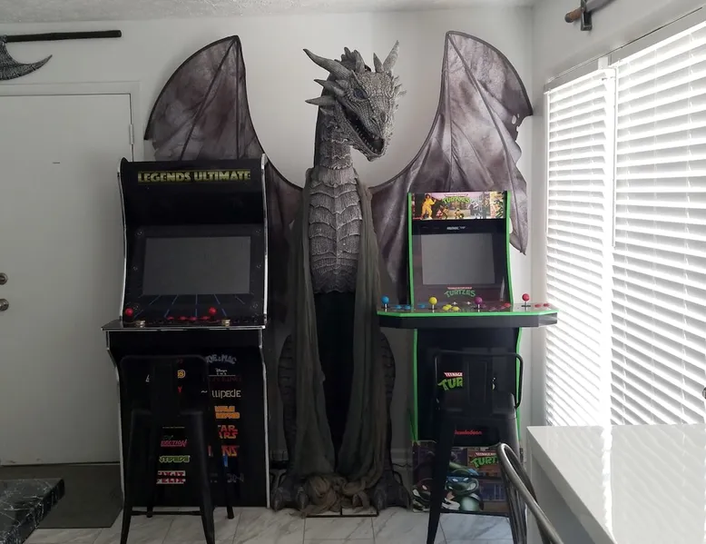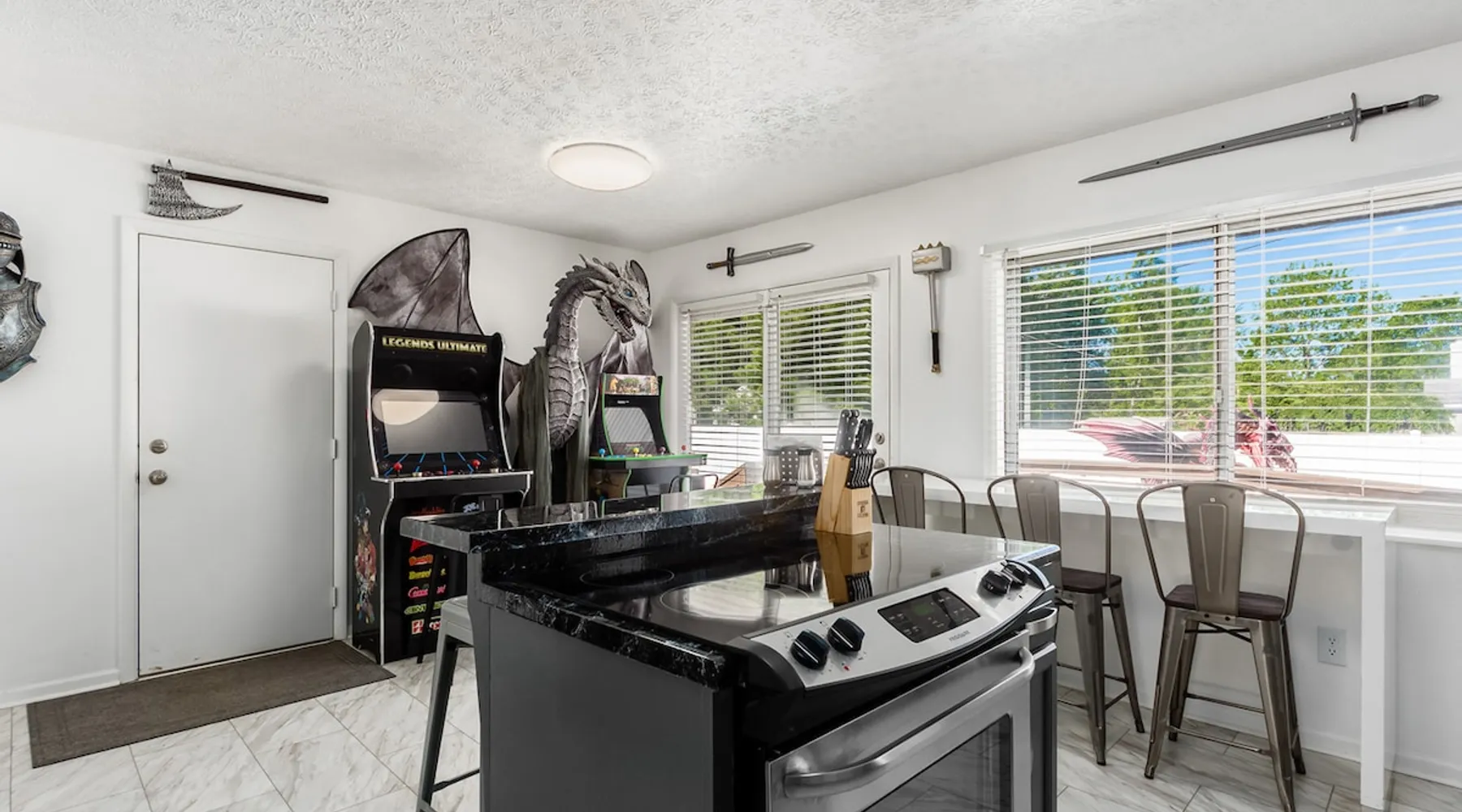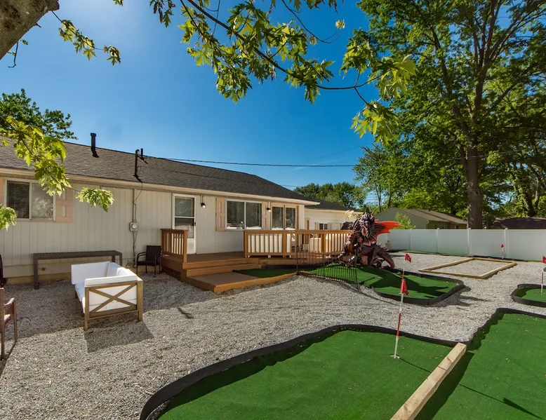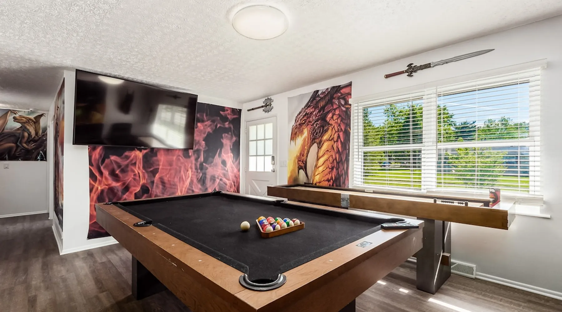 Are you looking for a unique stay with plenty of entertainment options? Our dragon-themed Westerville ranch is fun for the whole family. 15% off stays of seven nights or more. Inside the house you’ll find a massive 75” TV, a pool table, shuffleboard, and arcade cabinets. Each bedroom has an adjustable bed and 55” smart TV with easy access to your streaming subscriptions. The backyard is the real draw, featuring a badminton net, pop-up soccer goals, and even a small minigolf course. The space • Four bedrooms, one bathroom. • Smart TVs in the living room and each bedroom, with access to any of your streaming subscriptions and complementary Hulu TV service. • Entertainment options include a pool table, shuffleboard, arcade cabinets as well as a small minigolf course and badminton net in the back and side yards. • Fully equipped kitchen with new stainless steel appliances. • Fenced in backyard, great for pets. • Off street parking. • Clean towels and linens are provided. Guest access Guests will have access to the entire property. Other things to note CHECK IN: Check in is at 4 PM or later. CHECK OUT: Check out is at 11 AM PARKING: There are two garage spots and room for more cars in the driveway. CAMERAS: In order to prevent parties, there are two Ring cameras on the property that record all motion in the front and back yards. They are attached to the garage and back exterior wall of the house and face outward so they cannot record the interior of the house in any way. 5% of proceeds from each stay are donated to Nationwide Children's Hospital.