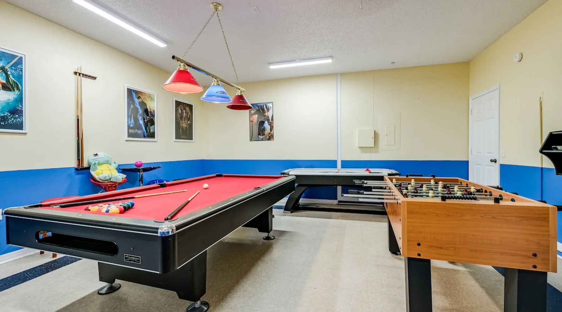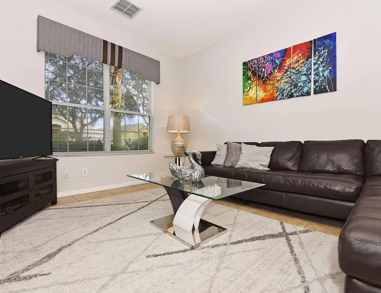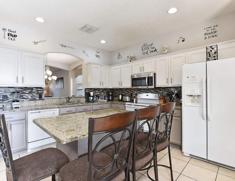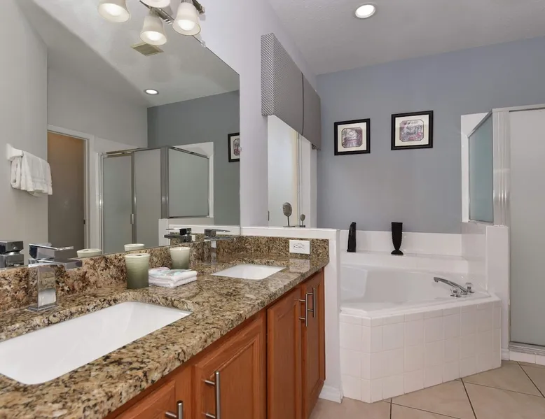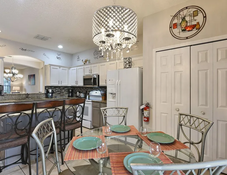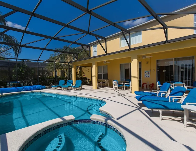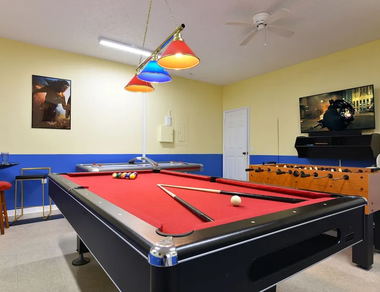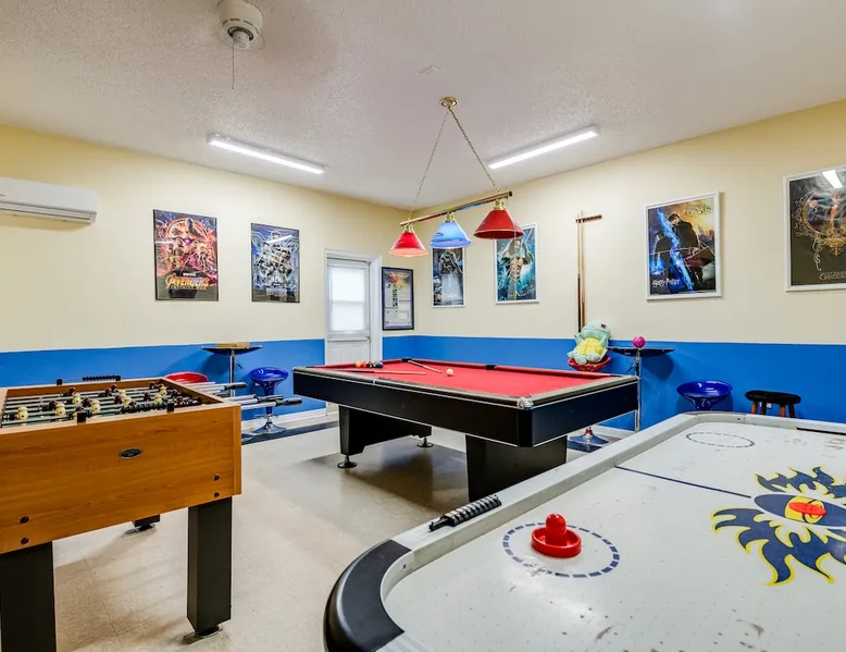 ☀ This "Emerald Magic" villa is proudly offered to you by "Emerald Island Rentals" ☀ Air Conditioning • Free Wi-Fi • Free Internet • Complementary BBQ Grill • Private south-facing pool/spa/lanai • SMART TVs• Full-size laundry facilities • Children Welcome • Non-smoking only • Free BBQ Grill • Free Crib/stroller/ Pack n play • Air-conditioned theater/game room • The space ============ ☀ ☀ Features ☀ ☀ ============ ☀ Spacious family villa only 3 miles from Disney World. It takes less than 10 minutes to be in Disney World. You can access freeways within a few minutes for other central Florida destinations. ☀3300 sq ft of luxurious fully air-conditioned living space plus games room is at your disposal ☀ This villa has a south-facing pool/spa and lanai so that you can soak in the sun all day or relax in the lanai. Only a south-facing pool offers the maximum sunlight on the pool deck. So, please be sure to check for that as not every villa has a south-facing pool. This one does! There are plenty of loungers and chairs for all guests in the sun. After getting enough tan, guests can rest under the shade of lanai which also has fans to cool you off. We also have a large gas barbecue grill and we provide a free tank of propane gas for the BBQ. If you find the pool/spa is a little cool for your liking, it can be fully heated at an additional daily charge (recommended for October to March). The pool deck is fully screened which helps to keep the pool clean and the wildlife out. The pool is serviced weekly by professionals so you can be sure it is clean and safe to swim in. ☀The luxurious raised Spa is a great way to relax and is able to accommodate up to four people at once. Not a bad way to discuss tomorrow's adventures! Those guests traveling with little ones will be glad to know that the Pool area has a complete child safety fence. In addition, all doors leading to the pool are alarmed. ============================= ☀ ☀ Bedrooms and Sleeping Arrangements ☀ ☀ ============================= ☀ Sleeps up to 15 adults/children, ideal for 3 or 4 families, so bring your friends and family. There is no per-person cost. ☀ 6 bedrooms & 5.5 bathrooms including: ☀ 4 x master en-suites, 4 king-sized beds ☀ Kids bedroom with two twins ☀ Kids bedroom with a twin; and twin over double bunk bed ☀ King Master Suite #1: This King Master Suite is located on the first floor with a nice view of the pool and lanai area and has an en-suite bathroom with Jacuzzi, shower, and separate toilet. It is complemented by a huge walk-in closet. This bedroom also has a 50" flat-screen SMART TV. ☀ King Master Suite #2: This King Master Suite located upstairs and has an en-suite bathroom with a tub and toilet. It is complemented by a huge walk-in closet. This bedroom also has a 50" flat-screen SMART TV with cable. This bedroom has a full-size crib. ☀ King Master Suite #3/#4: These King Master Suites are located upstairs and each has en-suite bathrooms with a tub and toilet. Both these bedrooms also have a 50" flat-screen SMART TV with cable.. ☀ Bedroom #5 ("Finding Nemo" Theme): There is Finding Nemo theme bedroom that is ideal for kids. It has a twin over double bunk bed and an additional twin bed to sleep 4 kids in comfort. This bedroom has a 43" SMART TV as well. ☀ Bedroom #6 ("Minions" Theme): The 6th bedroom has a Minions theme and has two twin beds. This bedroom has a 40" SMART TV. ☀ In addition, we offer a cot (crib) and one pack ‘n play at no additional cost. There is a high chair and a stroller for your use, also at no cost. =============== ☀ ☀ Living Spaces ☀ ☀ =============== ☀ The spacious family room leading to a large south-facing pool deck has child safety doors to keep your kids safe. There is a 55" 4K-UHD ROKU SMART TV in the family room. ☀ If you would like to have some quiet time, you can head to the living room to the front of the villa which offers comfortable seating ☀ Hungry anyone? The fully equipped luxury kitchen with granite countertops makes it a breeze to make some omelets or prep your food for the ultimate BBQ feast on the provided BBQ Grill. “Emerald Magic” has a well-equipped kitchen that makes food preparation a breeze while you are on vacation. To start off, this kitchen has an oven and a cook-top stove to make special meals of your choice and is complemented by a refrigerator with a freezer, microwave oven, and automatic icemaker. This kitchen is “complete” with dinnerware, silverware, and glassware settings for the entire family (including wine glasses), kitchen towels and oven mitts, knives, and a cutting board. It also offers various kitchen utensils including corkscrew and grater, Salt, and pepper shakers. There are plenty of pots and pans, baking sheets, microwaveable dishes. ☀ Eat in style! The breakfast nook with a large granite countertop offers seating for 6. And in addition, the formal dining area off the living room has seating for 8 ☀ Entertainment: There is no end to the entertainment if you are not tired at the end of a long day at the central Florida theme parks. Watch a movie on one of the many 4K-UHD ROKU/LED TVs as offered in all bedrooms. For even more fun, head to the ultimate game room with a slate pool table, air hockey, table foosball, darts, & 55" SMART TV. This game room is fully air-conditioned (unlike many game-rooms that do not have any air-conditioning making it impossible to use them in the Florida heat). ☀ There is no better way to enjoy the Florida vacation than spend quality time in the pool area. The large covered lanai with infant pool safety fence & alarmed pool doors will let you enjoy the swimming pool & spa area that offers plenty of sun loungers & free gas BBQ Grill. There are also plenty of dining chairs and tables on the pool deck for alfresco dining. We provide pool-safe crockery & drinkware for use around the pool. ☀ No need to pay for those outrageous