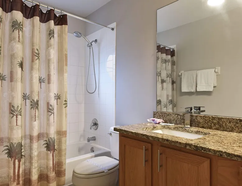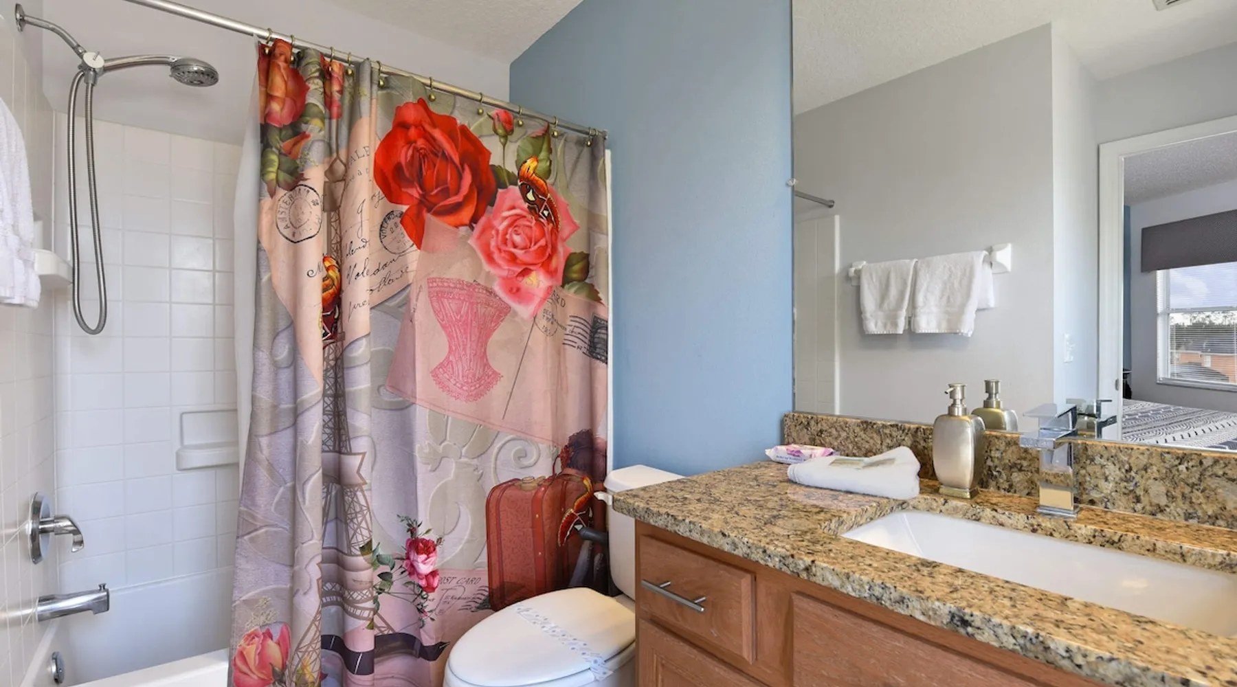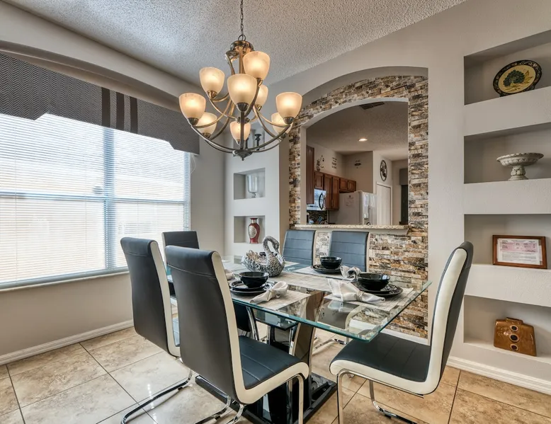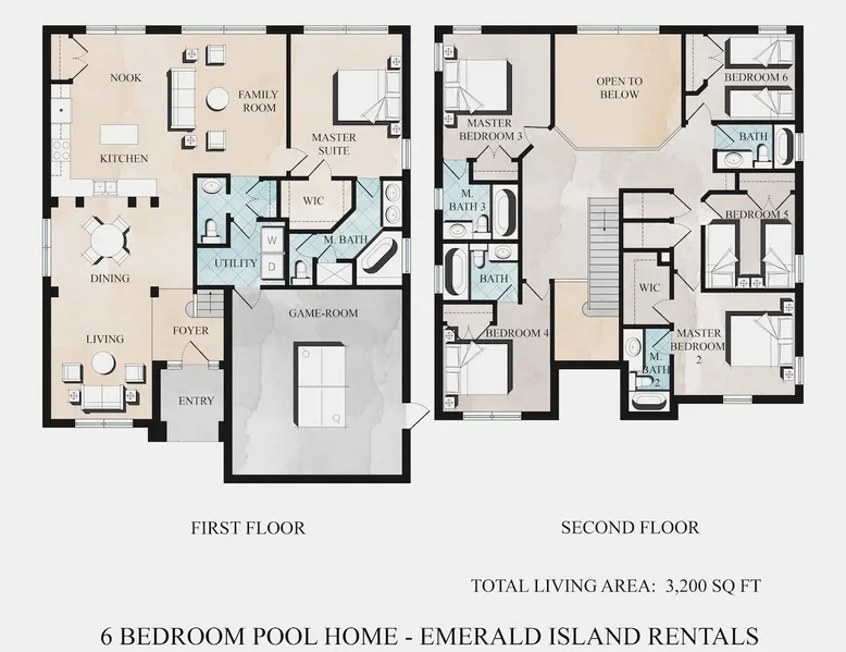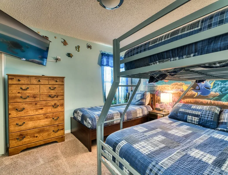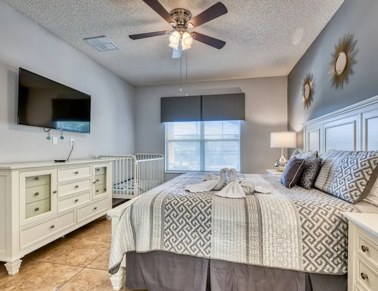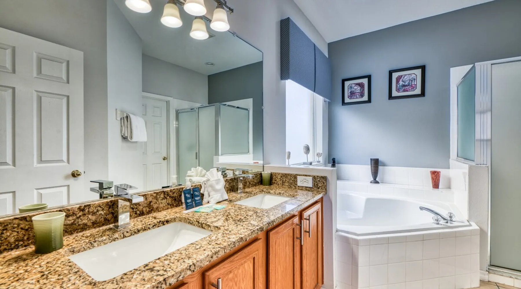 ☀ This "Emerald Magic" villa is proudly offered to you by "Emerald Island Rentals" ☀ Air Conditioning • Free Wi-Fi • Free Internet • Complementary BBQ Grill • Private south-facing pool/spa/lanai • SMART TVs• Full-size laundry facilities • Children Welcome • Non-smoking only • Free BBQ Grill • Free Crib/stroller/ Pack n play • Air-conditioned theater/game room • The space ============ ☀ ☀ Features ☀ ☀ ============ ☀ Spacious family villa only 3 miles from Disney World. It takes less than 10 minutes to be in Disney World. You can access freeways within a few minutes for other central Florida destinations. ☀3300 sq ft of luxurious fully air-conditioned living space plus games room is at your disposal ☀ This villa has a south-facing pool/spa and lanai so that you can soak in the sun all day or relax in the lanai. Only a south-facing pool offers the maximum sunlight on the pool deck. So, please be sure to check for that as not every villa has a south-facing pool. This one does! There are plenty of loungers and chairs for all guests in the sun. After getting enough tan, guests can rest under the shade of lanai which also has fans to cool you off. We also have a large gas barbecue grill and we provide a free tank of propane gas for the BBQ. If you find the pool/spa is a little cool for your liking, it can be fully heated at an additional daily charge (recommended for October to March). The pool deck is fully screened which helps to keep the pool clean and the wildlife out. The pool is serviced weekly by professionals so you can be sure it is clean and safe to swim in. ☀The luxurious raised Spa is a great way to relax and is able to accommodate up to four people at once. Not a bad way to discuss tomorrow's adventures! Those guests traveling with little ones will be glad to know that the Pool area has a complete child safety fence. In addition, all doors leading to the pool are alarmed. ============================= ☀ ☀ Bedrooms and Sleeping Arrangements ☀ ☀ ============================= ☀ Sleeps up to 15 adults/children, ideal for 3 or 4 families, so bring your friends and family. There is no per-person cost. ☀ 6 bedrooms & 5.5 bathrooms including: ☀ 4 x master en-suites, 4 king-sized beds ☀ Kids bedroom with two twins ☀ Kids bedroom with a twin; and twin over double bunk bed ☀ King Master Suite #1: This King Master Suite is located on the first floor with a nice view of the pool and lanai area and has an en-suite bathroom with Jacuzzi, shower, and separate toilet. It is complemented by a huge walk-in closet. This bedroom also has a 50" flat-screen SMART TV. ☀ King Master Suite #2: This King Master Suite located upstairs and has an en-suite bathroom with a tub and toilet. It is complemented by a huge walk-in closet. This bedroom also has a 50" flat-screen SMART TV with cable. This bedroom has a full-size crib. ☀ King Master Suite #3/#4: These King Master Suites are located upstairs and each has en-suite bathrooms with a tub and toilet. Both these bedrooms also have a 50" flat-screen SMART TV with cable.. ☀ Bedroom #5 ("Finding Nemo" Theme): There is Finding Nemo theme bedroom that is ideal for kids. It has a twin over double bunk bed and an additional twin bed to sleep 4 kids in comfort. This bedroom has a 43" SMART TV as well. ☀ Bedroom #6 ("Minions" Theme): The 6th bedroom has a Minions theme and has two twin beds. This bedroom has a 40" SMART TV. ☀ In addition, we offer a cot (crib) and one pack ‘n play at no additional cost. There is a high chair and a stroller for your use, also at no cost. =============== ☀ ☀ Living Spaces ☀ ☀ =============== ☀ The spacious family room leading to a large south-facing pool deck has child safety doors to keep your kids safe. There is a 55" 4K-UHD ROKU SMART TV in the family room. ☀ If you would like to have some quiet time, you can head to the living room to the front of the villa which offers comfortable seating ☀ Hungry anyone? The fully equipped luxury kitchen with granite countertops makes it a breeze to make some omelets or prep your food for the ultimate BBQ feast on the provided BBQ Grill. “Emerald Magic” has a well-equipped kitchen that makes food preparation a breeze while you are on vacation. To start off, this kitchen has an oven and a cook-top stove to make special meals of your choice and is complemented by a refrigerator with a freezer, microwave oven, and automatic icemaker. This kitchen is “complete” with dinnerware, silverware, and glassware settings for the entire family (including wine glasses), kitchen towels and oven mitts, knives, and a cutting board. It also offers various kitchen utensils including corkscrew and grater, Salt, and pepper shakers. There are plenty of pots and pans, baking sheets, microwaveable dishes. ☀ Eat in style! The breakfast nook with a large granite countertop offers seating for 6. And in addition, the formal dining area off the living room has seating for 8 ☀ Entertainment: There is no end to the entertainment if you are not tired at the end of a long day at the central Florida theme parks. Watch a movie on one of the many 4K-UHD ROKU/LED TVs as offered in all bedrooms. For even more fun, head to the ultimate game room with a slate pool table, air hockey, table foosball, darts, & 55" SMART TV. This game room is fully air-conditioned (unlike many game-rooms that do not have any air-conditioning making it impossible to use them in the Florida heat). ☀ There is no better way to enjoy the Florida vacation than spend quality time in the pool area. The large covered lanai with infant pool safety fence & alarmed pool doors will let you enjoy the swimming pool & spa area that offers plenty of sun loungers & free gas BBQ Grill. There are also plenty of dining chairs and tables on the pool deck for alfresco dining. We provide pool-safe crockery & drinkware for use around the pool. ☀ No need to pay for those outrageous