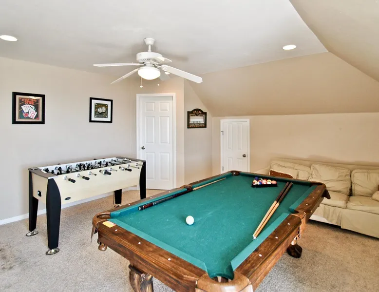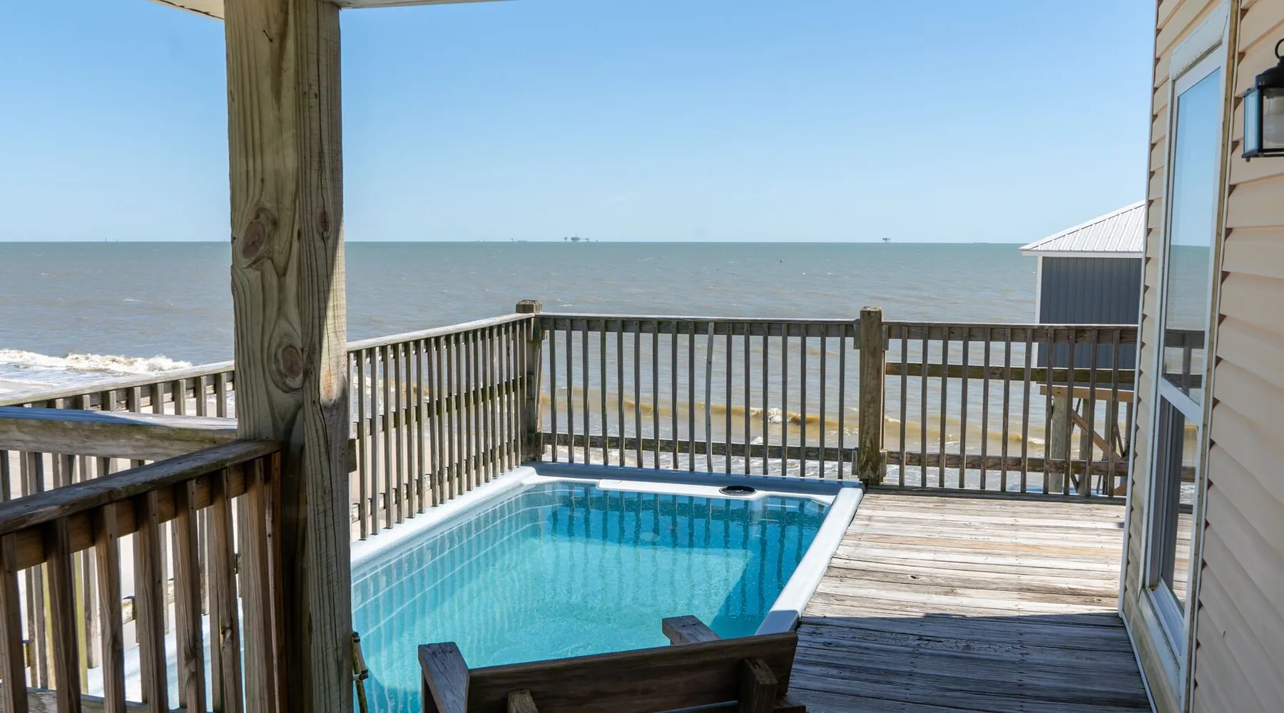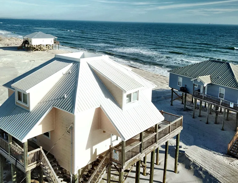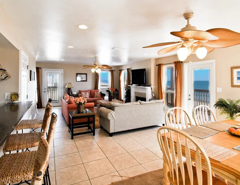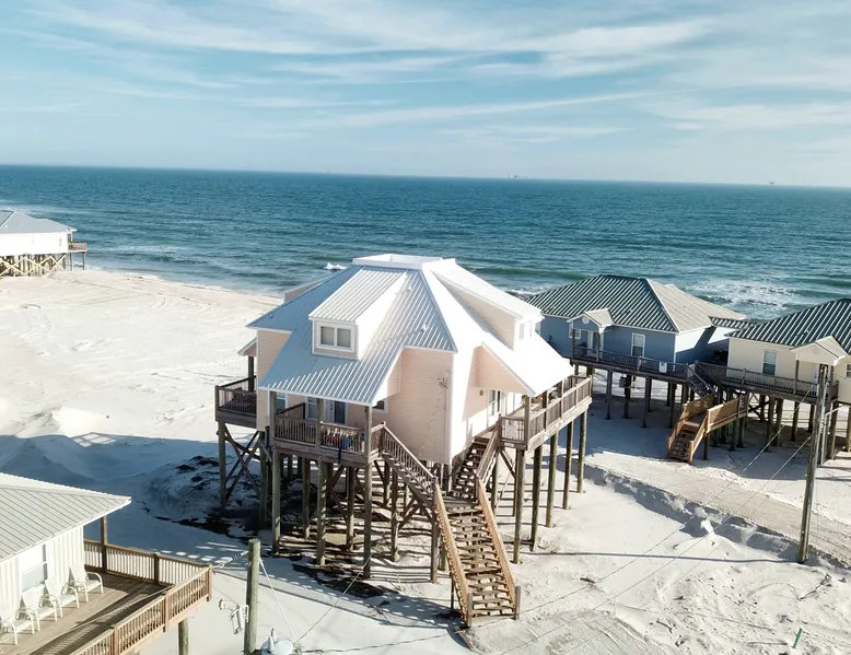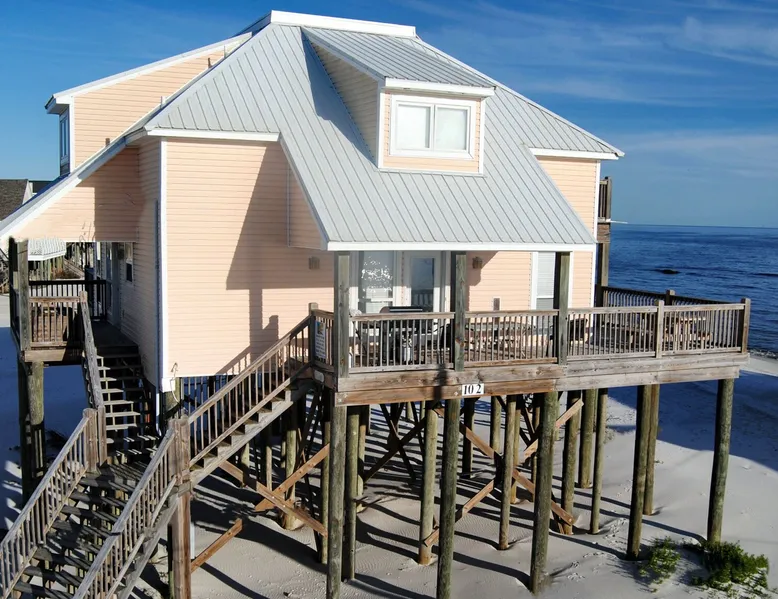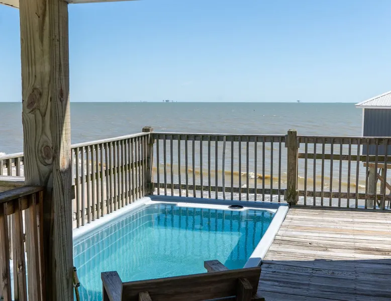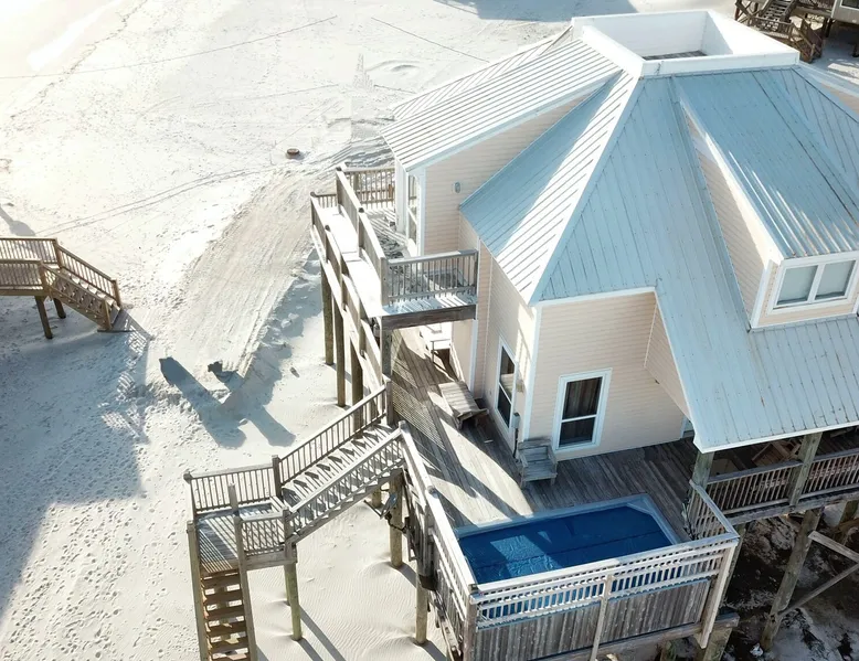 Kowabunga is a great Dauphin Island Beach house with many amenities, including a small, private heated dipping pool, a Game Room, roof-top deck and great Gulf Beach location. No wonder it's one of our most popular Dauphin Island beach rentals! This pet-friendly Gulf-side elevated beach house sits just one house back from the Gulf, and so it has tremendous views! The rooftop crow's nest offers a panoramic view of the island. This home also has a small Game Room, which is great for those times that the weather isn't cooperating! The game room is also the 4th bedroom that has a sleeper sofa and a bunk bed. This elevated, two-story home has a Master Suite on the first level with a private full bath. There is also a half-bath off the kitchen. The Great Room is large, open, and has a flat-screen TV over the fireplace. The Second Level has three bedrooms, two of which share a ""Jack and Jill"" half bathroom with shower. There is a third, full bathroom on this level, and a Game Room (great for night time, or rainy days). The rooftop has a ""Crow's Nest"" which provides panoramic views of the Island. This house may be Pet-friendly, with prior written permission. As with all of our Dauphin Island homes, all linens and towels are provided, WIFI, along with a fully-outfitted kitchen. Everything you need for a great beach vacation is here. Pool is heated October 15 thru April.