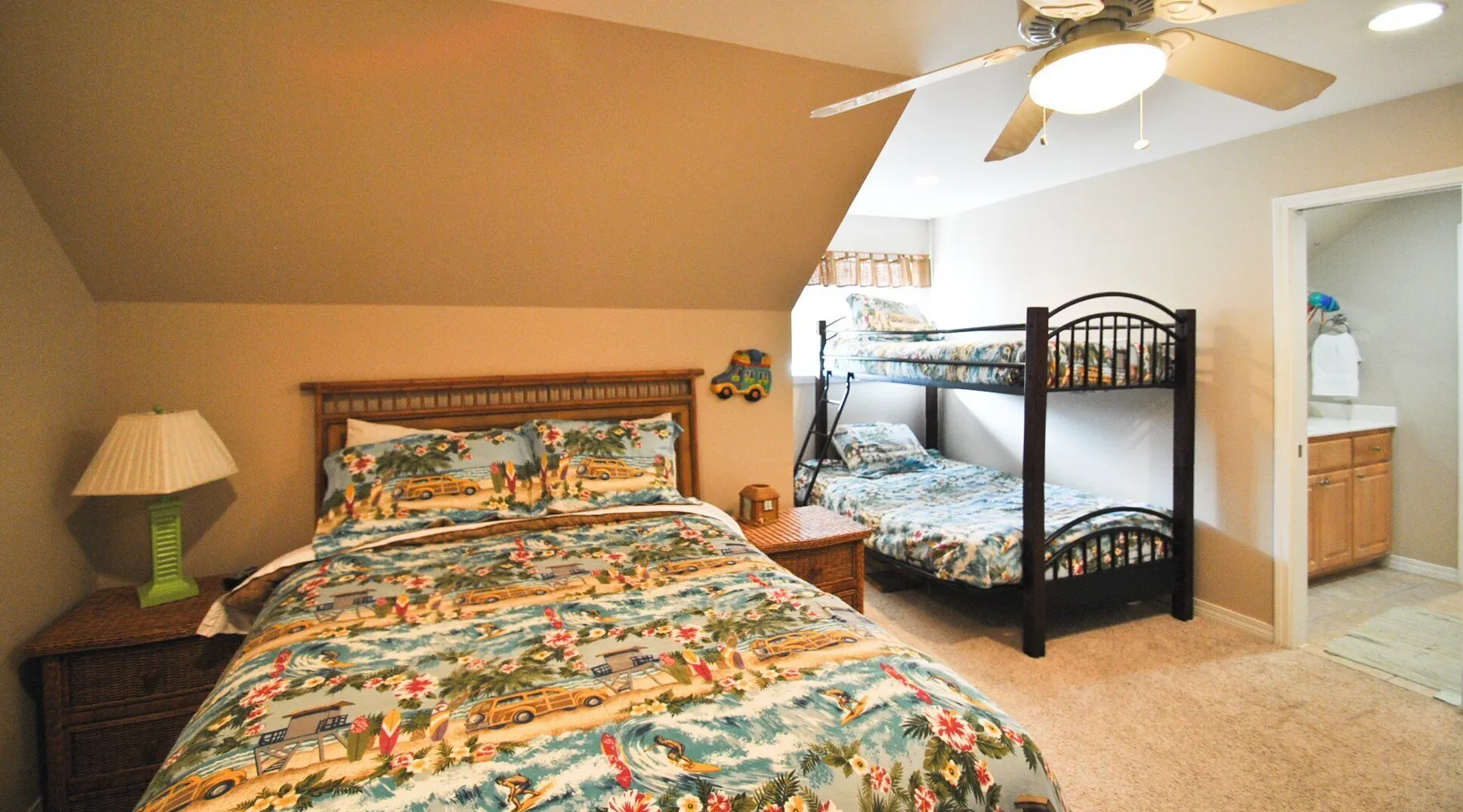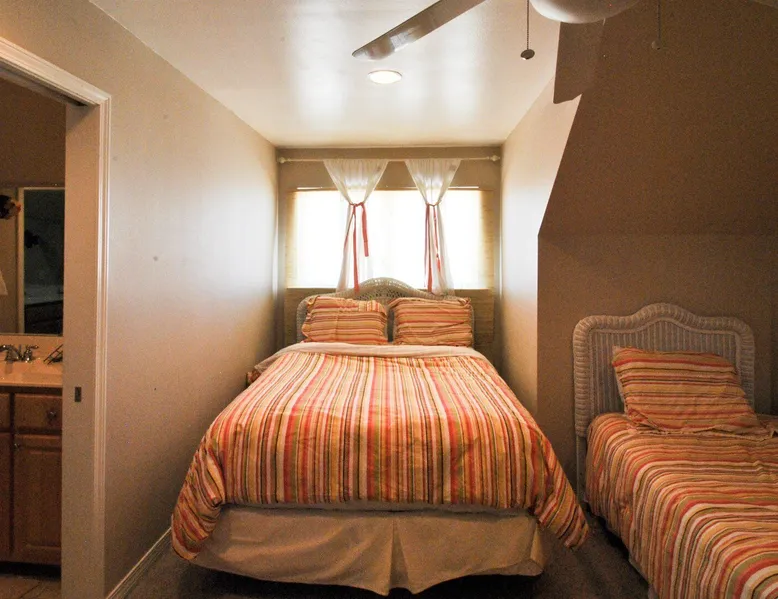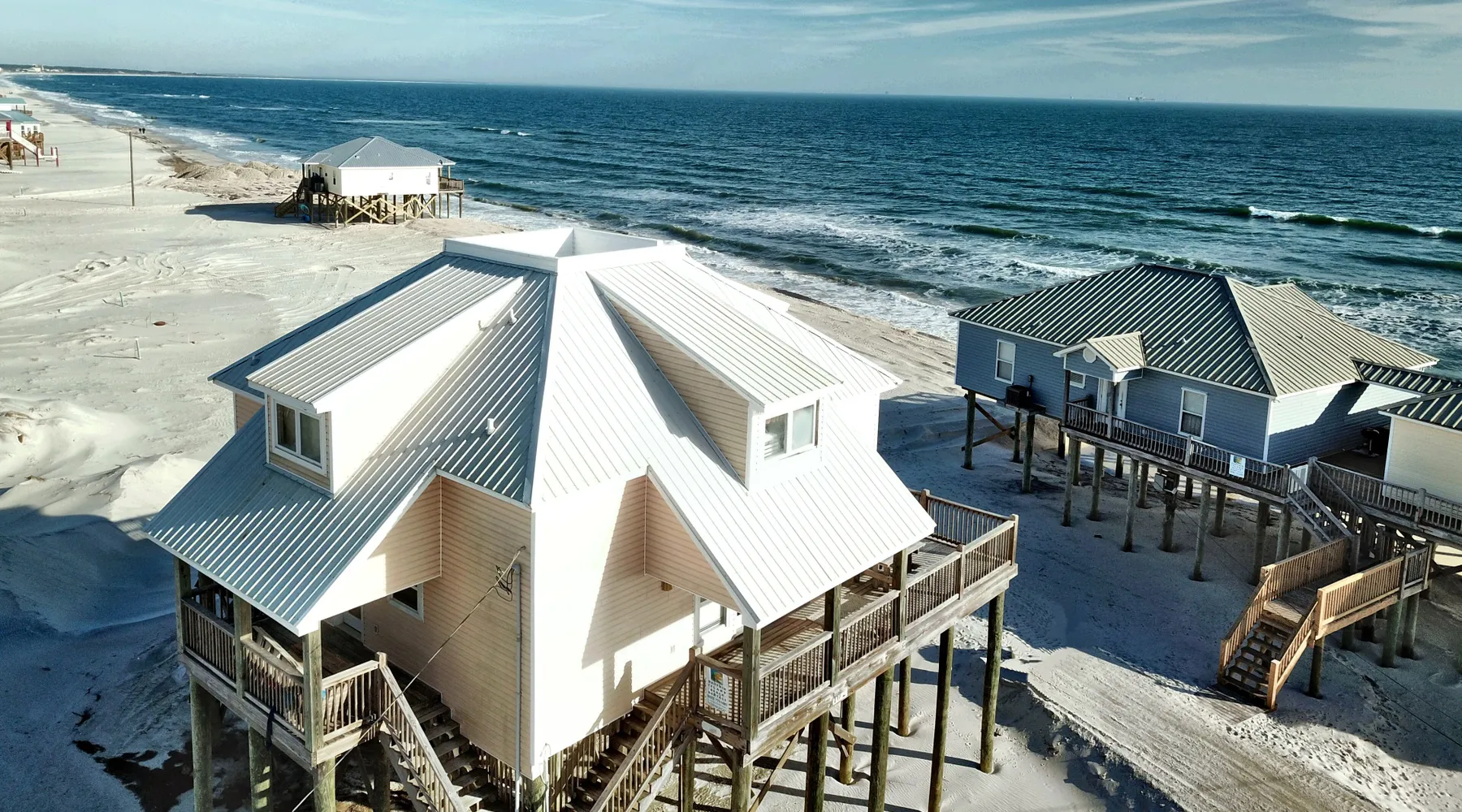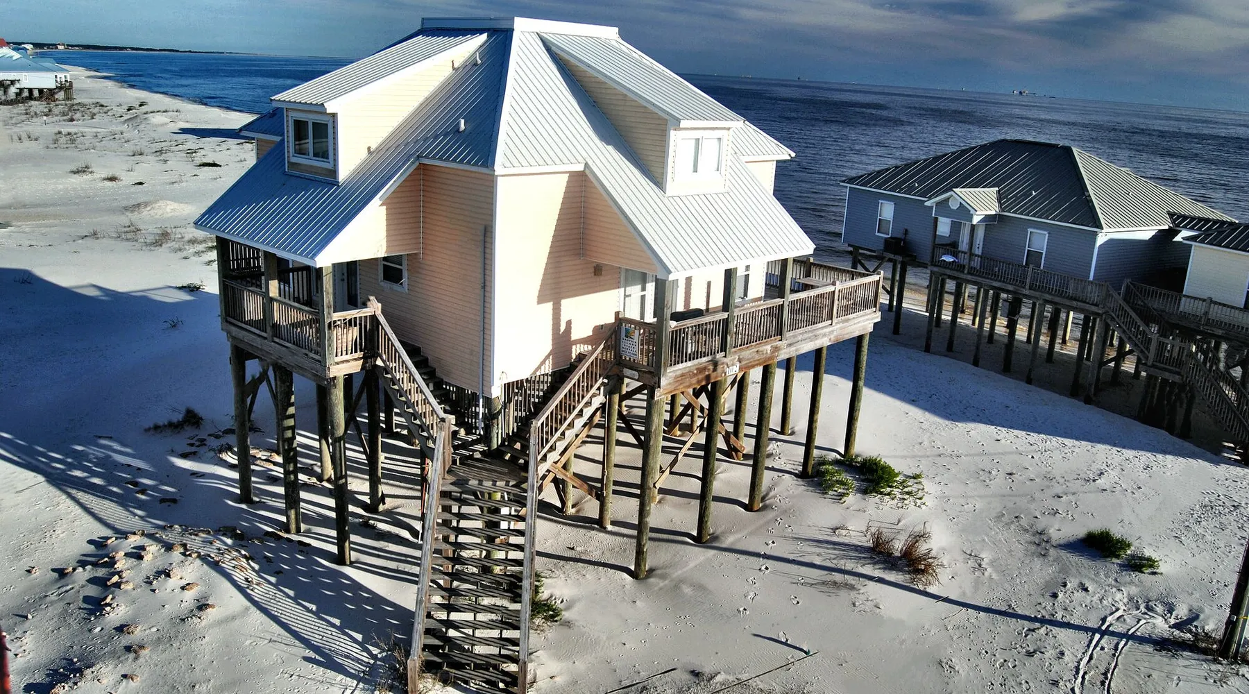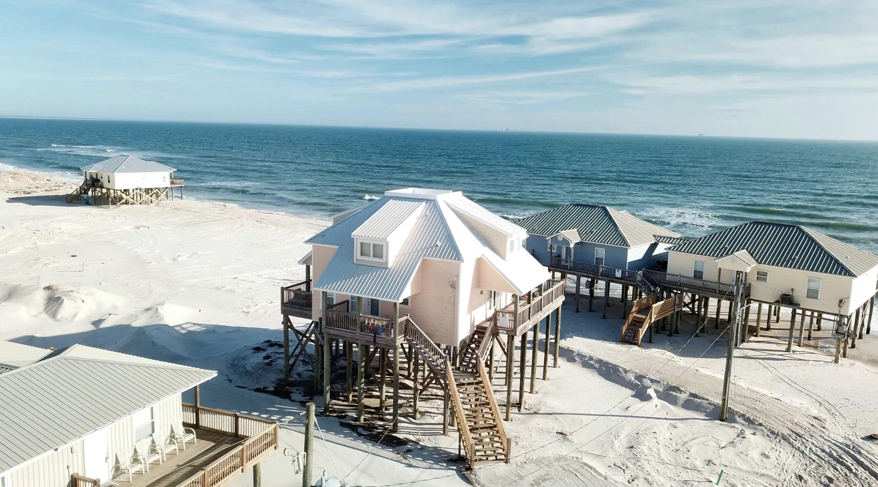 Kowabunga is a great Dauphin Island Beach house with many amenities, including a small, private heated dipping pool, a Game Room, roof-top deck and great Gulf Beach location. No wonder it's one of our most popular Dauphin Island beach rentals! This pet-friendly Gulf-side elevated beach house sits just one house back from the Gulf, and so it has tremendous views! The rooftop crow's nest offers a panoramic view of the island. This home also has a small Game Room, which is great for those times that the weather isn't cooperating! The game room is also the 4th bedroom that has a sleeper sofa and a bunk bed. This elevated, two-story home has a Master Suite on the first level with a private full bath. There is also a half-bath off the kitchen. The Great Room is large, open, and has a flat-screen TV over the fireplace. The Second Level has three bedrooms, two of which share a ""Jack and Jill"" half bathroom with shower. There is a third, full bathroom on this level, and a Game Room (great for night time, or rainy days). The rooftop has a ""Crow's Nest"" which provides panoramic views of the Island. This house may be Pet-friendly, with prior written permission. As with all of our Dauphin Island homes, all linens and towels are provided, WIFI, along with a fully-outfitted kitchen. Everything you need for a great beach vacation is here. Pool is heated October 15 thru April.