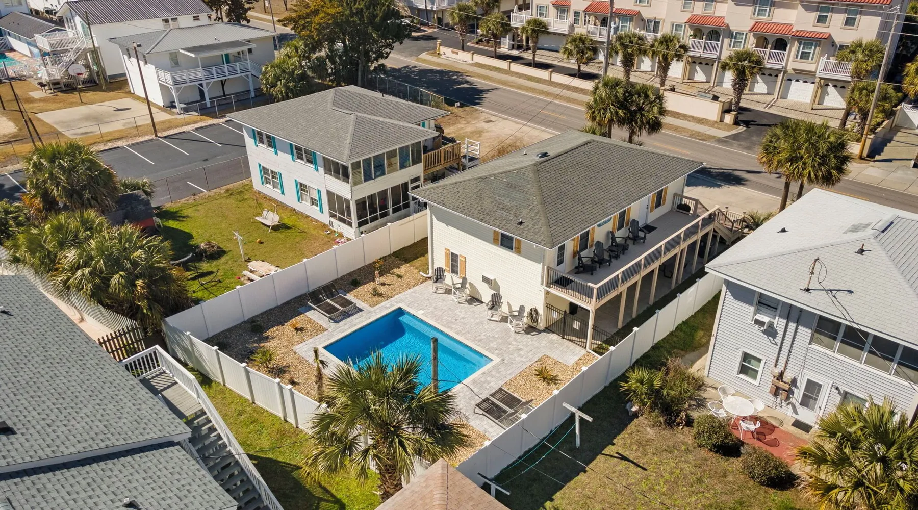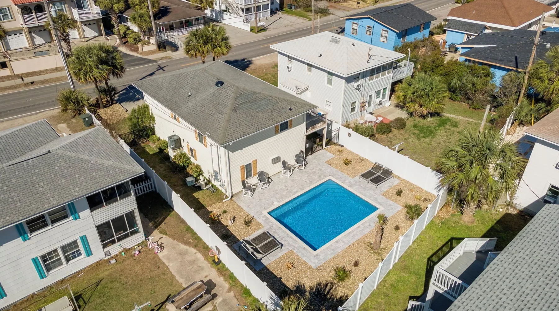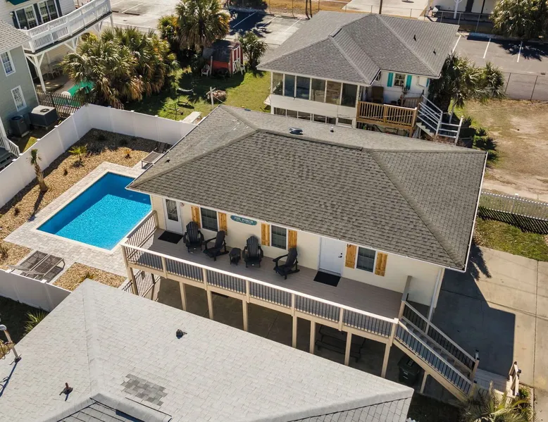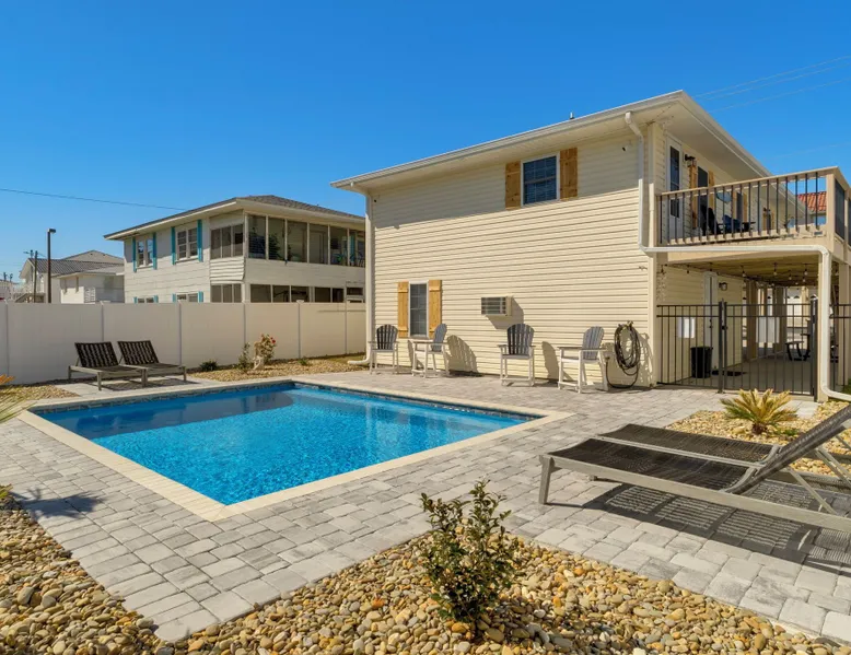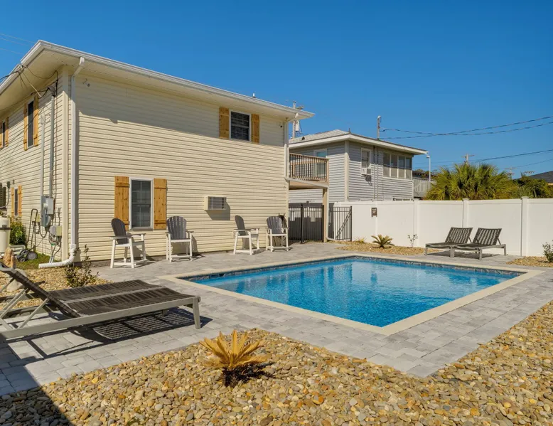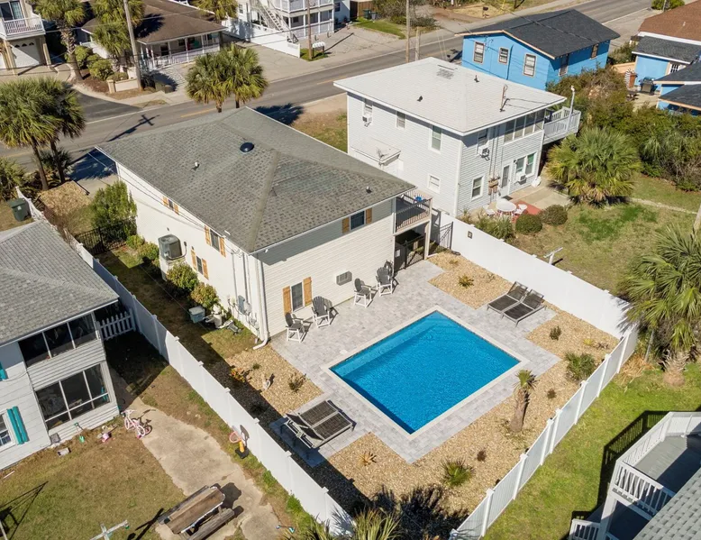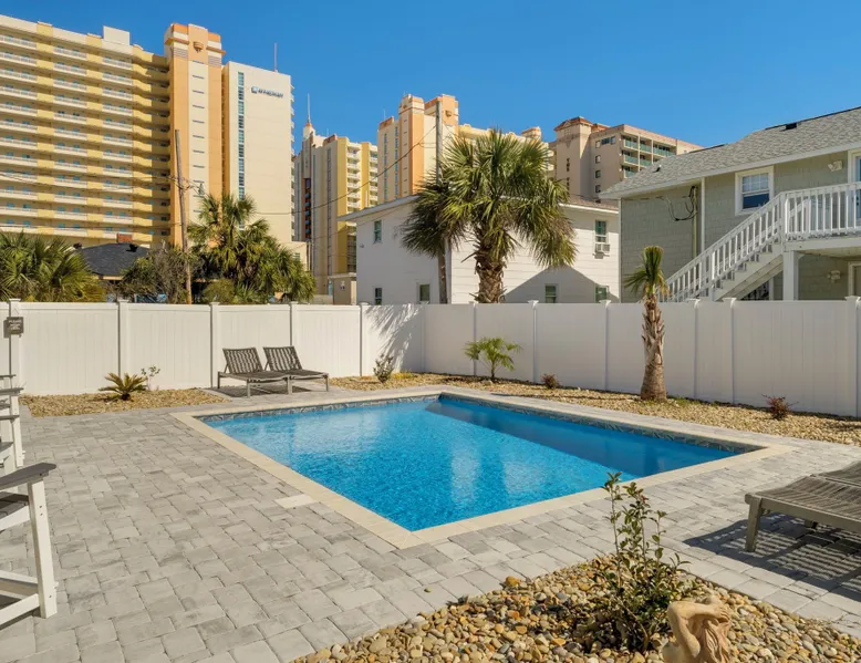 This private beach house, named The Wicked Whale, is only 0.1 miles from the beach and is located in the Ocean Drive section of North Myrtle Beach. This private house is pet friendly, has its own private pool and can accommodate a total of 16 people with 1 king, 1 queen, 2 fulls, 4 twins & 2 sleeper sofas. The main house (on the 2nd floor) has a total of 2 bedrooms and 1.5 bathrooms. This part of the house features a fully equipped kitchen, spacious living room w/1 sleeper sofa, dining area, washer & dryer and large balcony. Bedroom #1 has 1 king and an attached 1/2 bathroom and bedroom #2 has 1 full & 1 twin. The full bathroom is located in the hall. The 2nd part of the house is mother-in-law suite on the ground floor with private entrance. The mother-in-law suite is perfect for older kids who want their own space or guests that have difficulty with too many stairs. The mother-in-law suite is set up like a studio and features a small living room w/ 1 sleeper sofa, a kitchenette, mini fridge, 1 queen size bed and 2 sets of bunk beds (1 set is a twin over twin, the other set is a twin over full). This level also features a full bathroom with garden tub and stand up shower. The over sized lot includes a fenced in yard, private pool, professionally landscaped yard, and seating around the pool. Additional features include free W-Fi, cable TV and parking for multiple vehicles. PET FRIENDLY (DOGS ONLY) WITH $200 NON-REFUNDABLE PET FEE!! The Wicked Whale is only 3 blocks (0.4 miles) from McClean Park which has 2 playgrounds, a baseball field, pond w/fountain, walking trail & picnic gazebos and only 5 blocks (0.5 miles) from Main Street where you can enjoy The Pavilion Arcade & ice cream shop, several restaurants, souvenir & specialty shops and popular shag clubs & beach bars (some places are only open seasonally). During the summer months, there is also a small amusement park set up with rides, food & games. There is also a 1 car garage full of beach equipment for your convenience. Exterior of property is under 24 video surveillance. Free Fun Included Every Day! To enhance your vacation experience, North Beach Vacations has partnered with Xplorie, which means your stay includes over $250.00 in complimentary activities, per day. Just for booking with us, you’ll receive free tickets, every day of your stay to top activities like golfing, water parks, dinner shows, and more!!! ***ONLY VALID FOR SHORT TERM STAYS 27 NIGHTS OR LESS*** MOTORCYCLES, TRAILERS BOATS, RV'S, AND GOLF CARTS ARE ALLOWED TO BE PARKED ONSITE! HOWEVER, PARKING IS LIMITED. WE DO OFFER FREE PARKING AT OUR LOCAL RENTAL OFFICE. PARK AT YOUR OWN RISK. NO SMOKING! PETS ARE WELCOME (DOGS ONLY) WITH $200 NON-REFUNDABLE PET FEE! 25 YEAR AGE REQUIRMENT! FOR ALL NON-FAMILY GROUPS, EVERYONE MUST MEET THIS AGE REQUIRMENT AT THE TIME OF CHECK-IN!