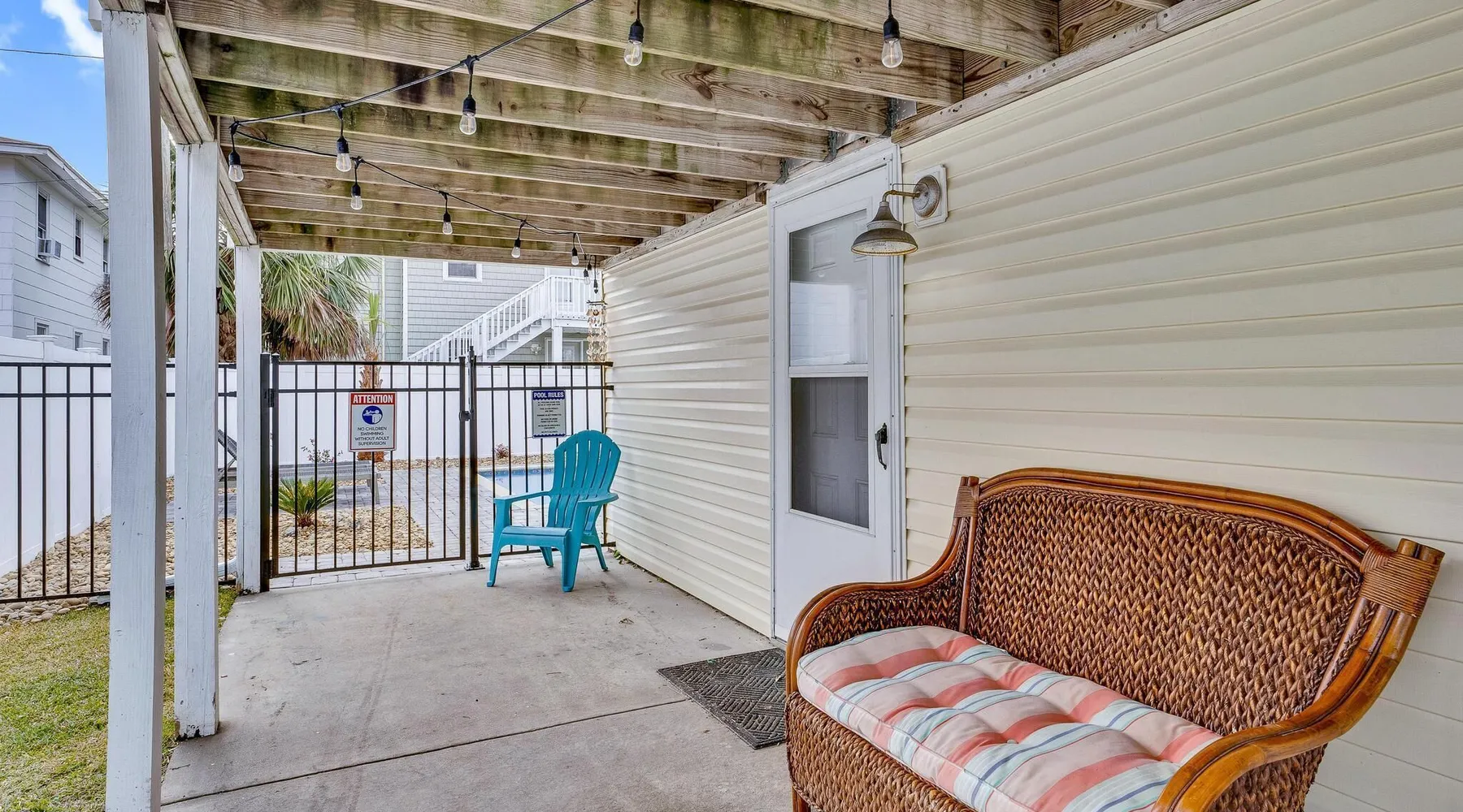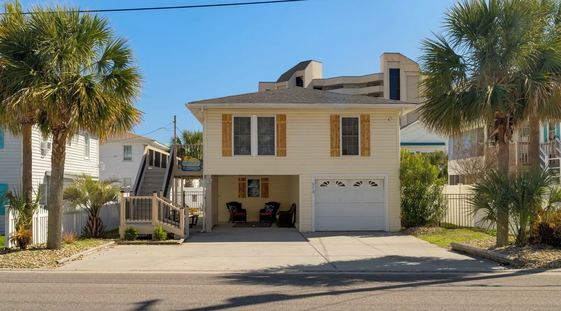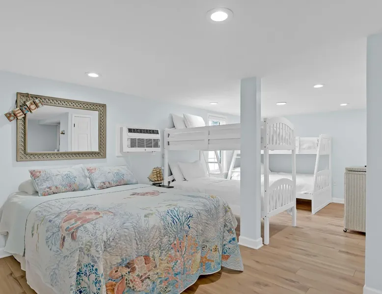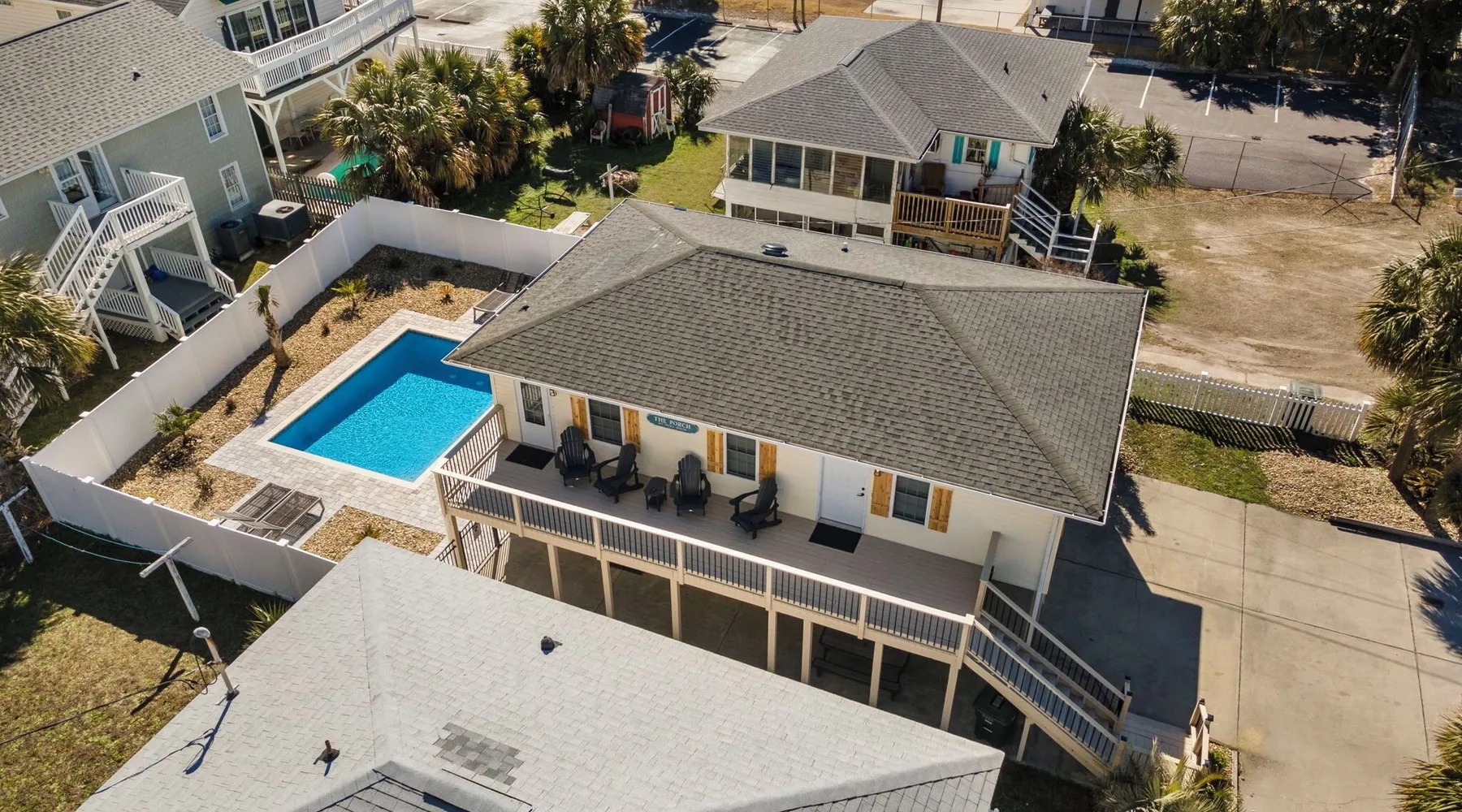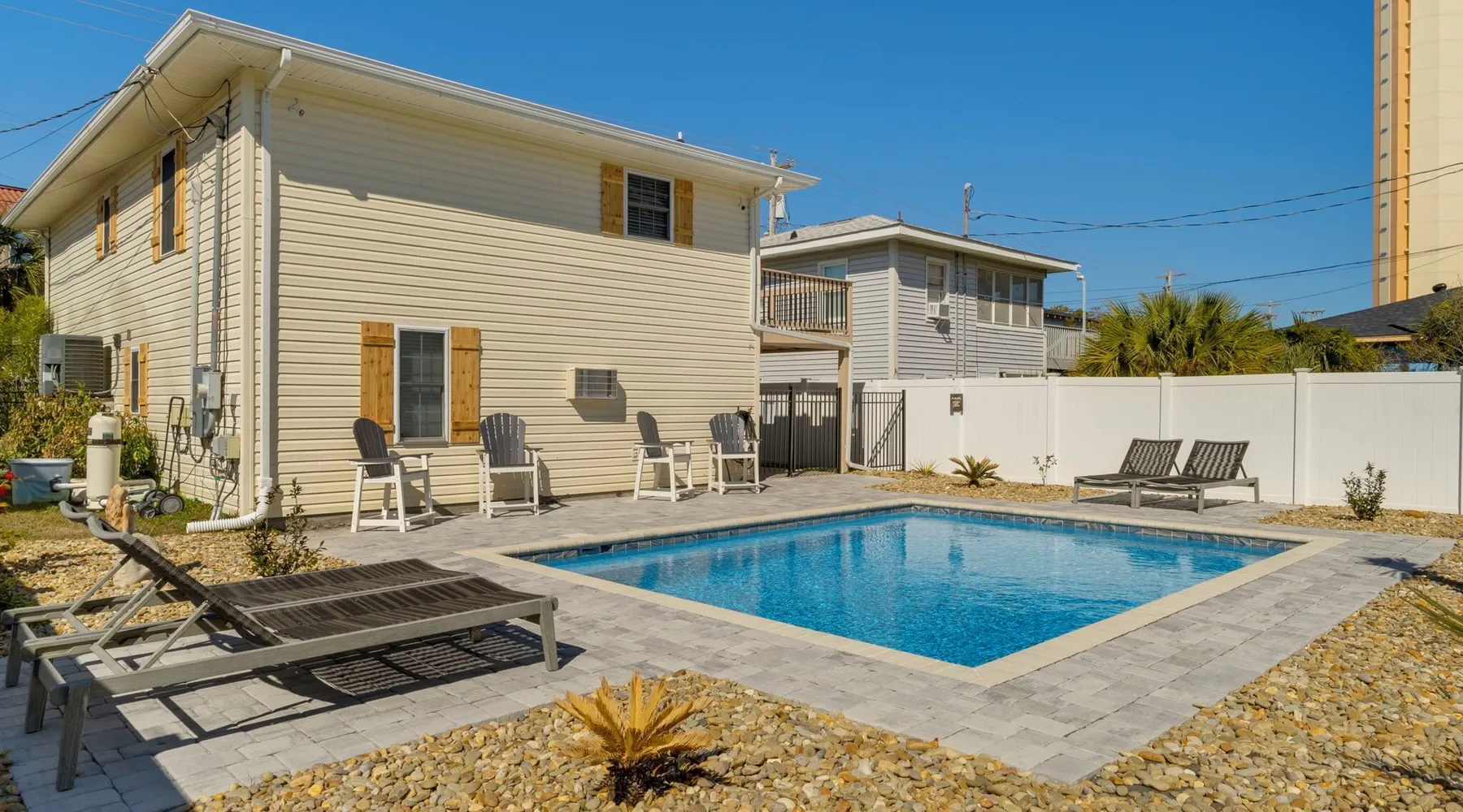 This private beach house, named The Wicked Whale, is only 0.1 miles from the beach and is located in the Ocean Drive section of North Myrtle Beach. This private house is pet friendly, has its own private pool and can accommodate a total of 16 people with 1 king, 1 queen, 2 fulls, 4 twins & 2 sleeper sofas. The main house (on the 2nd floor) has a total of 2 bedrooms and 1.5 bathrooms. This part of the house features a fully equipped kitchen, spacious living room w/1 sleeper sofa, dining area, washer & dryer and large balcony. Bedroom #1 has 1 king and an attached 1/2 bathroom and bedroom #2 has 1 full & 1 twin. The full bathroom is located in the hall. The 2nd part of the house is mother-in-law suite on the ground floor with private entrance. The mother-in-law suite is perfect for older kids who want their own space or guests that have difficulty with too many stairs. The mother-in-law suite is set up like a studio and features a small living room w/ 1 sleeper sofa, a kitchenette, mini fridge, 1 queen size bed and 2 sets of bunk beds (1 set is a twin over twin, the other set is a twin over full). This level also features a full bathroom with garden tub and stand up shower. The over sized lot includes a fenced in yard, private pool, professionally landscaped yard, and seating around the pool. Additional features include free W-Fi, cable TV and parking for multiple vehicles. PET FRIENDLY (DOGS ONLY) WITH $200 NON-REFUNDABLE PET FEE!! The Wicked Whale is only 3 blocks (0.4 miles) from McClean Park which has 2 playgrounds, a baseball field, pond w/fountain, walking trail & picnic gazebos and only 5 blocks (0.5 miles) from Main Street where you can enjoy The Pavilion Arcade & ice cream shop, several restaurants, souvenir & specialty shops and popular shag clubs & beach bars (some places are only open seasonally). During the summer months, there is also a small amusement park set up with rides, food & games. There is also a 1 car garage full of beach equipment for your convenience. Exterior of property is under 24 video surveillance. Free Fun Included Every Day! To enhance your vacation experience, North Beach Vacations has partnered with Xplorie, which means your stay includes over $250.00 in complimentary activities, per day. Just for booking with us, you’ll receive free tickets, every day of your stay to top activities like golfing, water parks, dinner shows, and more!!! ***ONLY VALID FOR SHORT TERM STAYS 27 NIGHTS OR LESS*** MOTORCYCLES, TRAILERS BOATS, RV'S, AND GOLF CARTS ARE ALLOWED TO BE PARKED ONSITE! HOWEVER, PARKING IS LIMITED. WE DO OFFER FREE PARKING AT OUR LOCAL RENTAL OFFICE. PARK AT YOUR OWN RISK. NO SMOKING! PETS ARE WELCOME (DOGS ONLY) WITH $200 NON-REFUNDABLE PET FEE! 25 YEAR AGE REQUIRMENT! FOR ALL NON-FAMILY GROUPS, EVERYONE MUST MEET THIS AGE REQUIRMENT AT THE TIME OF CHECK-IN!