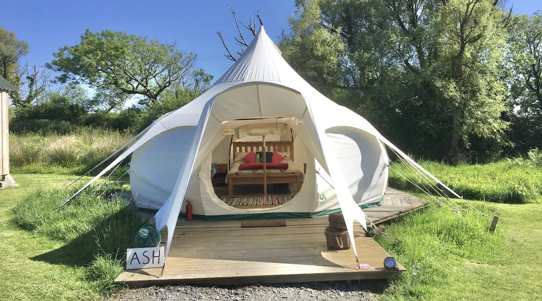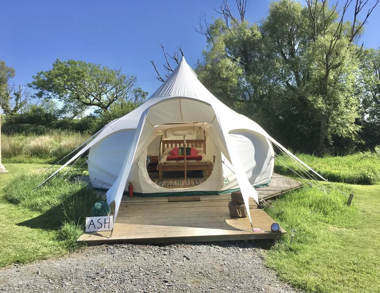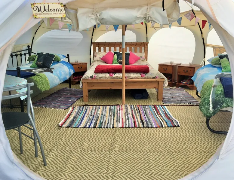You will find Cheglinch Farm tucked away in a sheltered field on a family run dairy farm, in picturesque North Devon. Nestled in the countryside, it is a perfect place to get away from it all, relax and connect with nature. The space You will find Cheglinch Farm tucked away in a sheltered field on a family run dairy farm, in picturesque North Devon. Nestled in the countryside, it is a perfect place to get away from it all, relax and connect with nature. You may be lucky enough to meet the local pheasant family, visiting deer and owls. In addition, the small areas of marshland, within the eco-friendly field, are fabulous at attracting many different species of birds and insects. Within a 10-20 minute drive you will be on the doorsteps of the incredible beaches at Woolacombe, Saunton, Croyde and Ilfracombe. Any beach enthusiast will surely find a pleasurable day, whether it be surfing or sunbathing! The Belle Tent is set on a wooden standing within their own distinct area in a 4 acre field. The tent will comfortably sleep 4 on proper beds and mattresses (1 double, 2 singles) made up ready for your arrival. Children will love the cow themed duvet covers! There is room for an additional child on a smaller, pull out mattress but please bring your own bedding (if you wish to bring your own small inflatable bed and bedding instead you can do so). A modern wood burning stove found just outside the tent will keep you warm on colder evenings, but is also useful for cooking. Fairy lights and battery powered tea lights within the tent provide the perfect tranquil lighting for a relaxing stay. You have access to your own covered outdoor kitchen area equipped with a gas barbecue, as well as cooking equipment and crockery. An outdoor seating area is also provided. Those wanting a more authentic camping experience will enjoy the fire pit provided, perfect for toasting marshmallows! There is no electric provision within the tent allowing you to switch off from the outside world, although electricity is available in the play barn if you really can’t leave your mobile behind! Strictly NO PETS. Other things to note Optional services: - Towels: Price: 4.5 £ per booking. - Extra Beds: Price: 10 £ per booking. - Accidental damage cover: Price: 9 £ per booking. - Cot/Crib: Price: included in the booking.