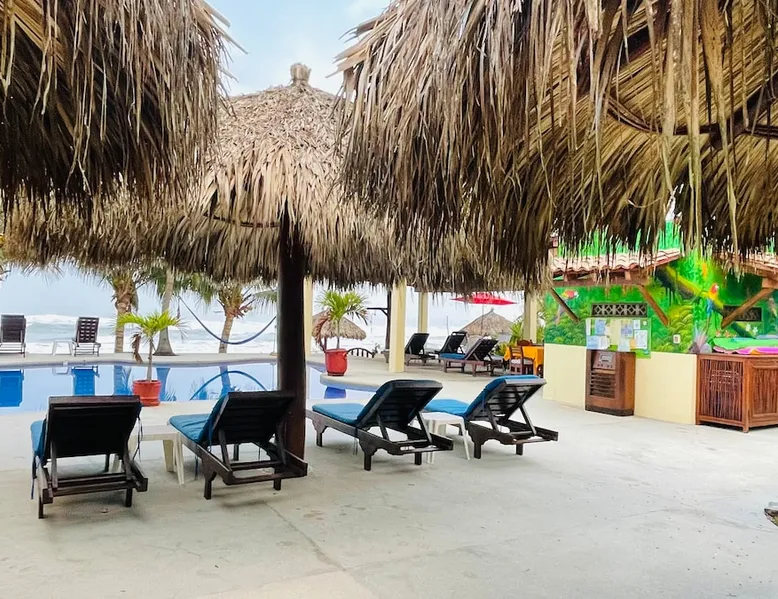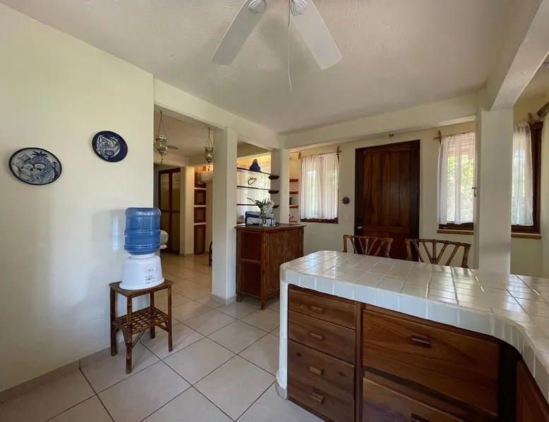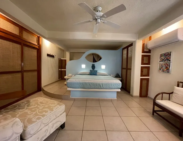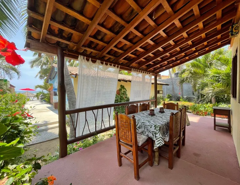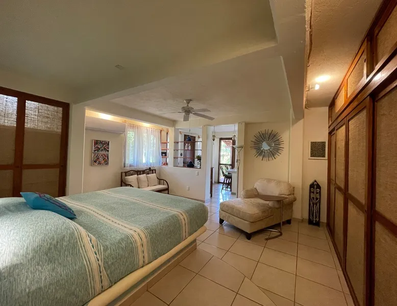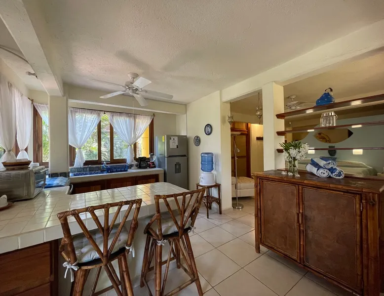 Sol de Agua is a ground floor studio that has a king bed, bathroom, lots of closet space and a full kitchen. We can add a single bed for a small additional fee. Air conditioning and a large front porch for your morning coffee and dining. Maid service and purified water included. Quinto Sol Troncones is in the best location with a rock free beach and walking distance to many food/liquor stores, clothing boutiques, live music and 20+restaurants. The space Quinto Sol Troncones is in the best location with a rock free beach and walking distance to many food/liquor stores, clothing boutiques, live music and 20+restaurants. Parking available on site. Guest access Parking is available on site but not gated in. Other things to note Casa Quinto Sol is three houses divided into five suites spread out over 2400 sqm or 1/2 a acre. We can combine suites for larger groups with 6 bedrooms and 8-11 beds which will accommodate up to 17 people. Beachfront, huge pool, private beach palapas, plenty of lounge chairs and dining tables to keep everyone comfortable. We are dog friendly but no dog is allowed in the pool, on the furniture , no excessive barking or bothering other guests.