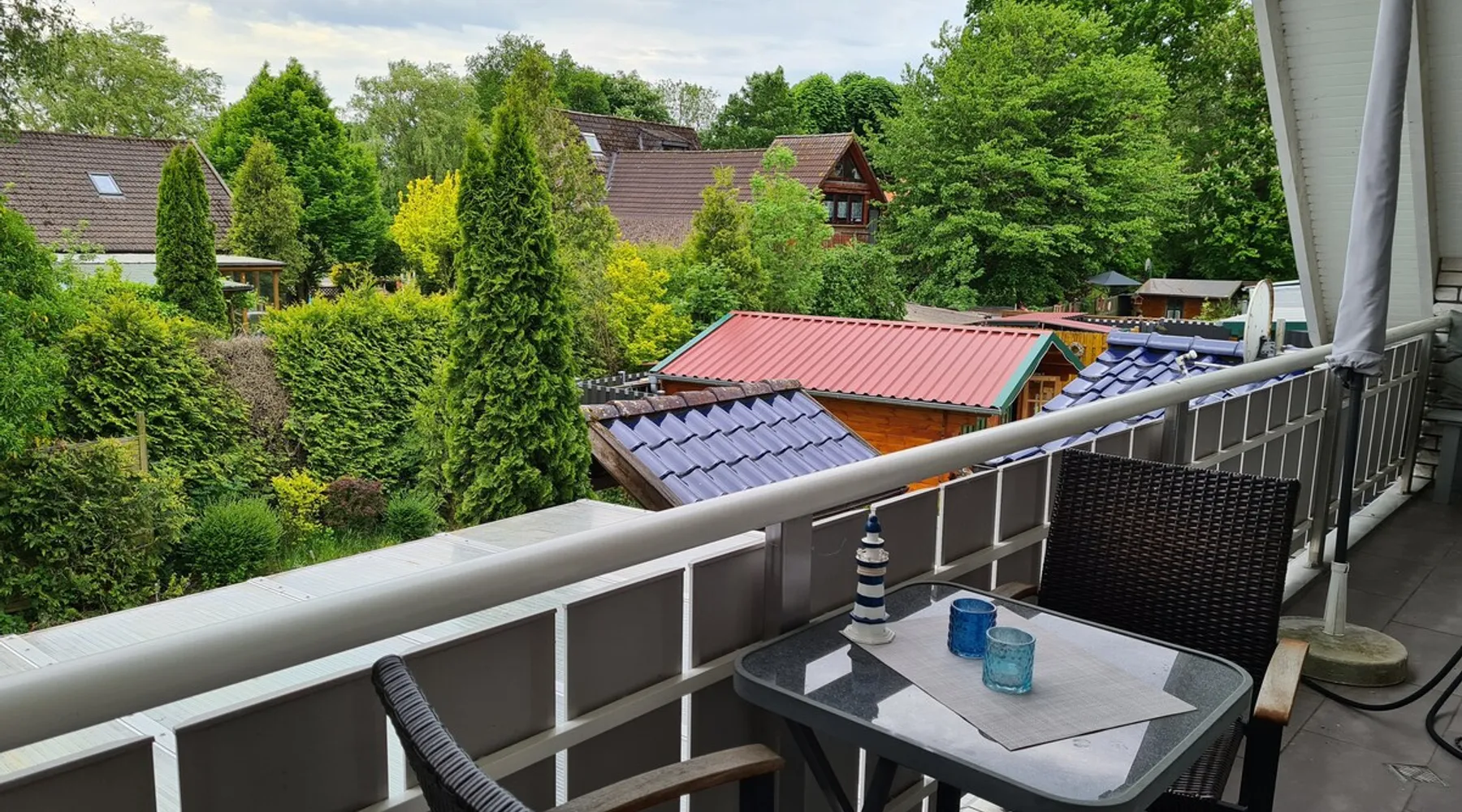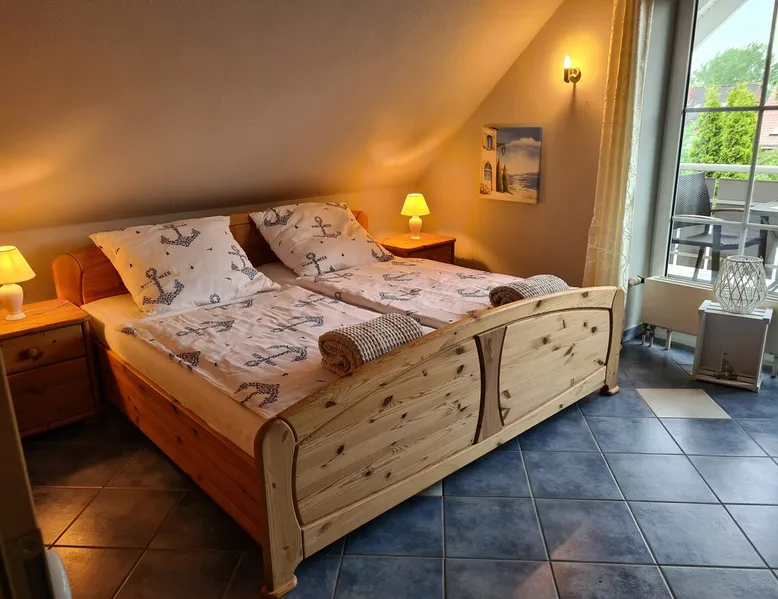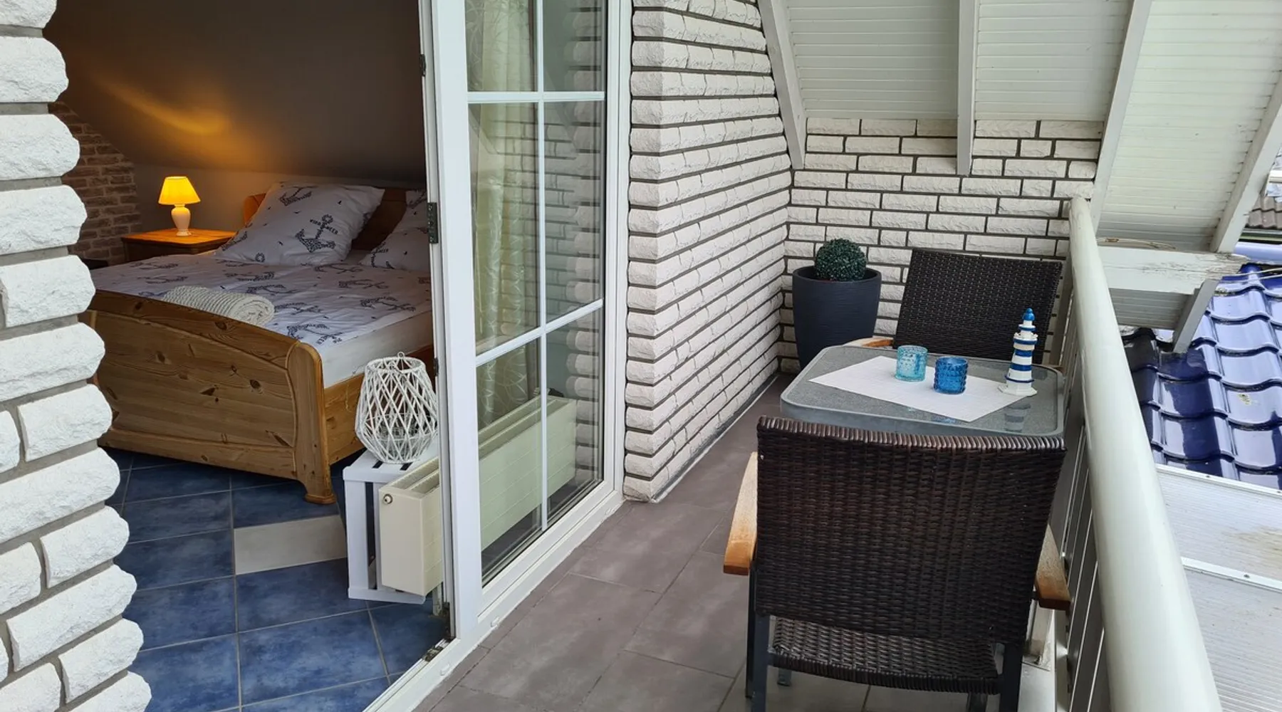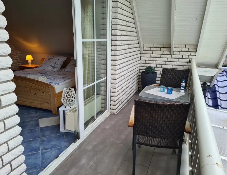 On the upper floor of our single-family house, we have lovingly created a small oasis of well-being. Relax with us, whether you're on a short vacation or a business traveler or fitter. Your 53 square meter apartment includes a kitchen with dining area, as well as a 2m x 2m bed and a private bathroom with shower. In addition, a bedroom with a 1.20 m wide bed. Upon arrival, you can park right in front of the house. The bed is already made and towels are ready. We look forward to seeing you soon. The space The modern furnished apartment has a beautiful balcony overlooking the countryside, where you can have a wonderful breakfast or end the day with a glass of wine or a Jever Pils. Quiet location. Guest access Access to the apartment is directly at the side entrance. The stairs lead to the upper floor where the apartment with balcony is located.