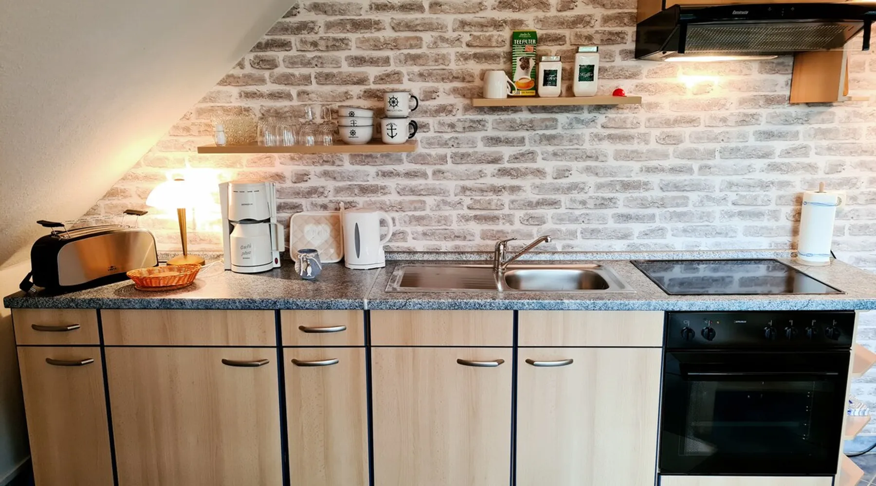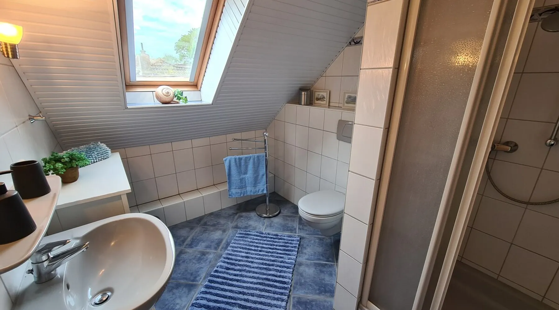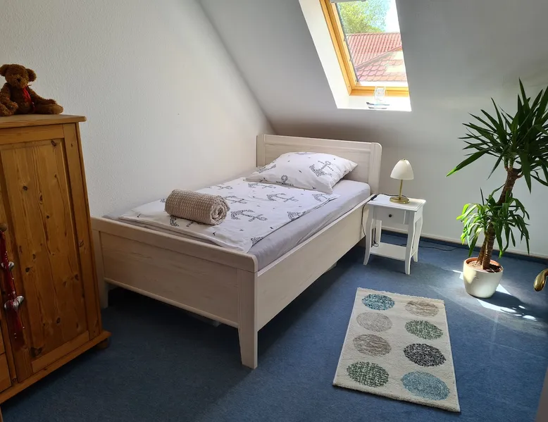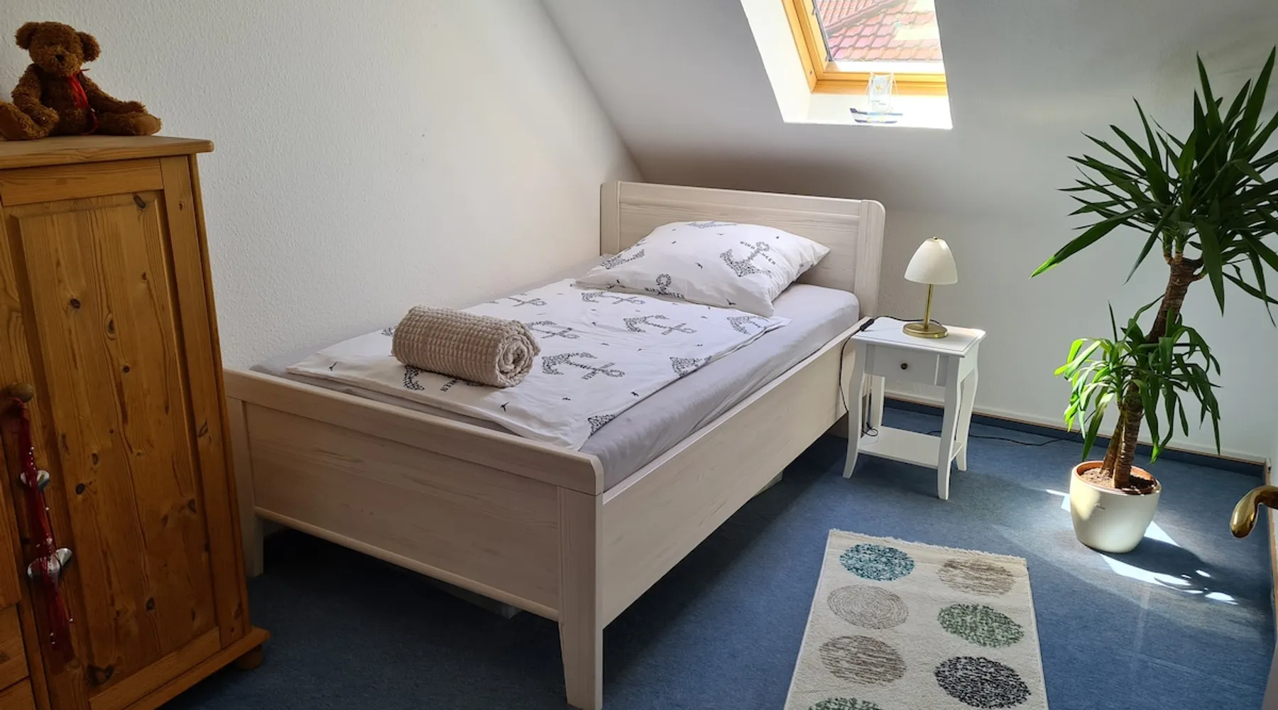 On the upper floor of our single-family house, we have lovingly created a small oasis of well-being. Relax with us, whether you're on a short vacation or a business traveler or fitter. Your 53 square meter apartment includes a kitchen with dining area, as well as a 2m x 2m bed and a private bathroom with shower. In addition, a bedroom with a 1.20 m wide bed. Upon arrival, you can park right in front of the house. The bed is already made and towels are ready. We look forward to seeing you soon. The space The modern furnished apartment has a beautiful balcony overlooking the countryside, where you can have a wonderful breakfast or end the day with a glass of wine or a Jever Pils. Quiet location. Guest access Access to the apartment is directly at the side entrance. The stairs lead to the upper floor where the apartment with balcony is located.