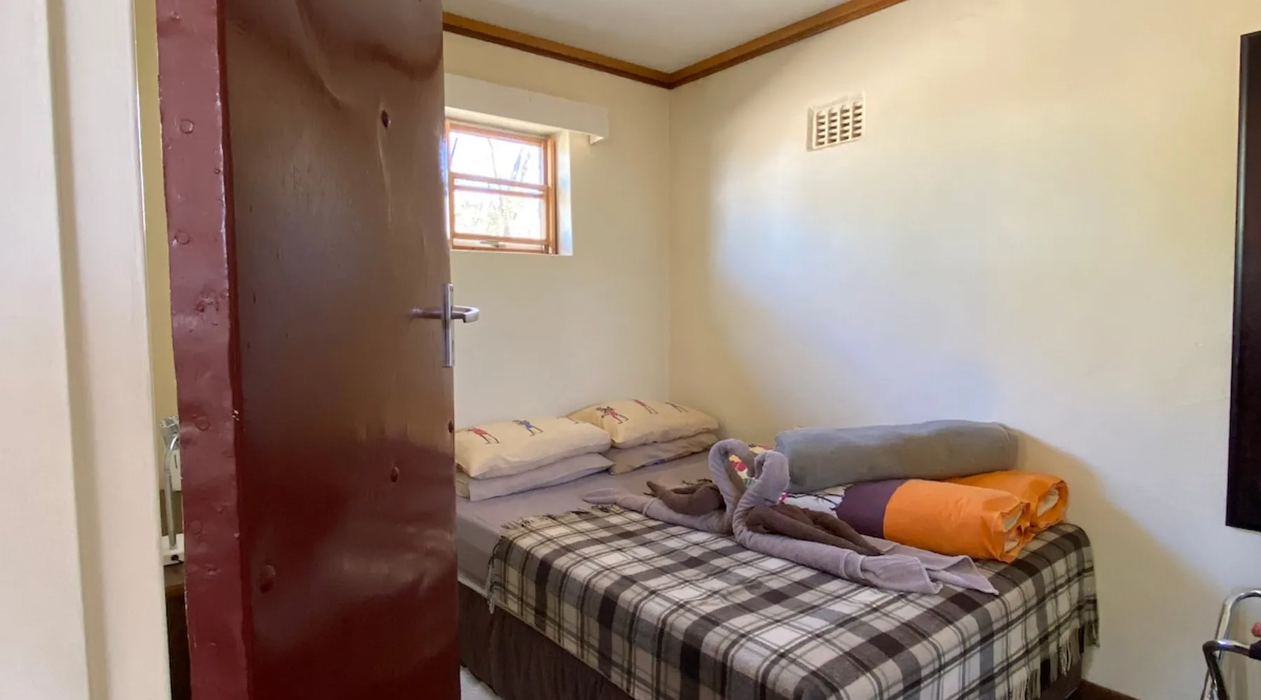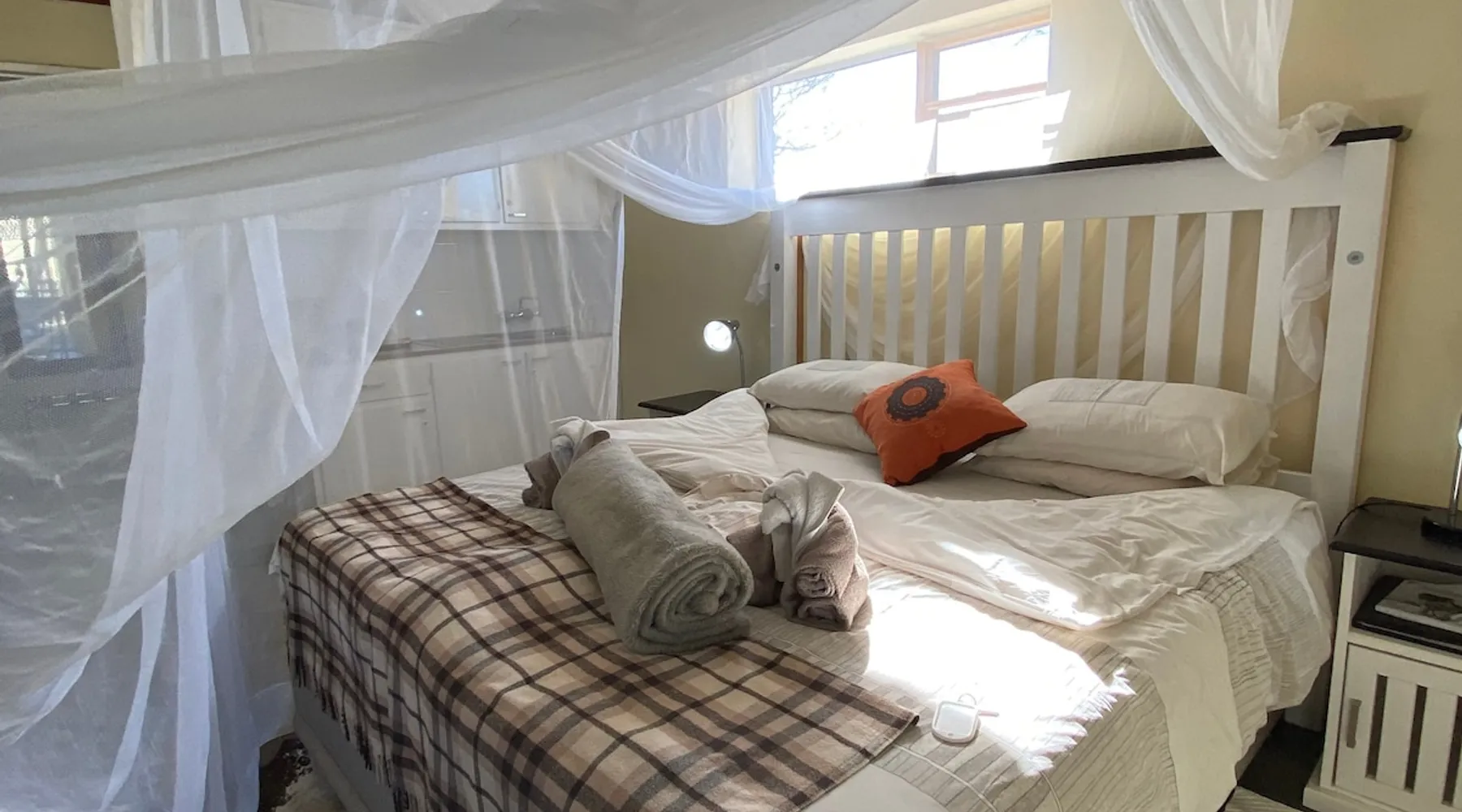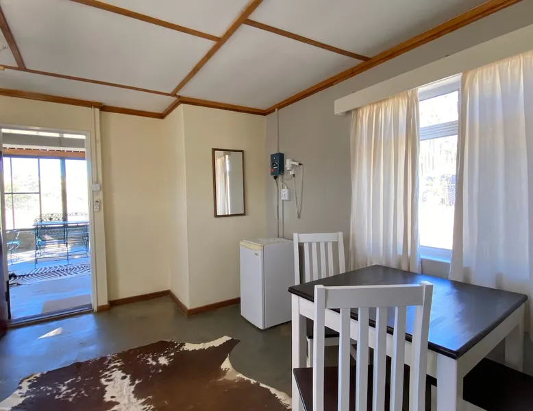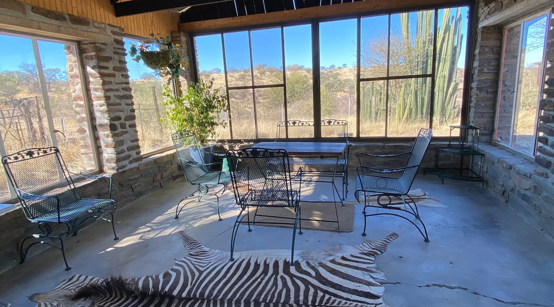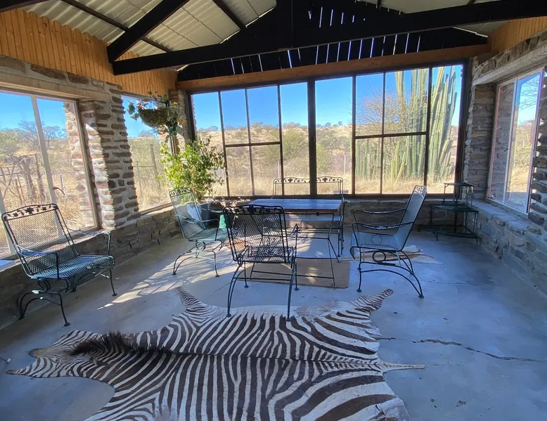 Düsternbrook Guest Lodge (Farm) is family run and the oldest guest farm in Namibia (1961). The ranch is 14 000 ha and has abundant, typical savannah game: giraffe, oryx, kudu,….15 different species. Different accommodation (star) with DBB and activities: cheetah and leopard drive, game drive, scenic mountain drive and safari horse riding. On site a Pool and Restaurant: limited a la carte. Hiking trails: 1 hr to 5 hr. We are close to Windhoek, 50 km and Int. Airport, 90 km. Transfer offered. The space The old farm house is built in 1908 from natural stone and has been carefully renovated to keep the flair of by-gone times. There is the main farm house for breakfast and dinner and two typical African thatch roof lapas which serve also as restaurant depending on winter or summer. All the accommodation rooms are spread in the yard in different separate buildings or single houses and a walking distance to the main house and reception. Our reception is centrally situated and apart from check-in and check-out we offer here, our water adapted coffee brand, cappuccino and other drinks, as well sitting possibilities and Wi-Fi. All the activities start from here. Dama house is a single building, existing out of 3 rooms. We call it our 3 star level family accommodation with a spacious main bedroom ( 25 sqm), a king-size bed ( one matrass). Another, smaller room, is next door with a queen size bed. Both rooms share the en-suite bathroom: walk-in shower, toilet and washbasin, hot and cold water. Furthermore: air condition, a mini-bar, a coffee/tea station, a desk, hair dryer, a zinc and a safe. As common meeting point the closed terrasse, with big windows, offers a sitting corner and a view on the mountains, and another toilet. Outside it has its own a barbeque area. The distance to its own parking is 20 m and the building is in reach of a Wi-Fi Antenna. The main house and pool is about 100 m and the reception is 80 m away. Guest access Guests can access all public areas: breakfast room and dining room in the main house, dining room in the closed and open african thatch roof lapa ( lapa = place to eat), the reception area: for drinks, Wi-Fi and as arrival and departure spot also for the different activties, the swimming pool and walk around the house to enjoy the view into nature. They can move around the yard look at the stables or go for a lovely hike in the nature or book a seat on one of our activities. During your stay My reception is available for help the full day from 8am until 18pm. I am mostly there but not always. Mostly I come around at dinner otherwise ask my reception if very urgent. Other things to note This farm is not suited just as a stop over i.e. arrive late and leave early. From feed back of other guests they often said ïf we would have known we would have spent here more days as you can really relax and enjoy the nature while participation on our different activities offered apart from the quietness. There is much to do and you never will be boared. Our location vis-a-vis Windhoek and the international airport is just perfect for arrival to settle in or before departure as a nice place to close off your Namibia trip.